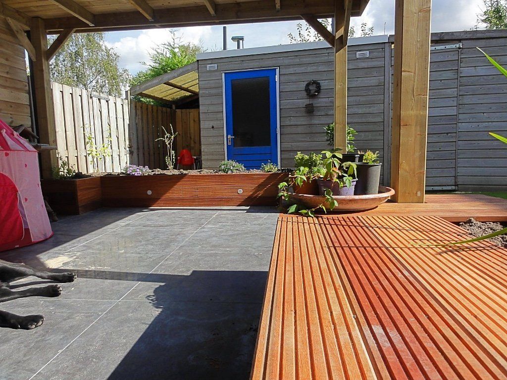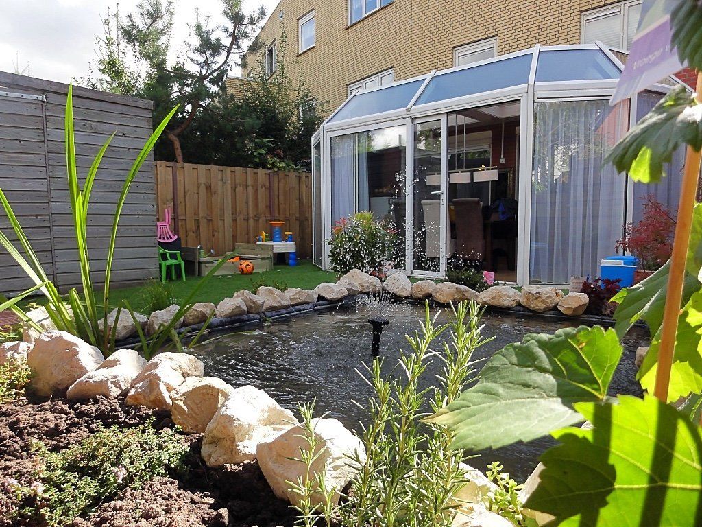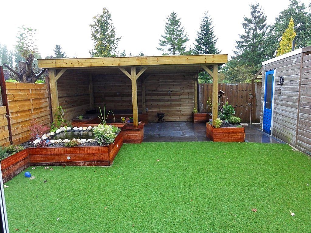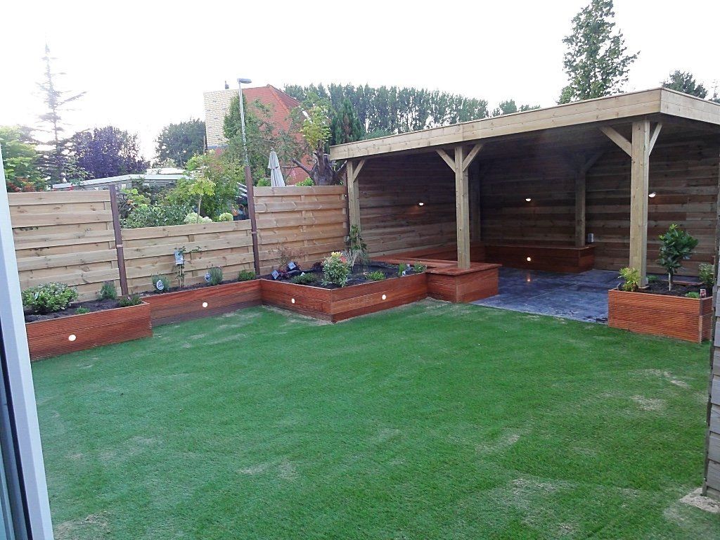 Weer een heerlijk ontwerp gemaakt en een onderhoudsvrije tuin gerealiseerd, eigenlijk hoef je in deze tuin alleen maar te genieten! Een mooie overkapping, met natuursteen als bestrating, hardhouten bankjes en verhoogde borders met verlichting. Kunstgras, wel zo makkelijk! En als extra een leuke waterpartij met een onderwaterspot!