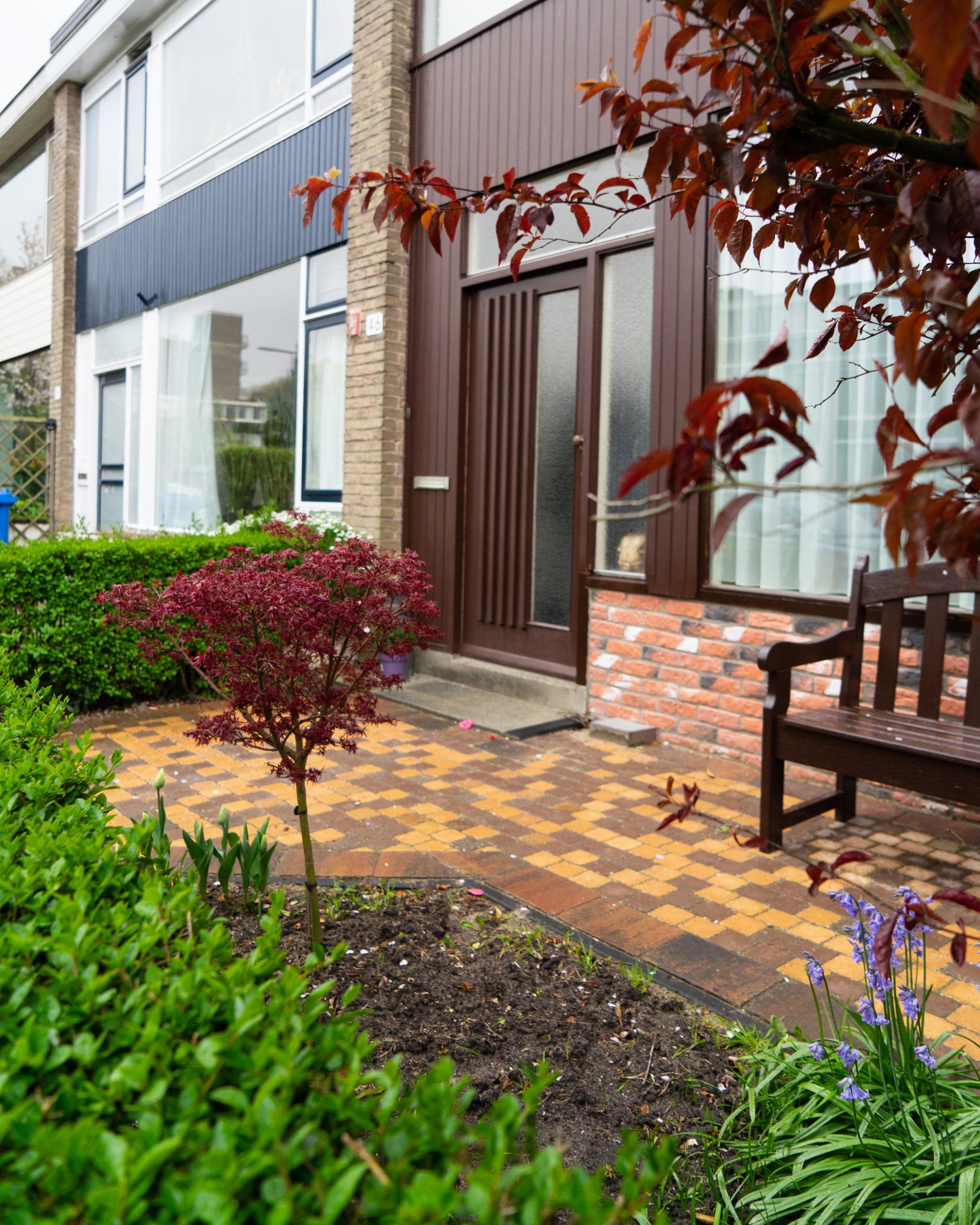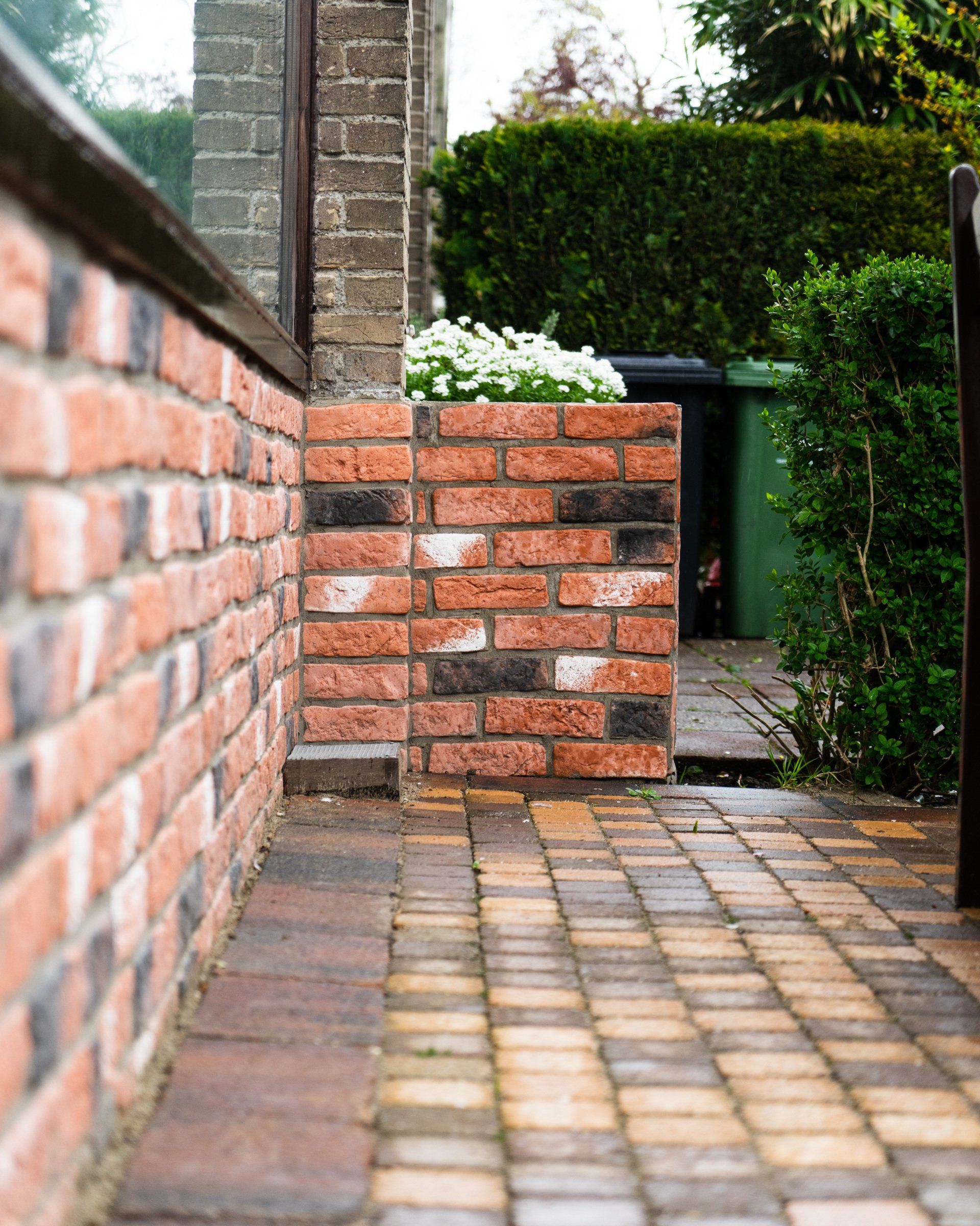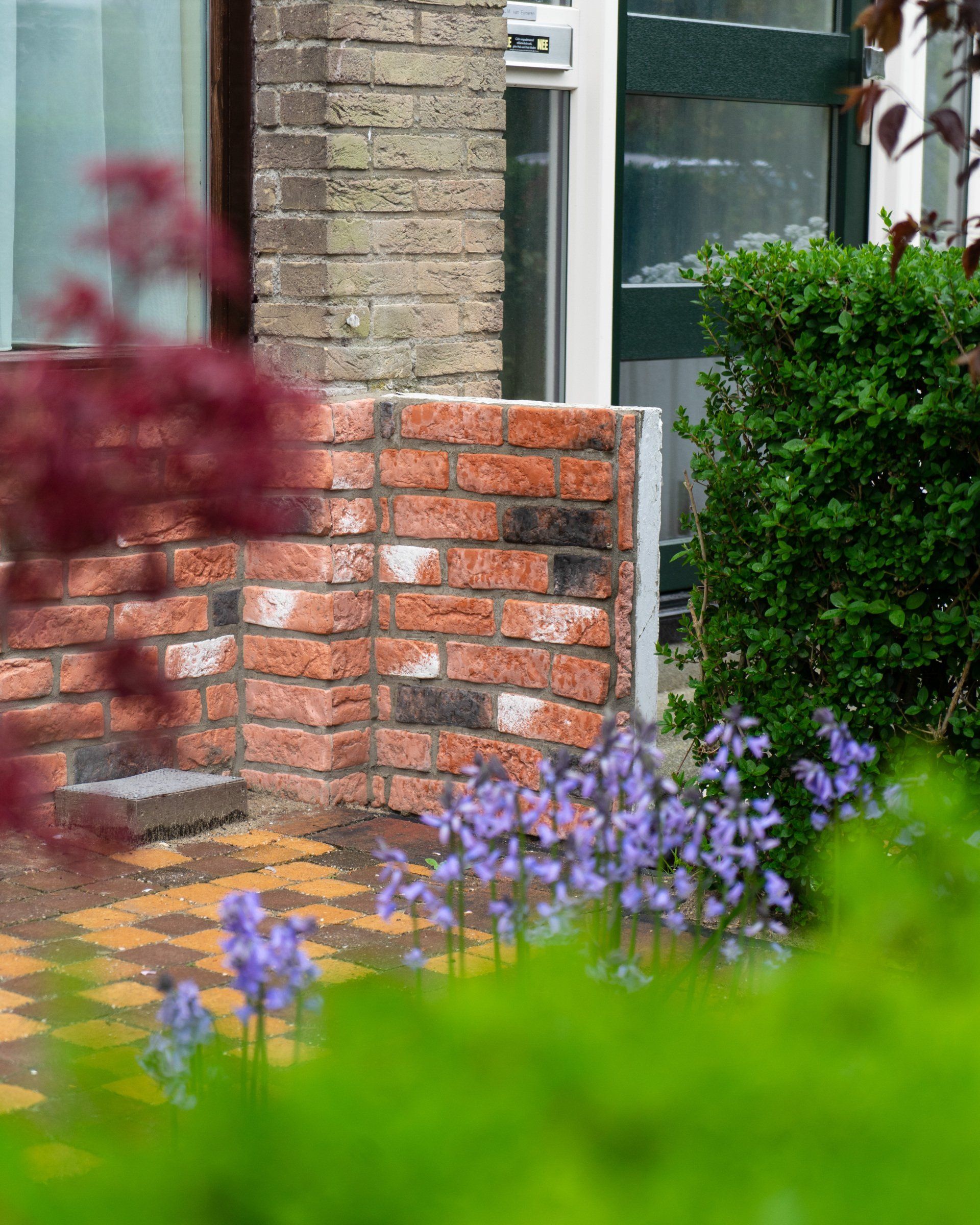 Vrolijke, kleurige voortuin met steenstrips op de muren, en 10x10 als bestrating