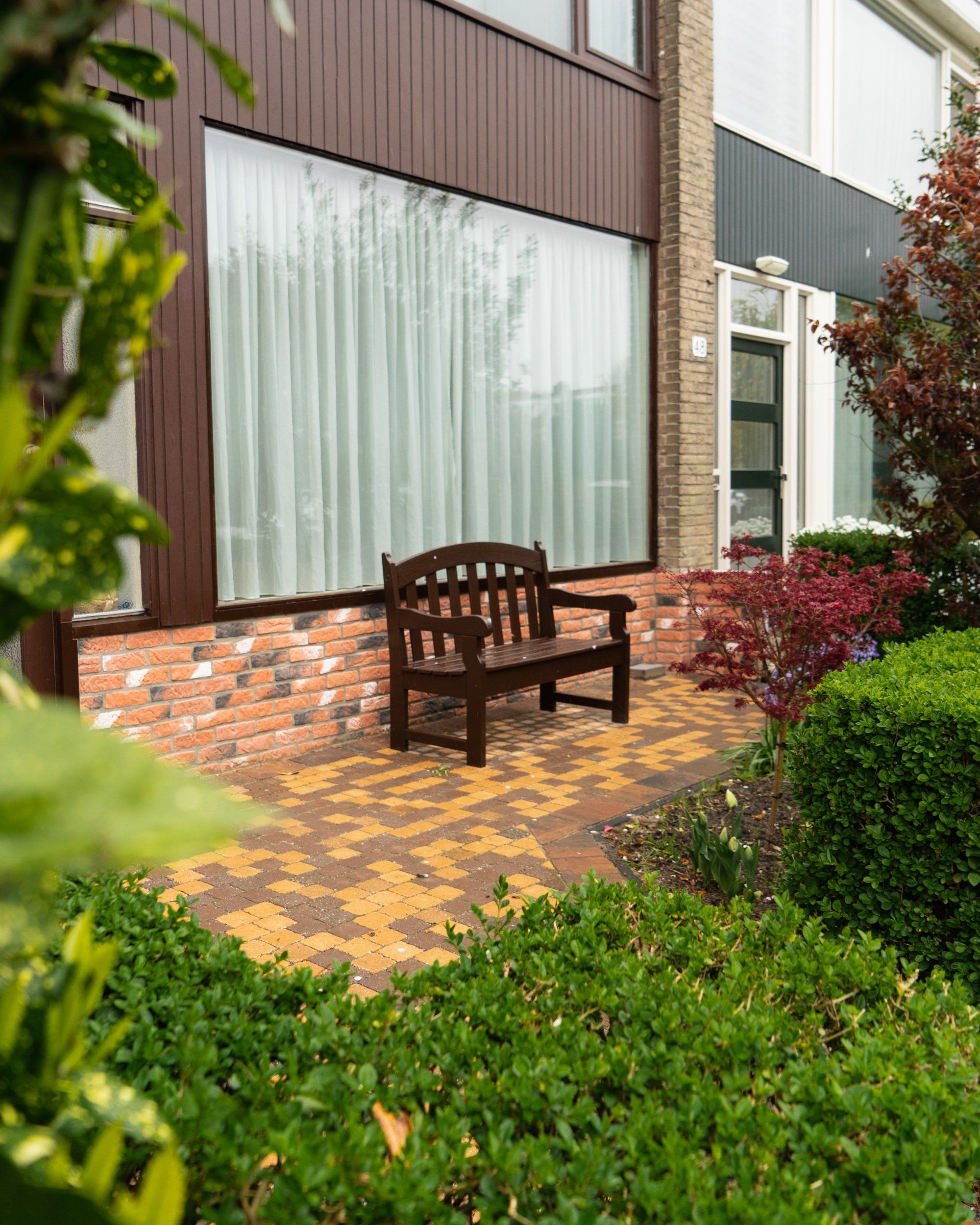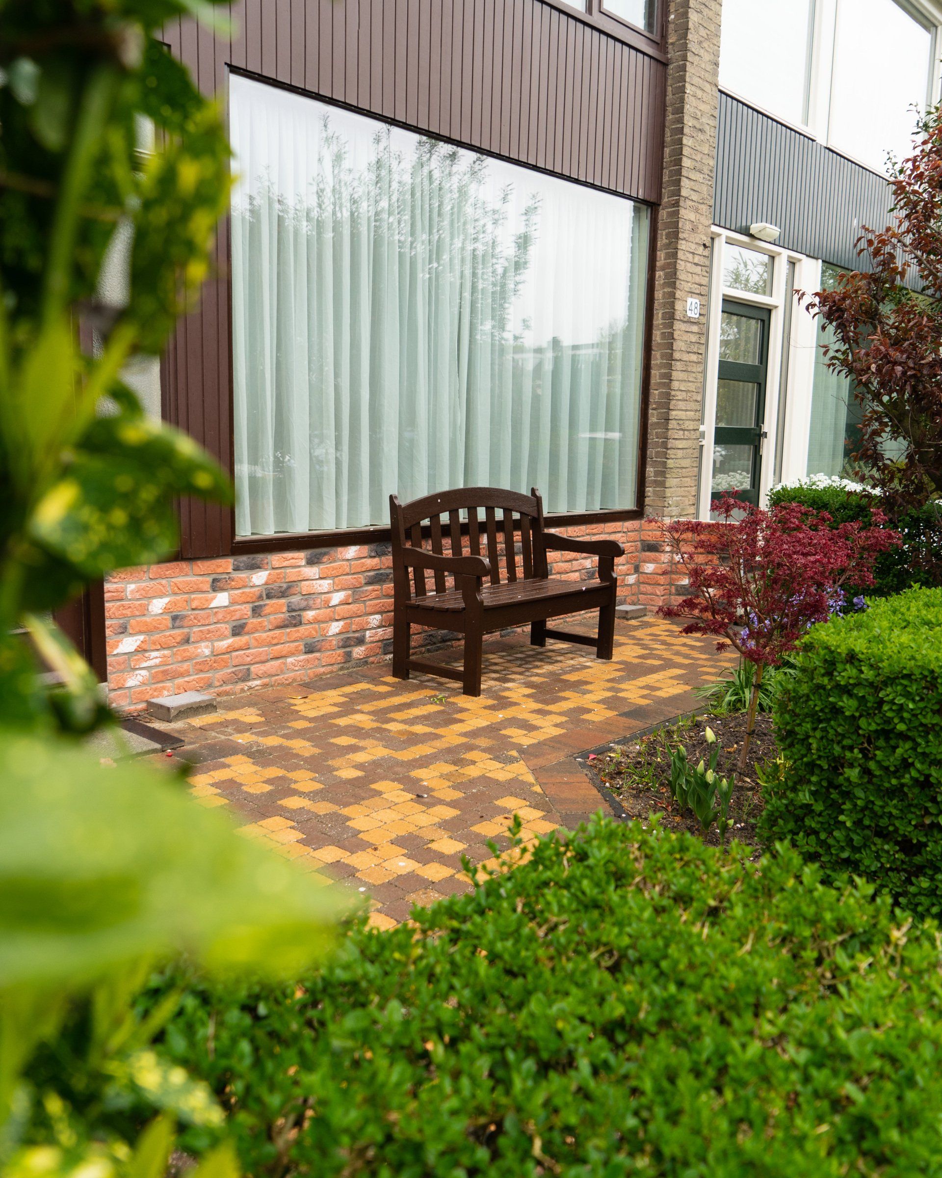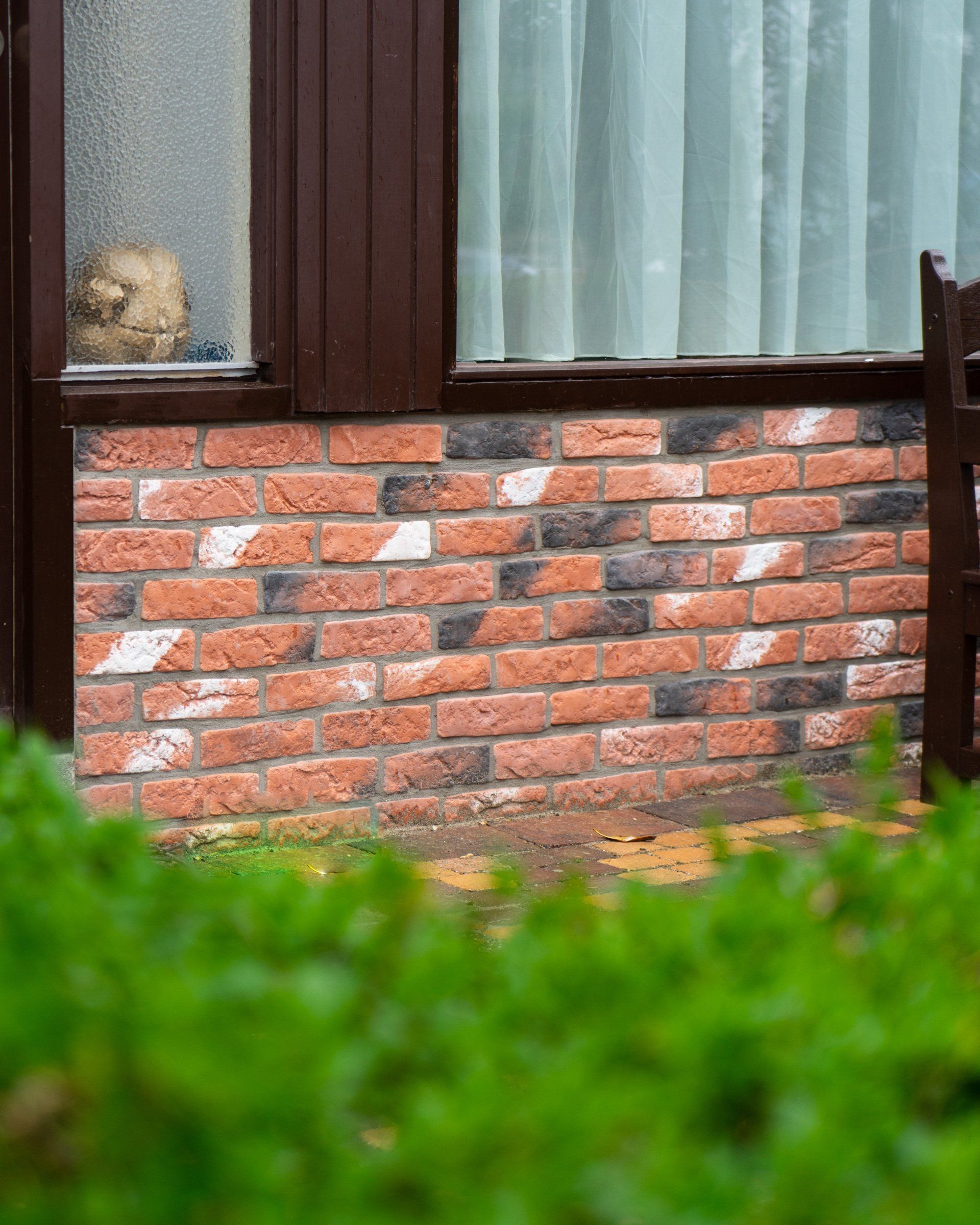 Vrolijke, kleurige voortuin met steenstrips op de muren, en 10x10 als bestrating
