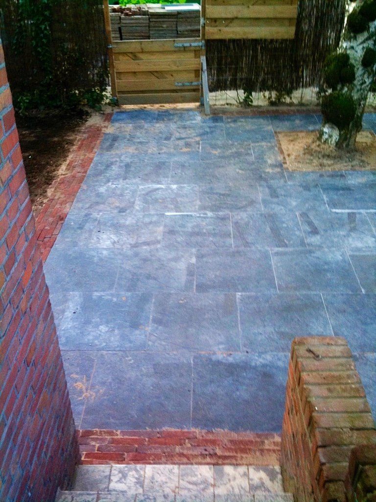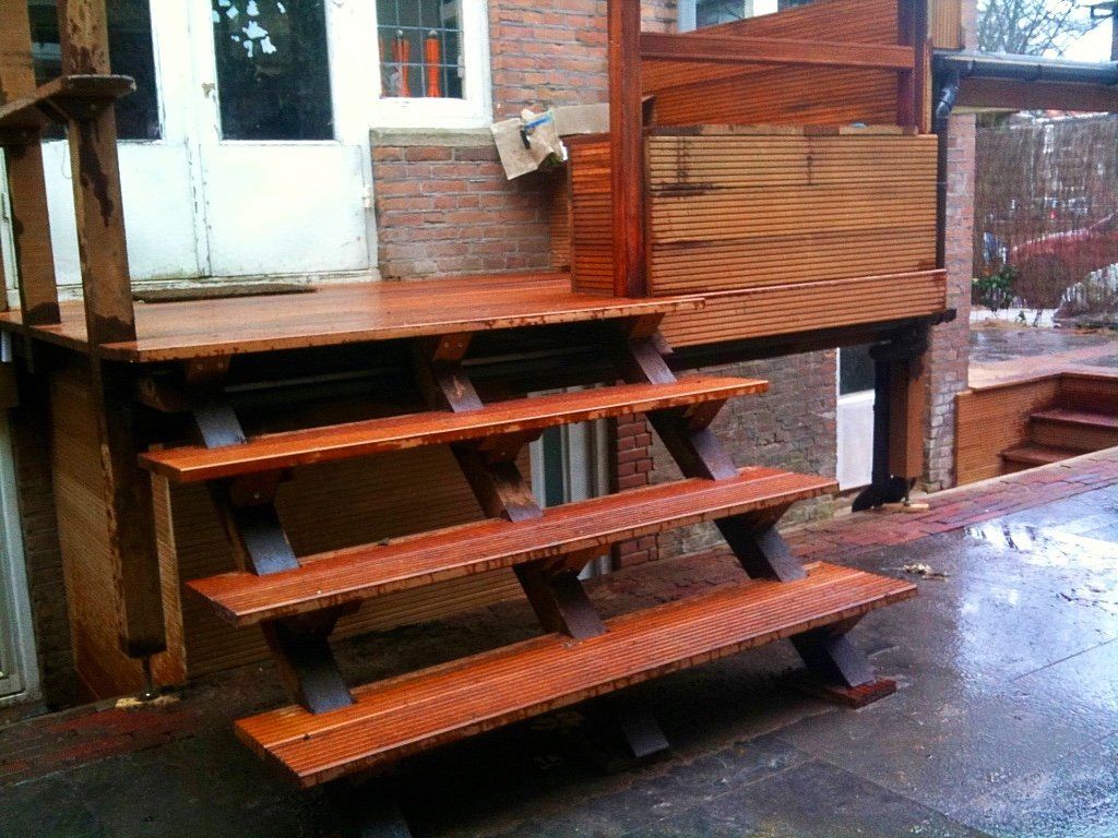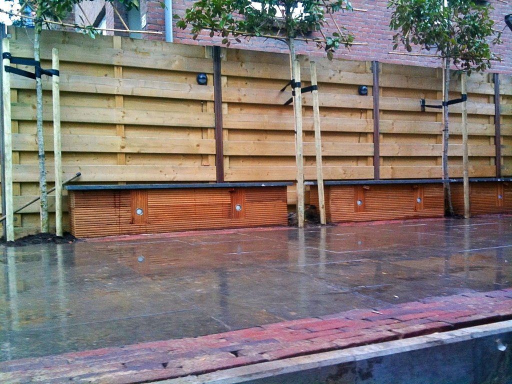 Deze voor,-zij en achtertuin heeft veel denkwerk en creativiteit nodig gehad van onze ontwerper. De constructie aan het huis was verhoogd en stelbaar en moest trapjes hebben voor zowel naar boven als naar het souterrain, alwaar ook nog een opbergkast is gemaakt! Verder zijn de natuurstenen mooi gecombineerd met rode waaltjes. De bankjes zijn van hardhout, alsmede de balkon ect. De trap naar de voordeur is ook bekleed met natuursteen, alsmede de bankjes in de achtertuin. Kortom een prachtige complete tuin, met verlichting, beplanting (met o.a de leiphotinia, en klimop)mooie bestrating, schuttingen en mooi timmerwerk! Ga het zien!