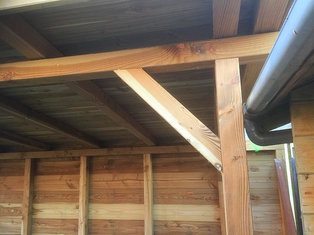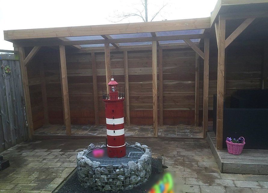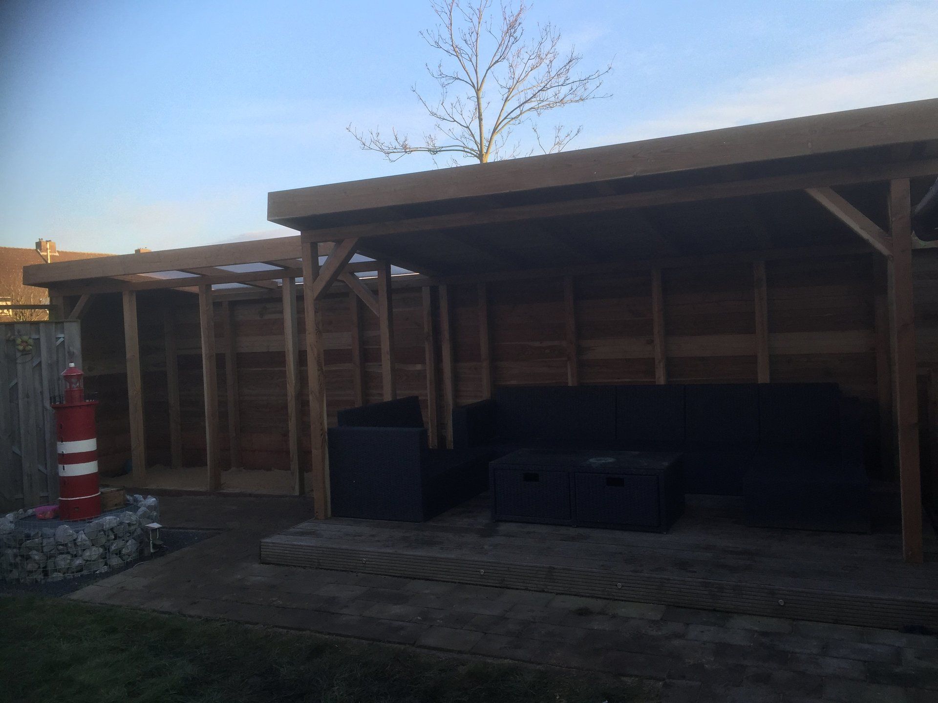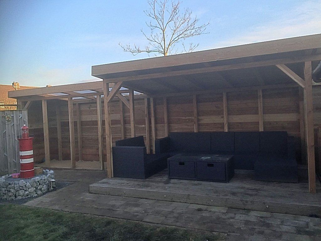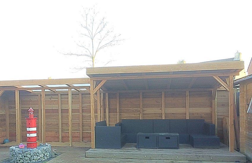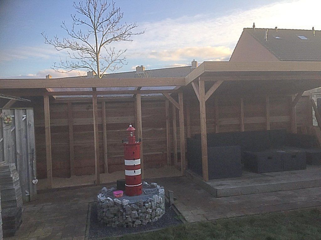 Op de oude vlonder, bij de schuur is een overkapping en volière gerealiseerd. Omdat de schuur begint waar de overkapping eindigt, is er ruimte ontstaan achter de schuur, om hiervan gebruik te maken is er een deur(tje) gemaakt. D.w.z. de zijkant (bij de schuur) van de overkapping is dichtgetimmerd zodat de opslag aan het oog onttrokken wordt. De volière, zoals te zien, is geheel open. Deze werd verder door de klant voorzien van gaas. Het dak van de vollere is deels dicht, voor een nachtverblijf en deels voorzien van helder polycarbonaat platen. Deze overkapping en volière is geheel op maat gemaakt met Douglas palen en Zweeds rabat planken.