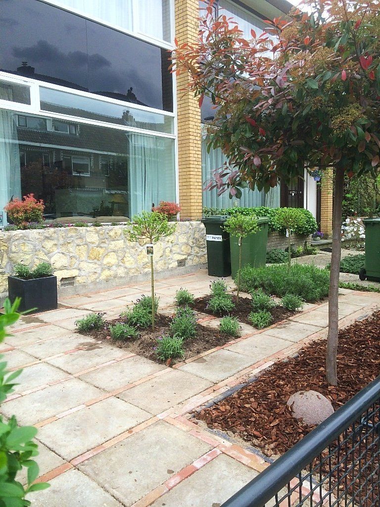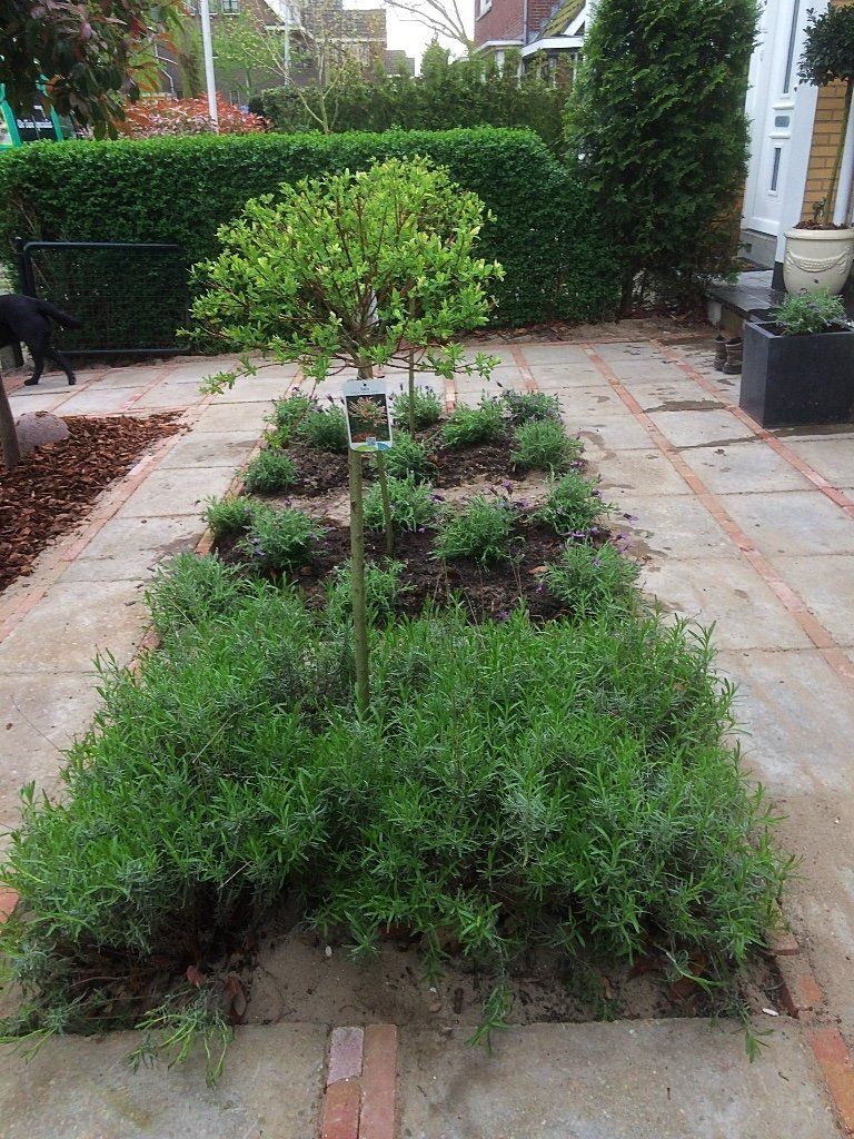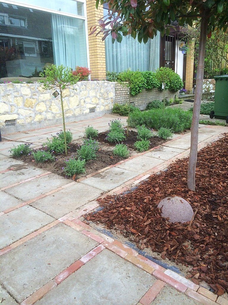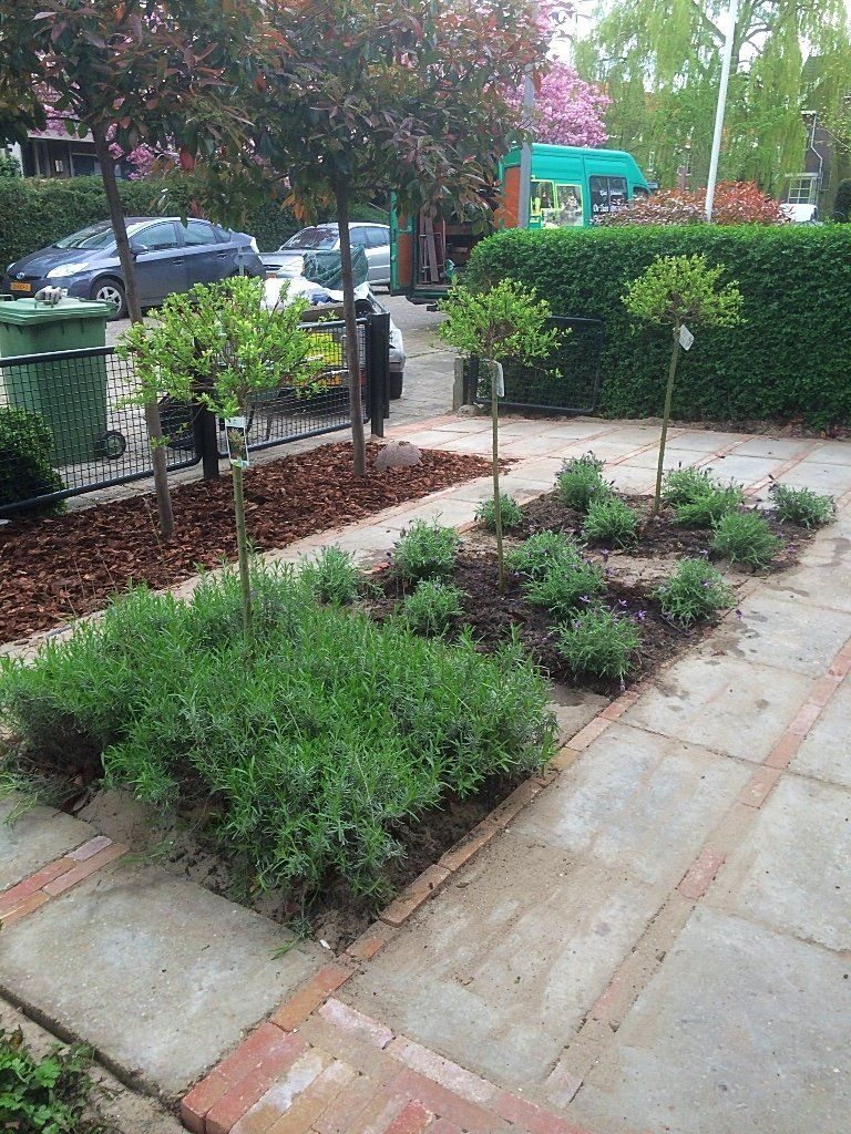 Deze voortuin, is door de grindtegel om te draaien en er waaltjes tussen te leggen, als nieuw! Samen met de borders in vakken met lavendel en Salix op stam heeft de tuin een mooie uitstraling. De photinia op stam met boomschors in de borders maakt het geheel af!