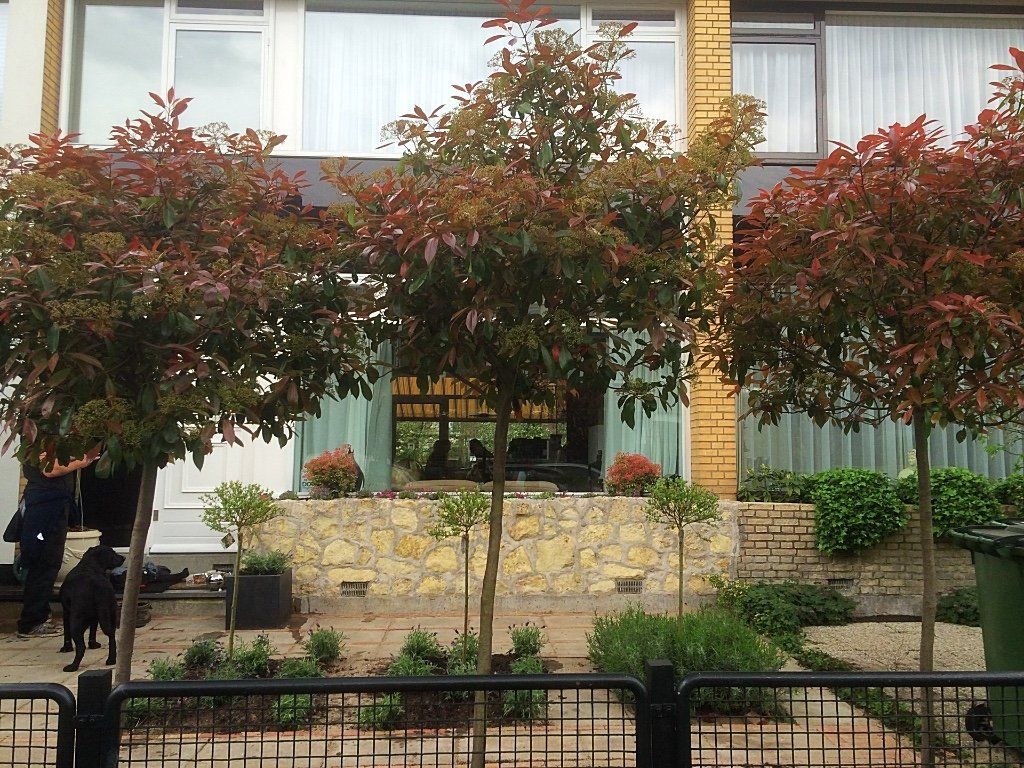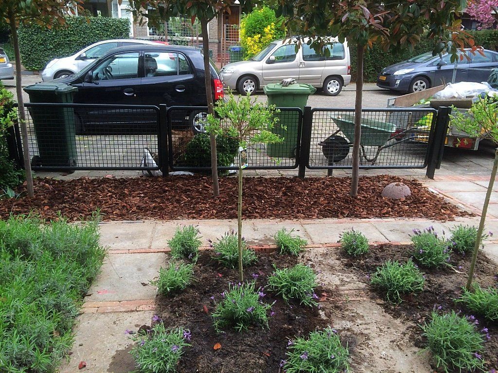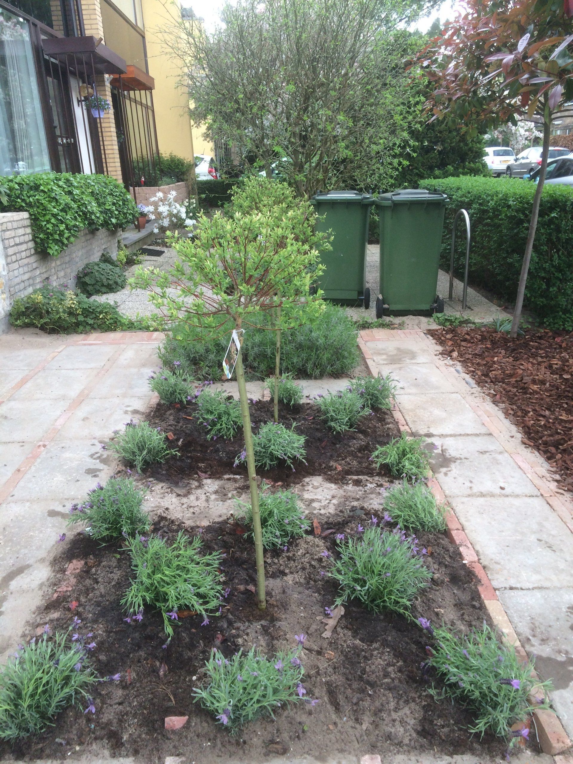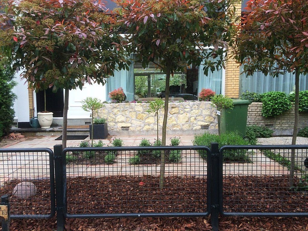 Deze voortuin, is door de grindtegel om te draaien en er waaltjes tussen te leggen, als nieuw! Samen met de borders in vakken met lavendel en Salix op stam heeft de tuin een mooie uitstraling. De photinia op stam met boomschors in de borders maakt het geheel af!