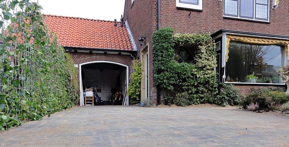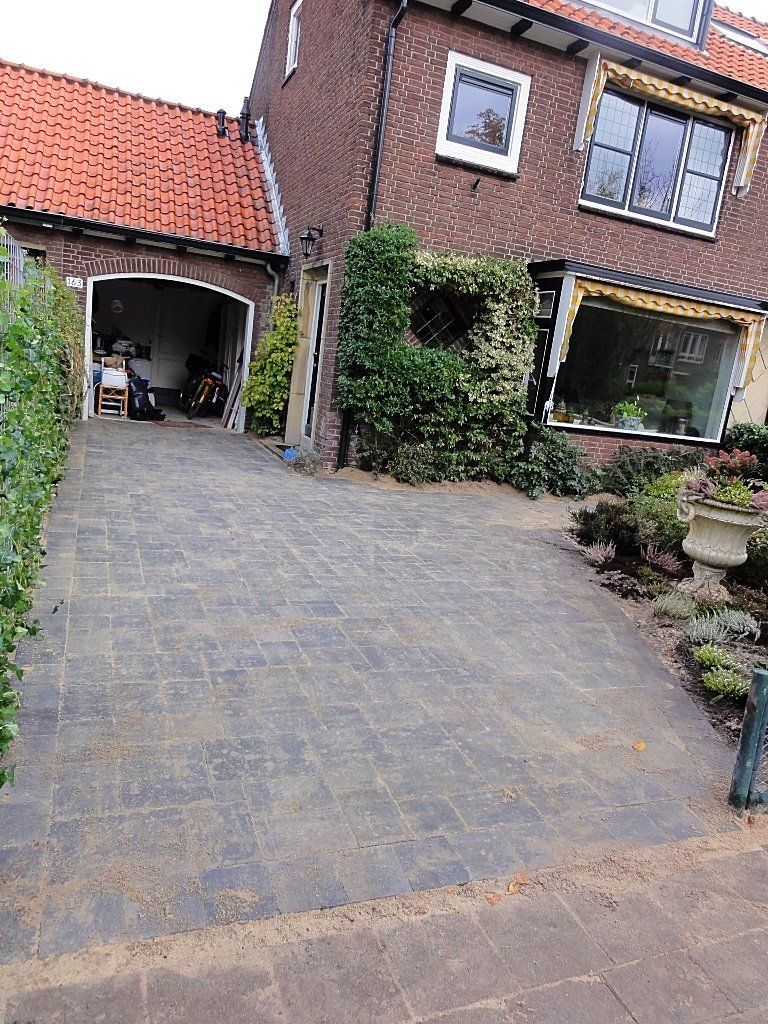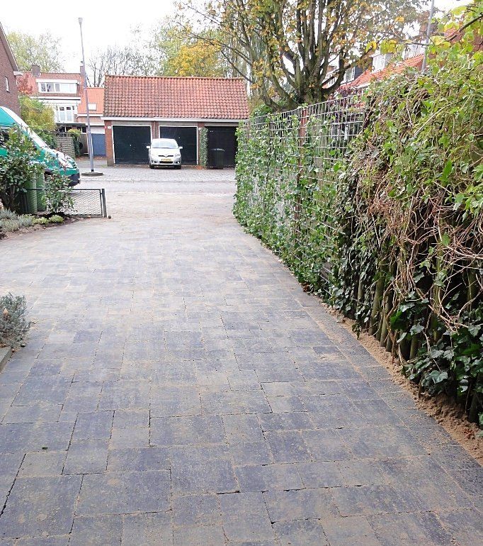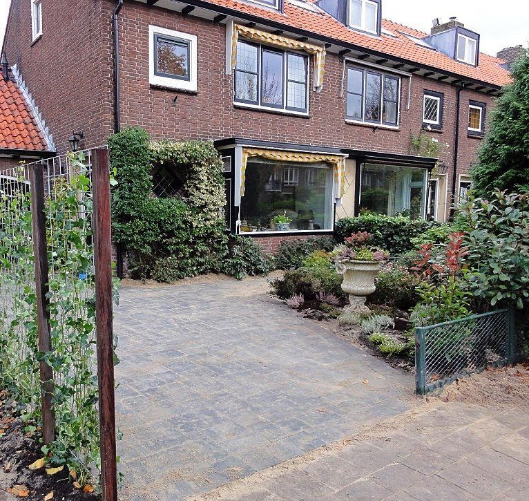 We hebben hier niet alleen een mooie oprit gerealiseerd maar ook een nieuwe schutting geplaatst van hardhouten palen met daartussen met hedera begroeide trellis. Ook hebben we de beplanting in de tuin gesnoeid en nieuwe plantjes erbij gezet.