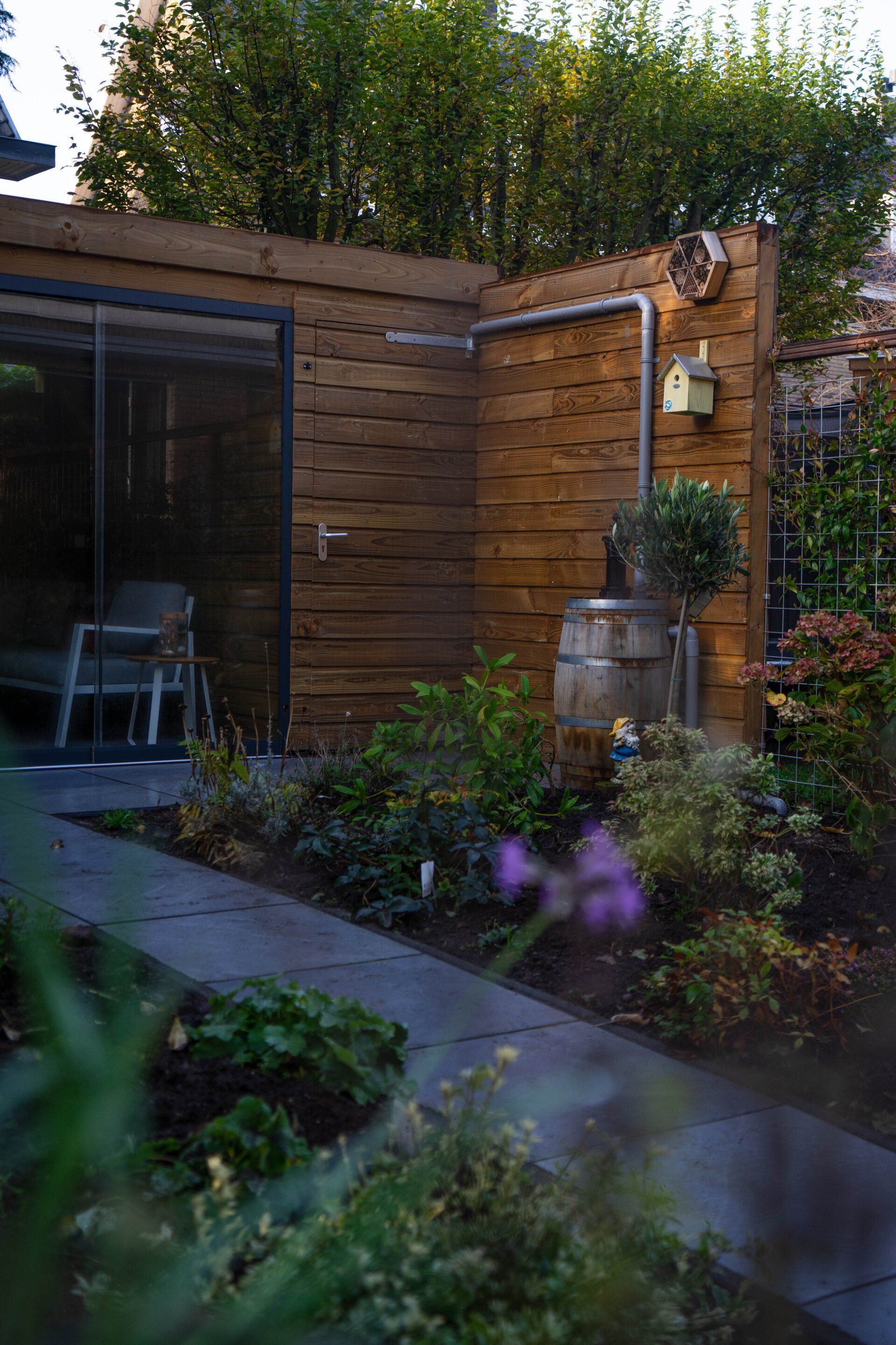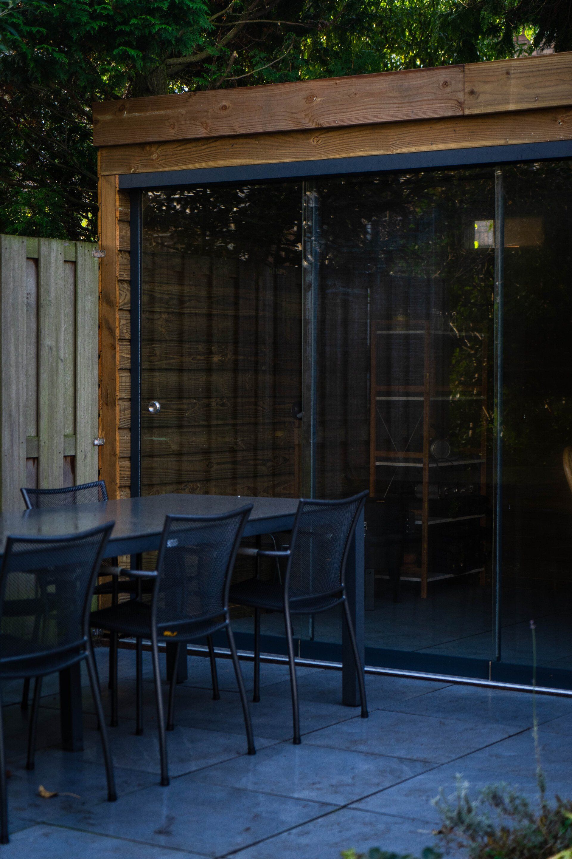 Mooie overkapping met dubbelwandig douglas houten wanden. Met een aangrenzende schuur, ook vervaardigd van douglas planken. De overkapping is voorzien van een glazen schuifpui. Het hemelwaterafvoer is aangesloten op een regenton.