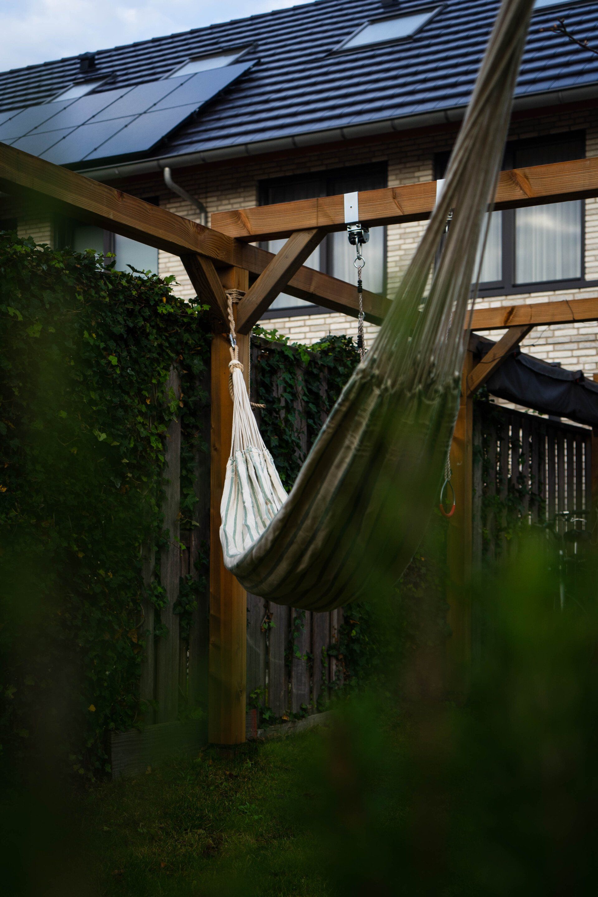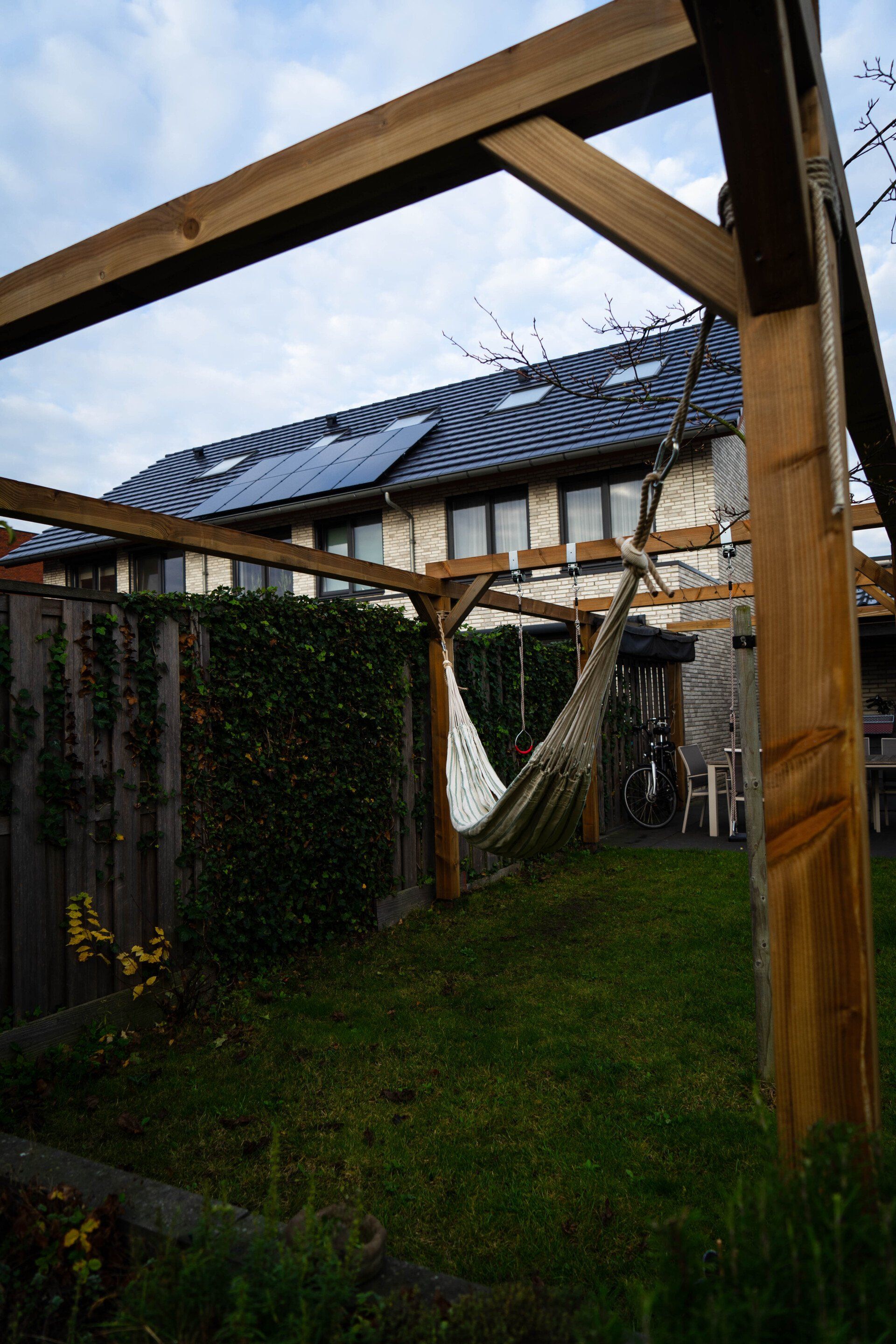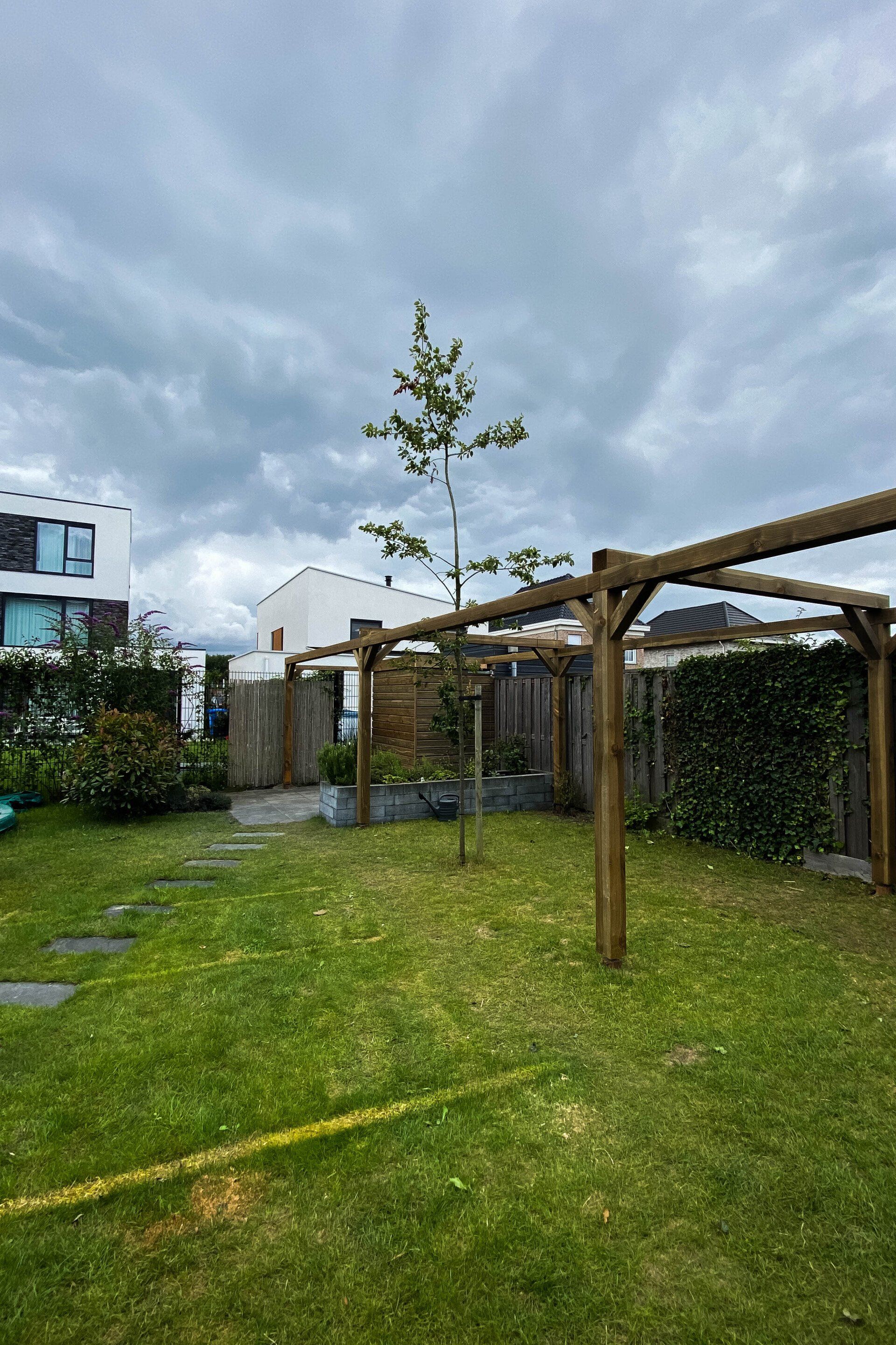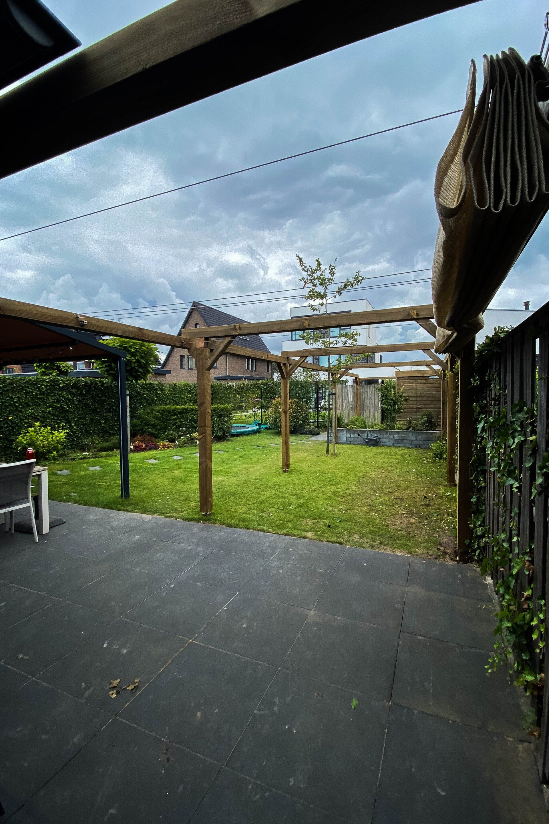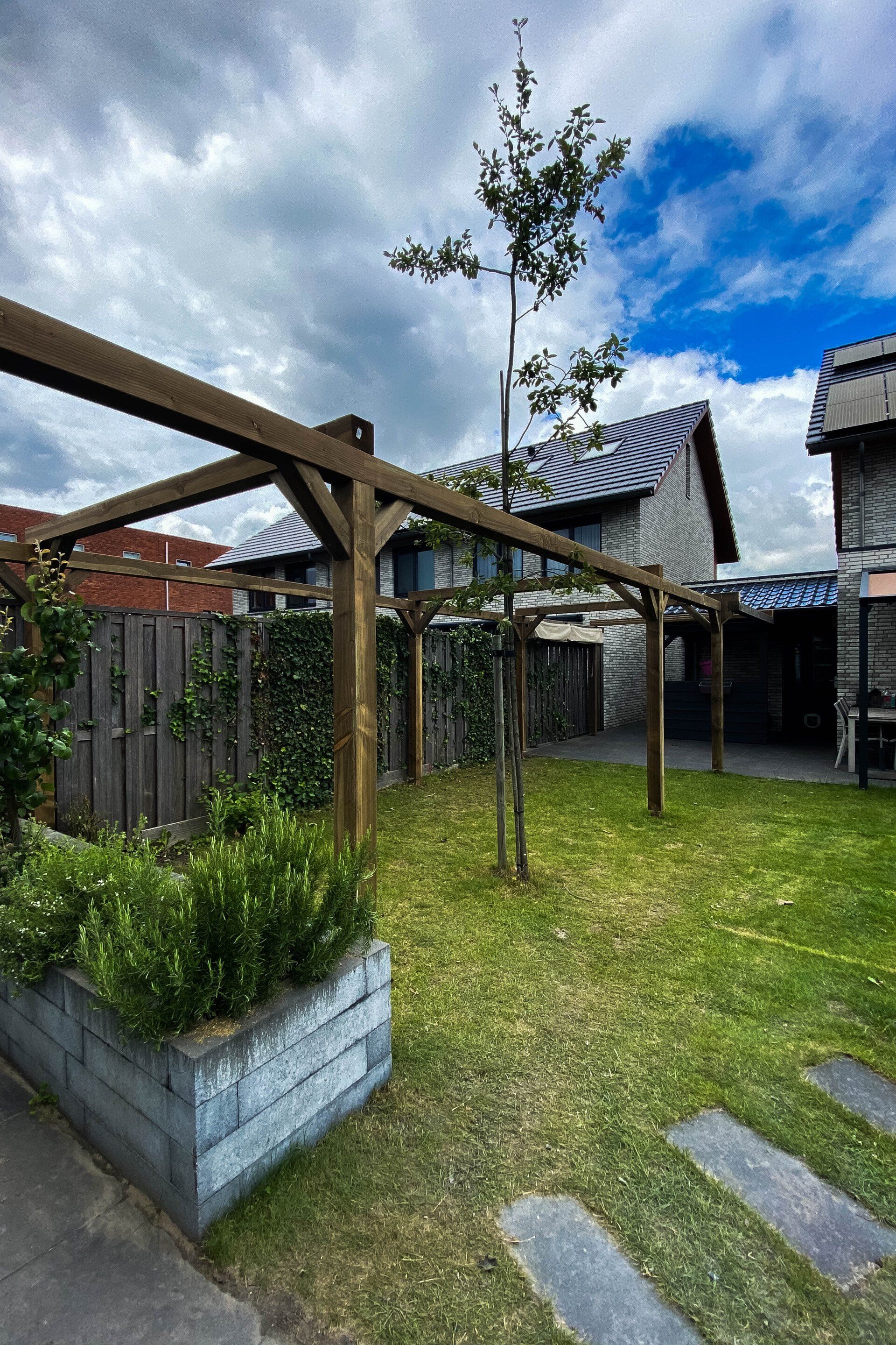 Deze pergola tuin van douglashout heeft een gedeelte met schaduwdoek bij het terras.