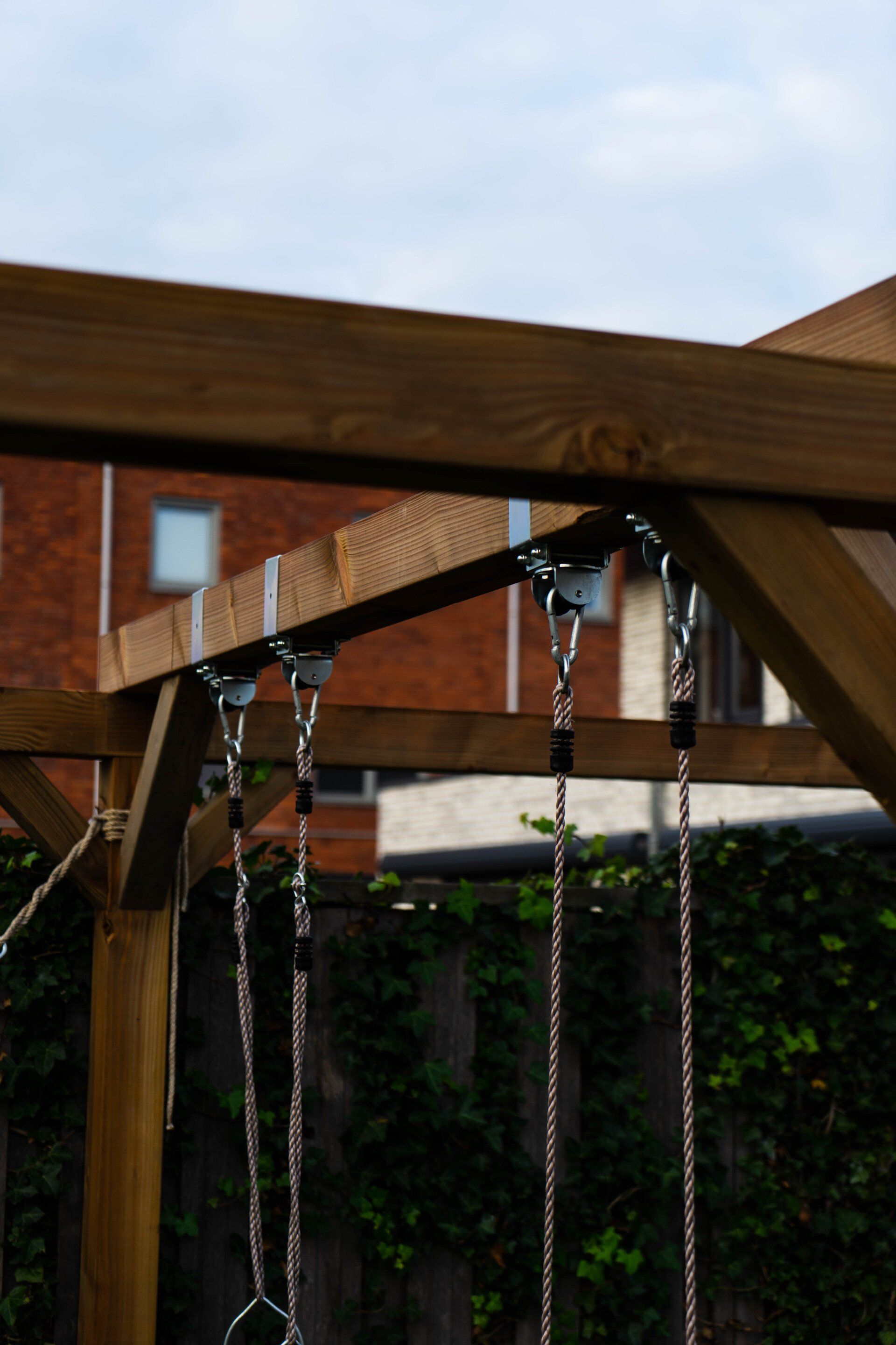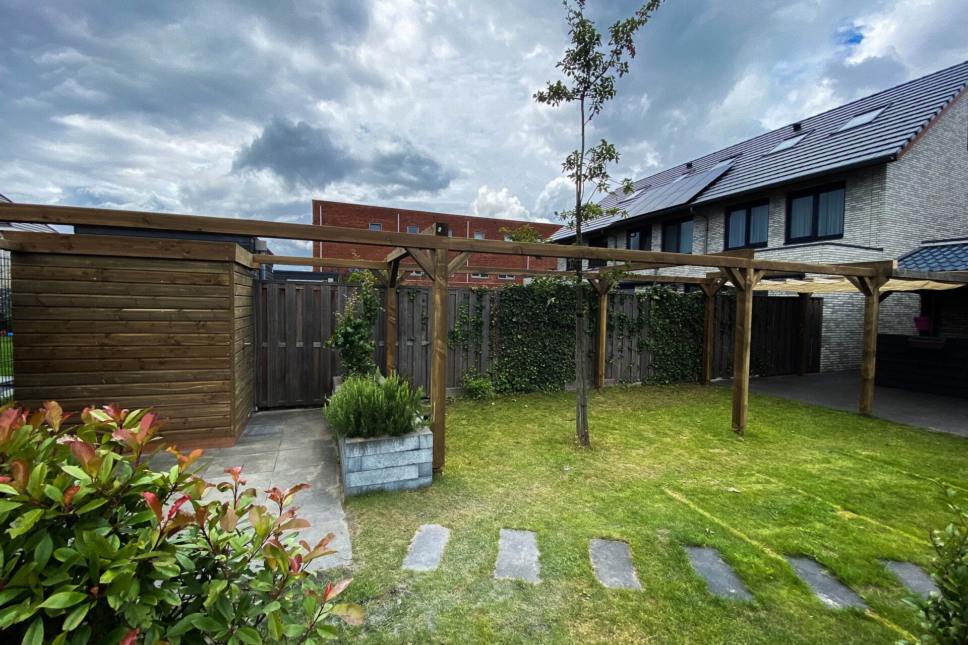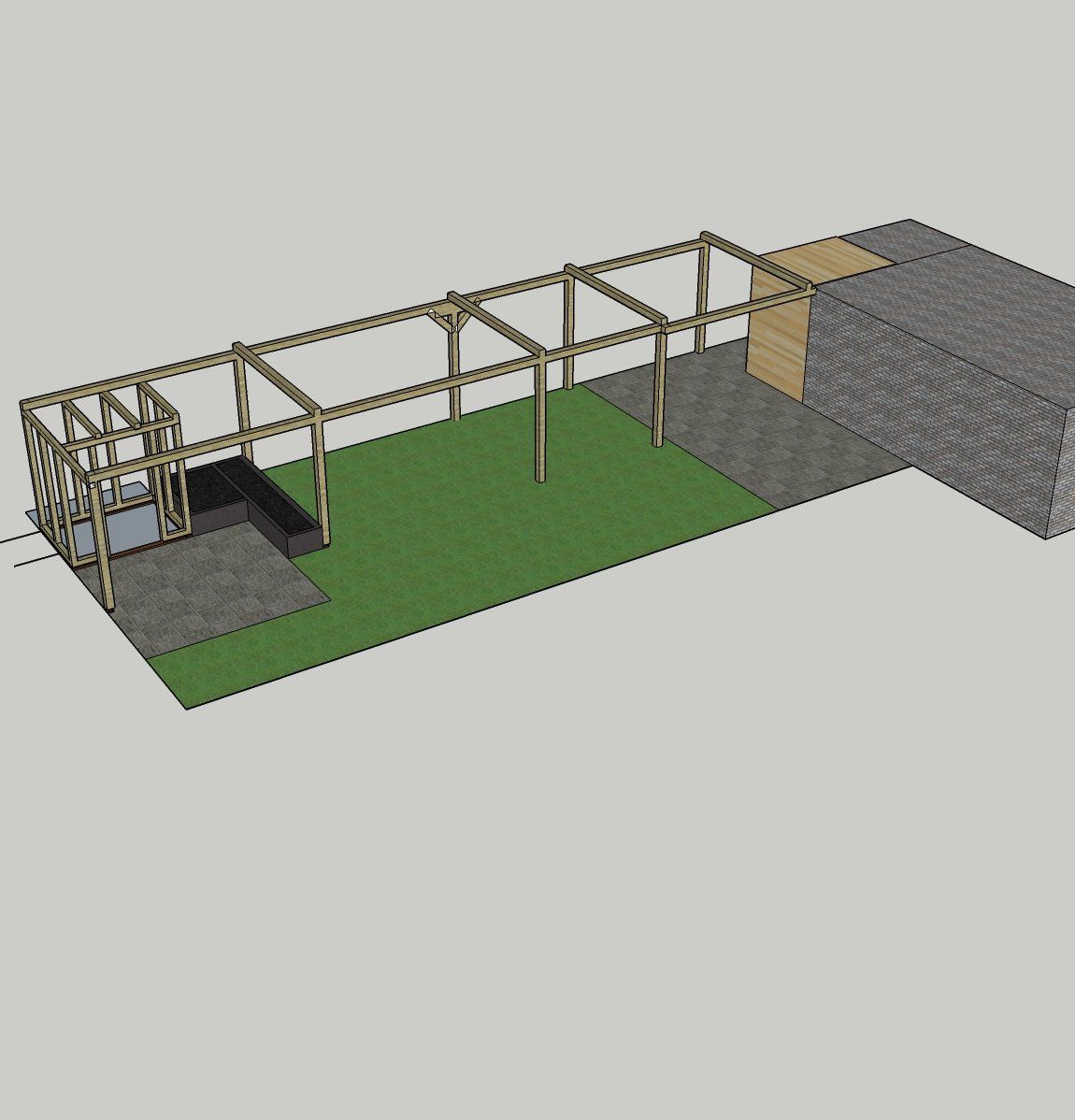 De schuur is tevens gemaakt van douglas hout en is verstelbaar. De verhoogde borders zijn van linea's blokken gemaakt.