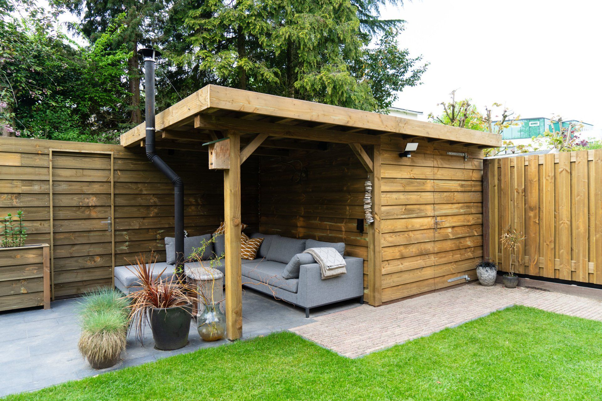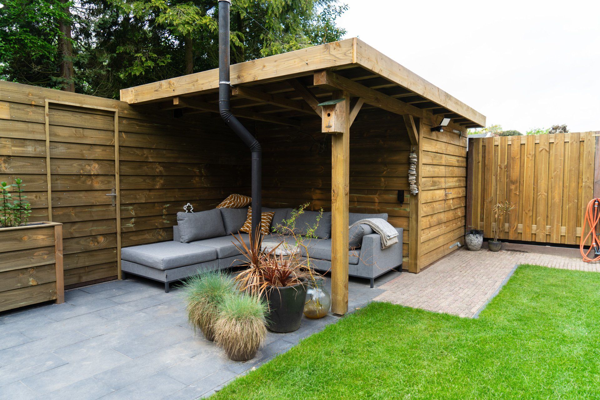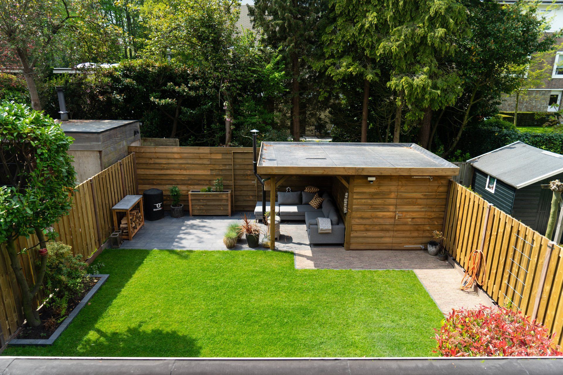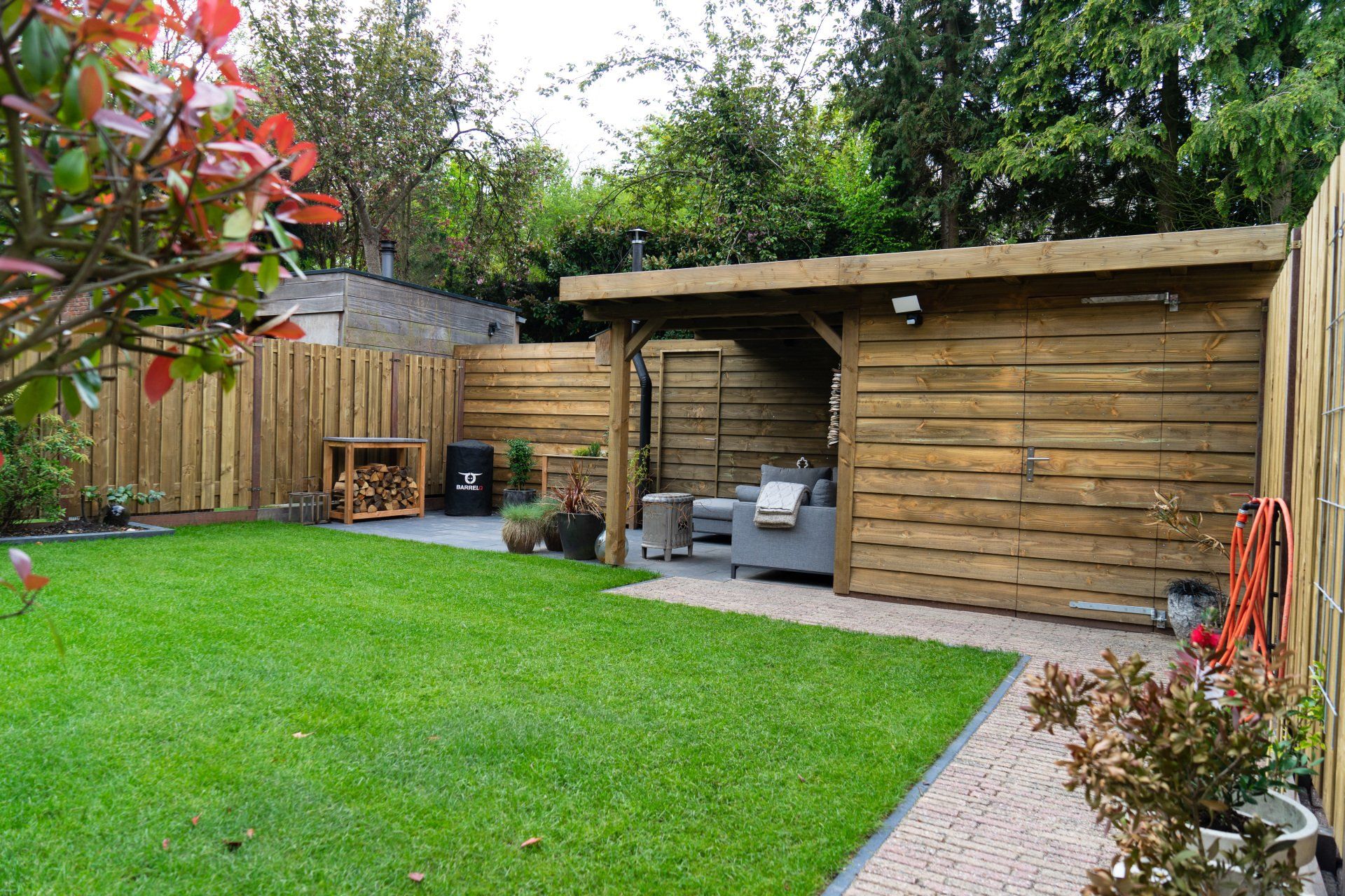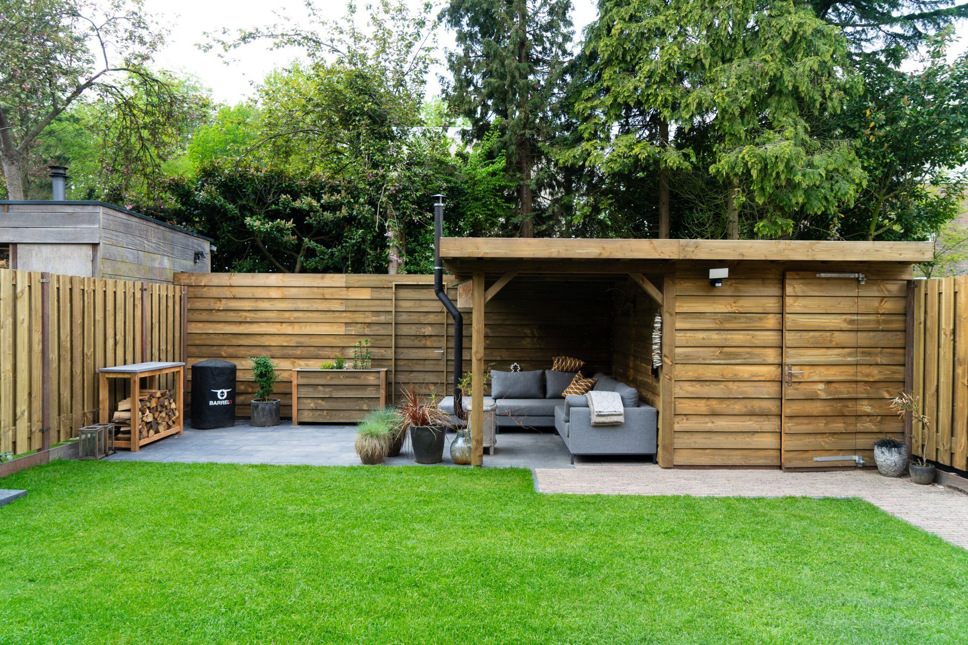 Complete tuin met een mooie overkapping van douglas hout, verlichting, houtkachel, schuttingen van douglas hout, gras en mooie bestrating.