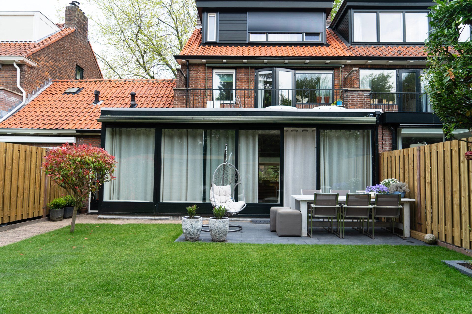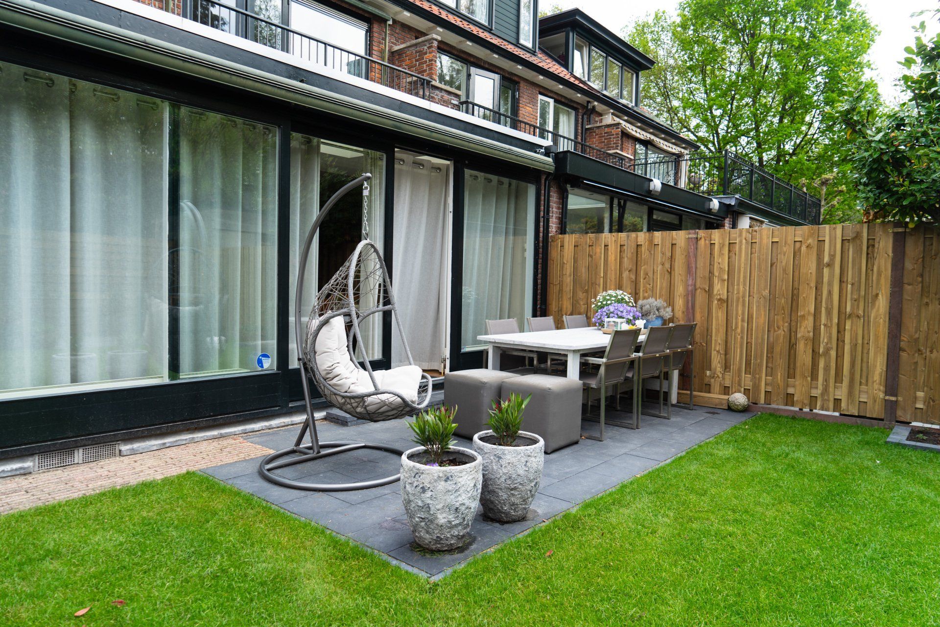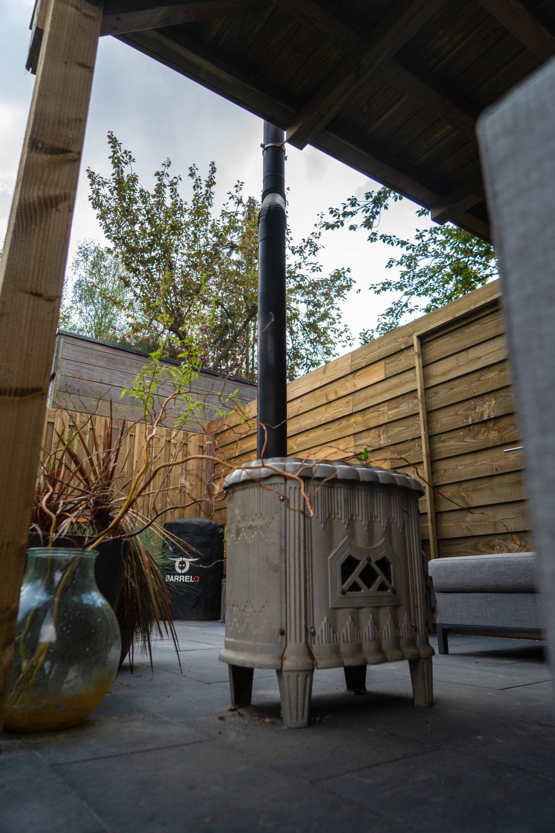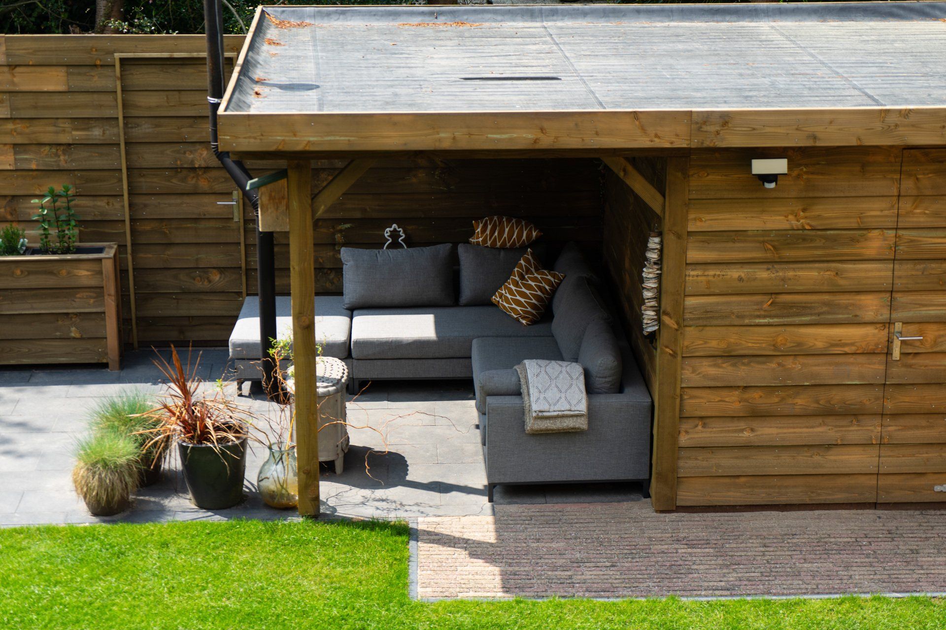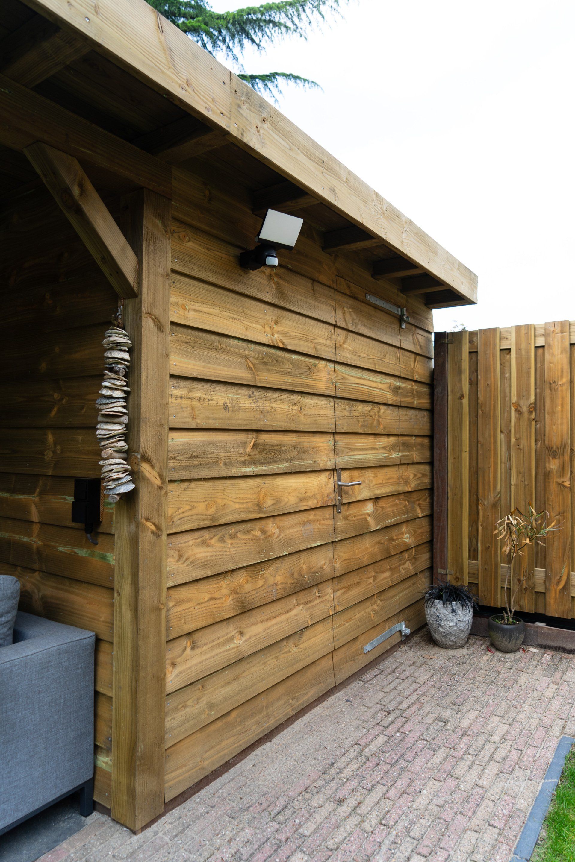 Complete tuin met een mooie overkapping van douglas hout, verlichting, houtkachel, schuttingen van douglas hout, gras en mooie bestrating.