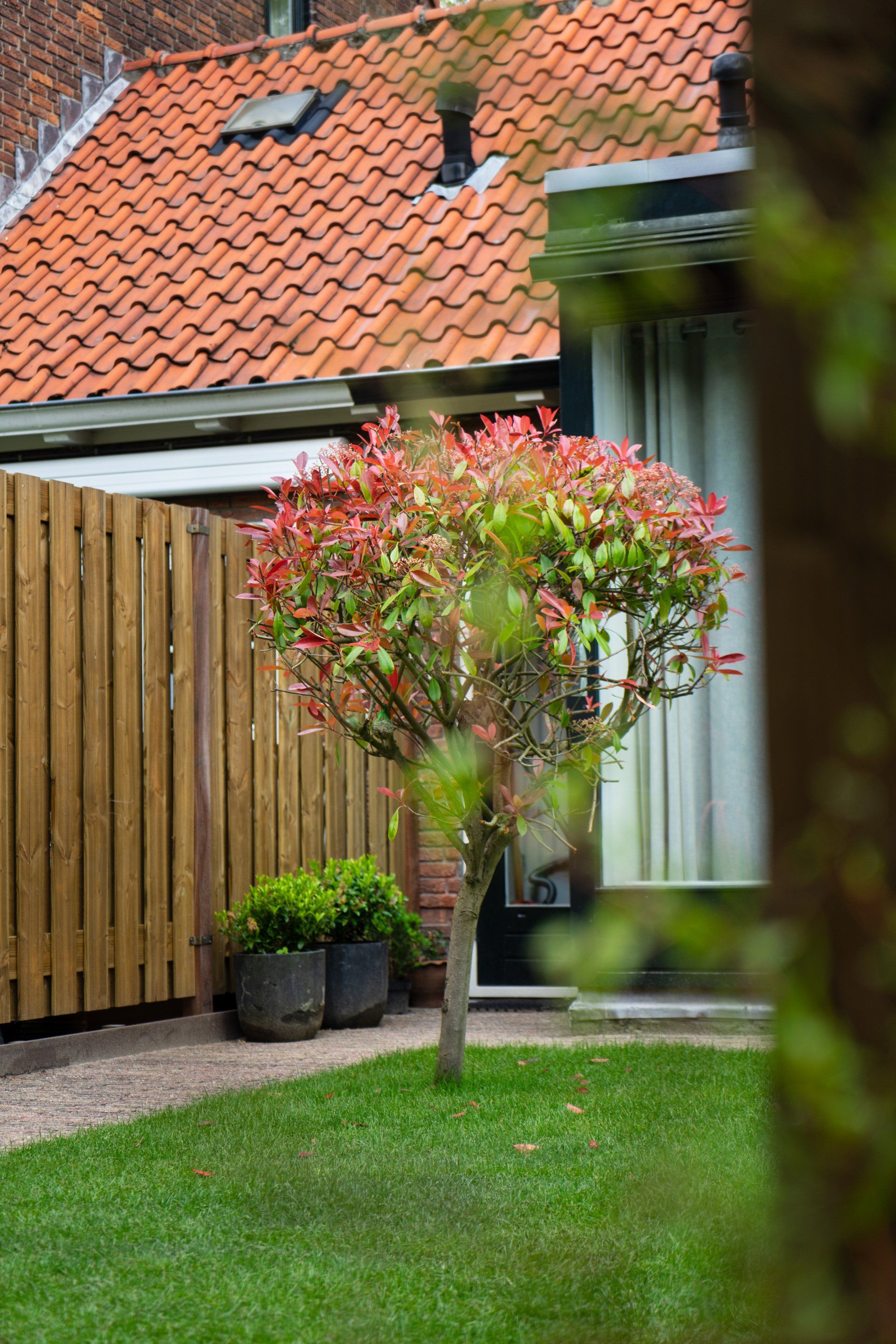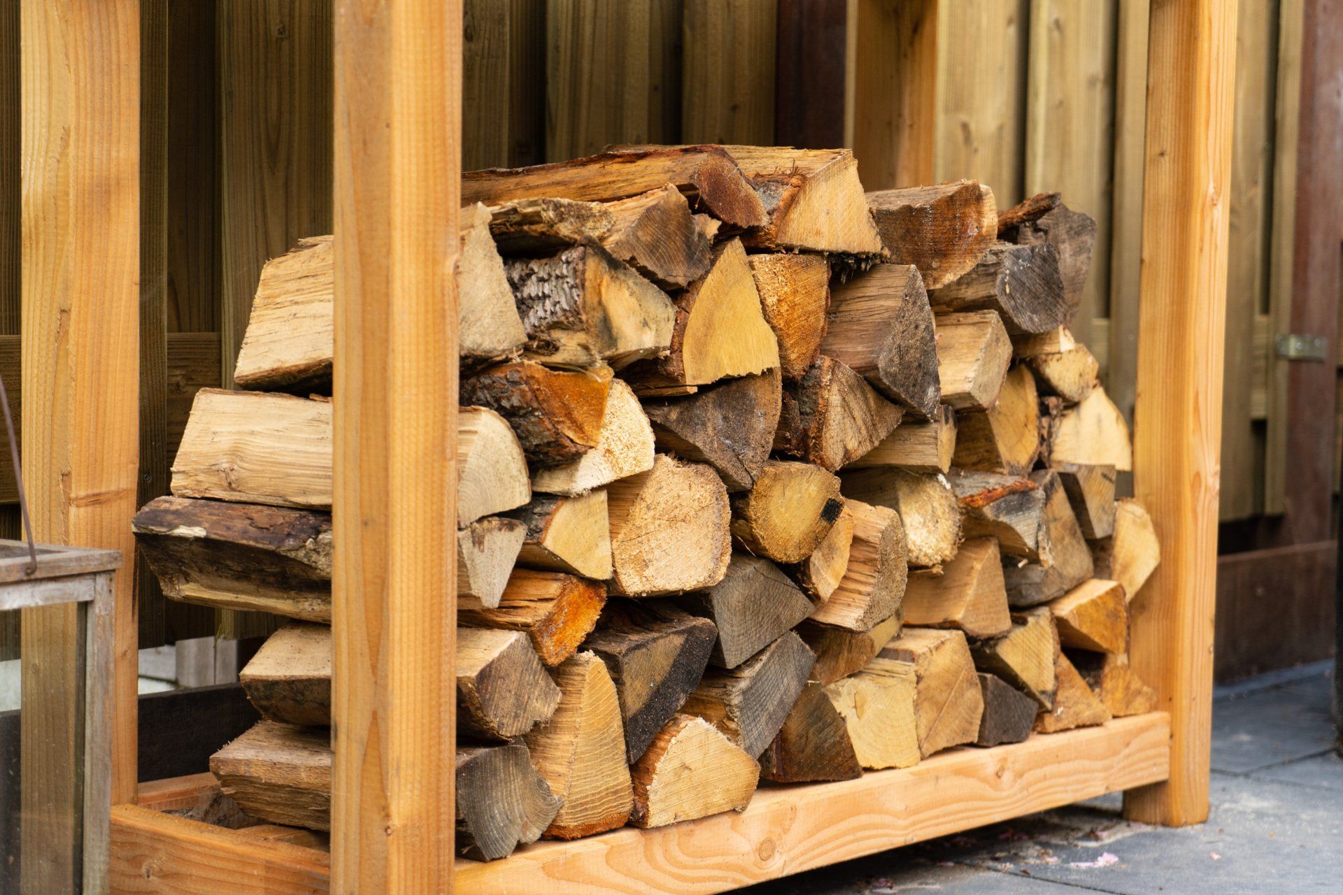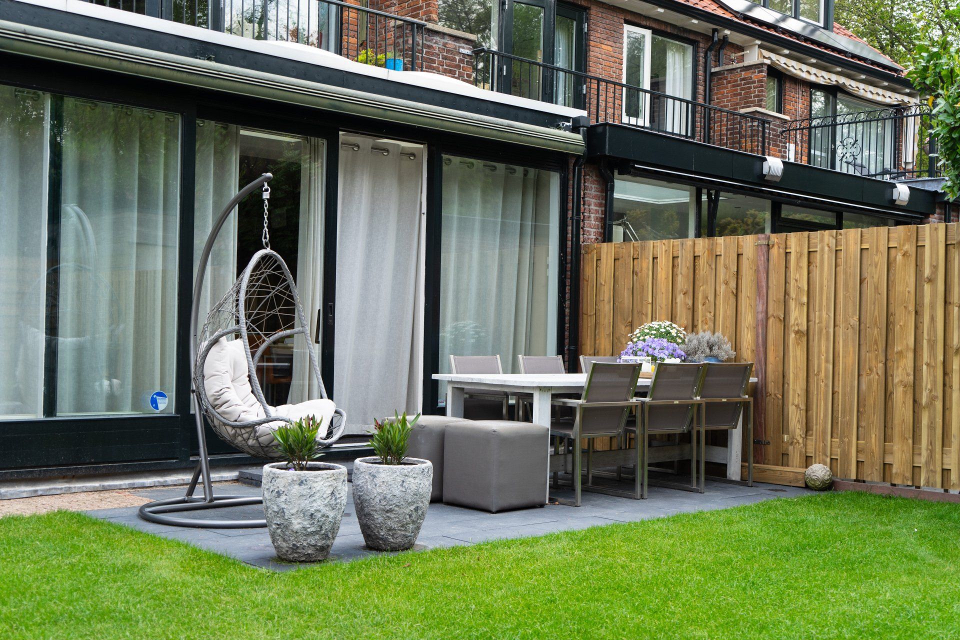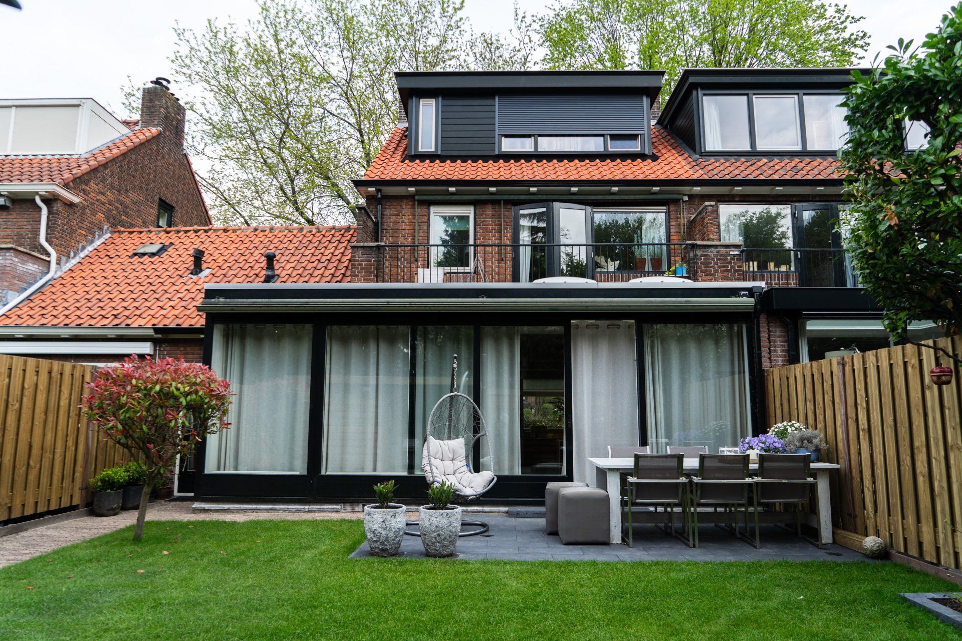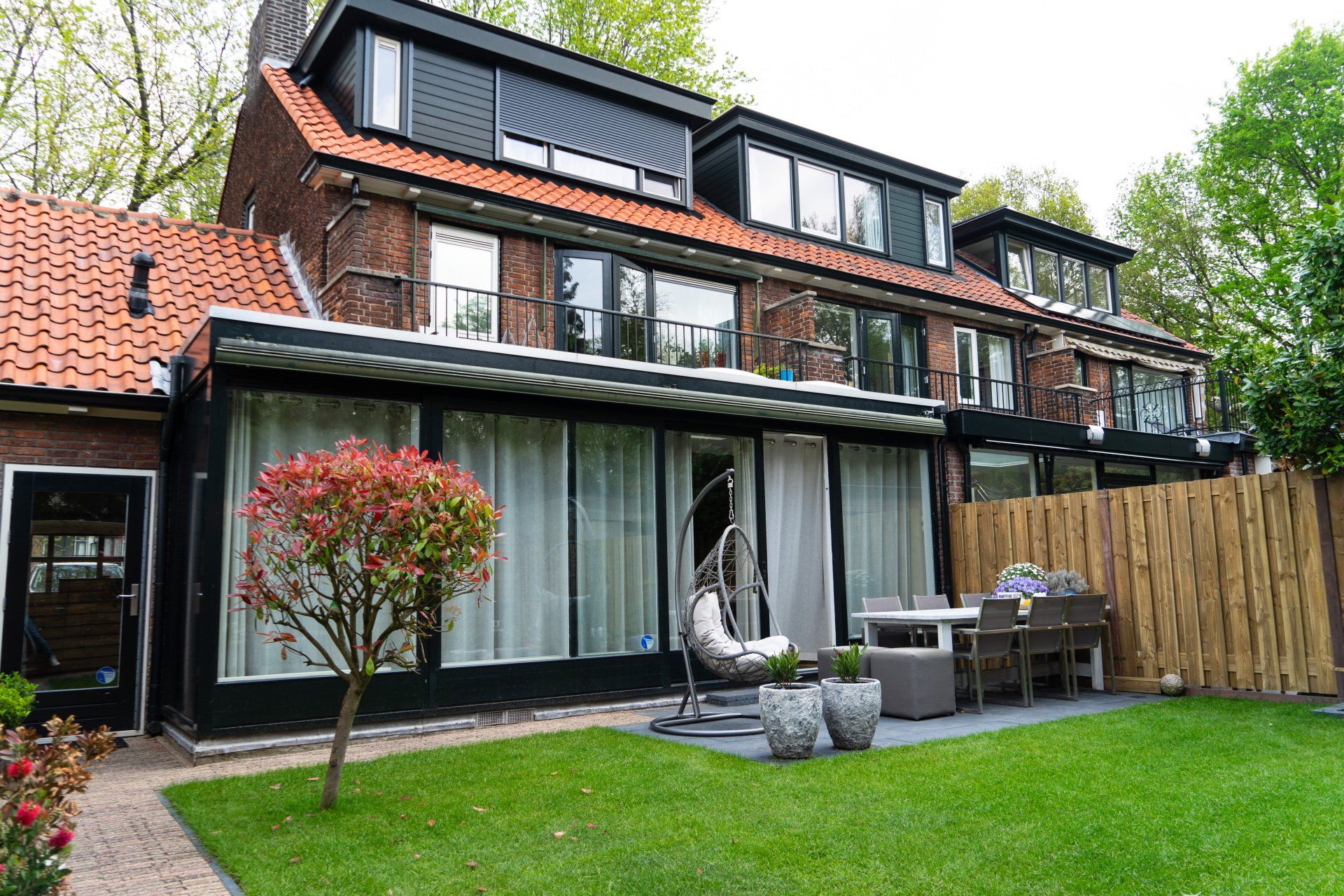 Complete tuin met een mooie overkapping van douglas hout, verlichting, houtkachel, schuttingen van douglas hout, gras en mooie bestrating.