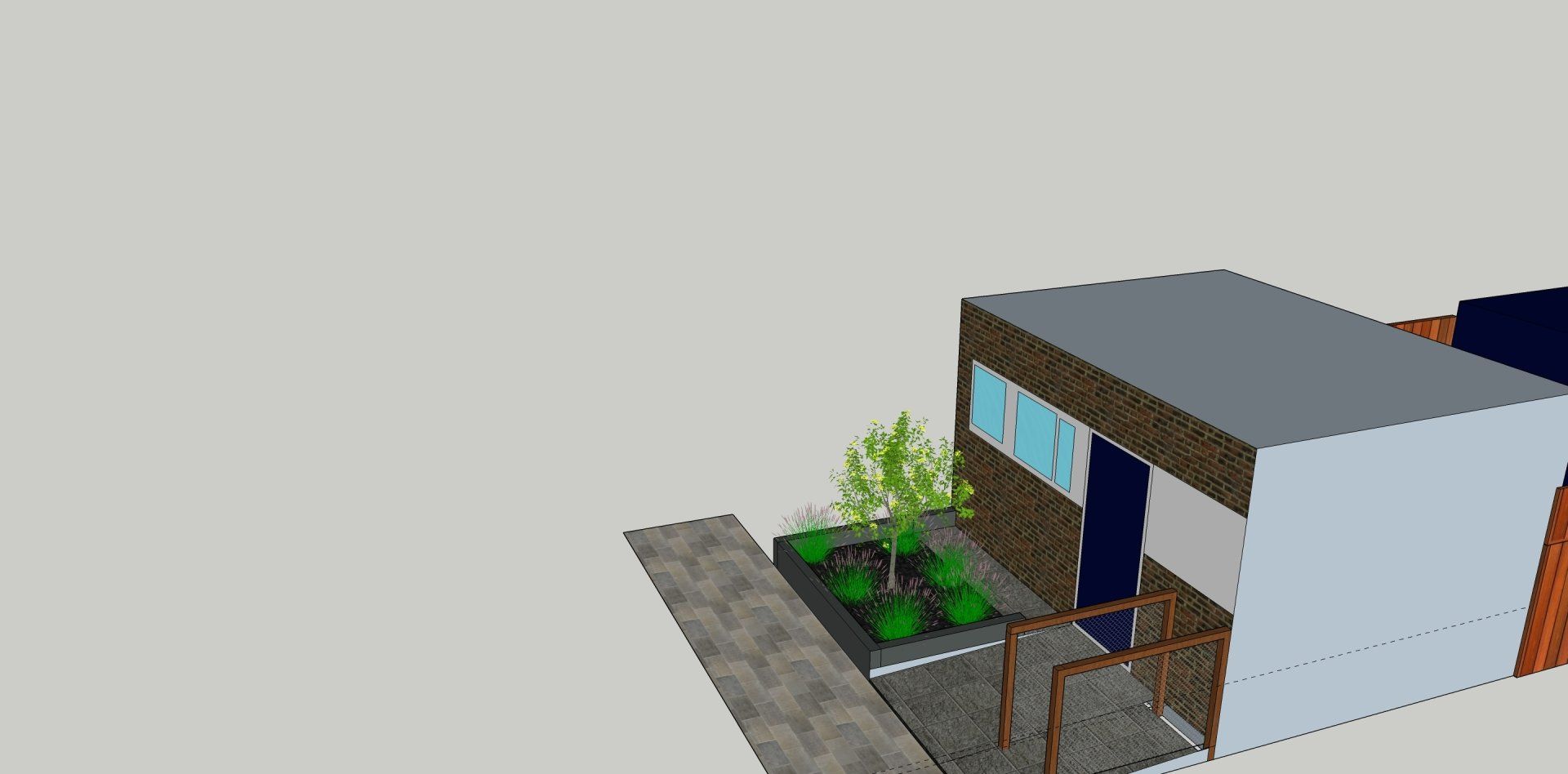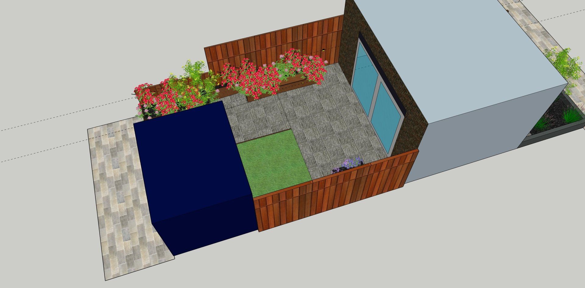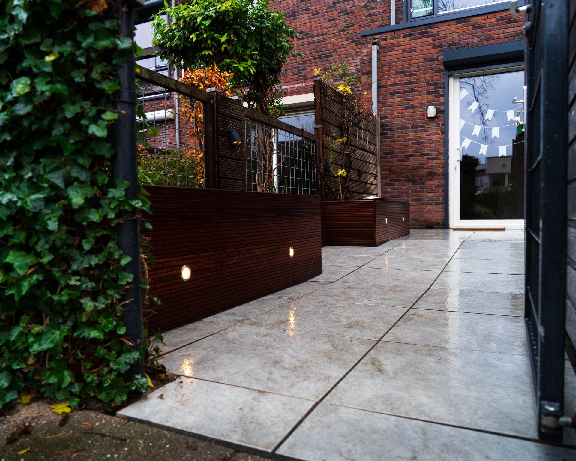 Voor- en achtertuin met keramiek tegels, hardhouten verhoogde bloembakken, gras, trellis schuttingen en sfeervolle verlichting.