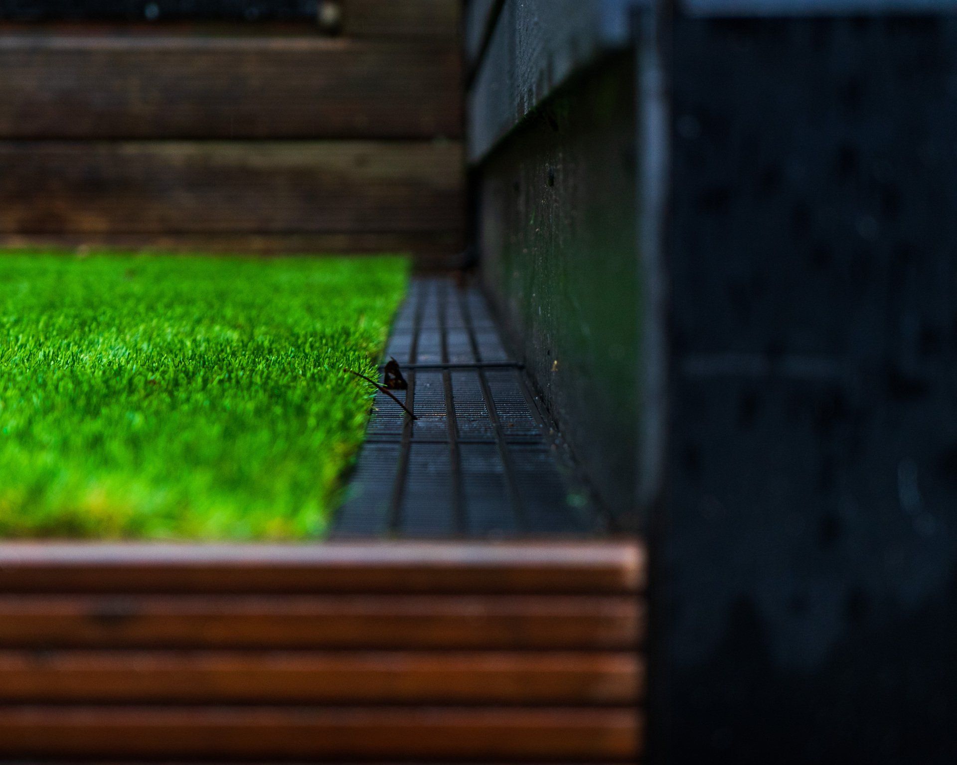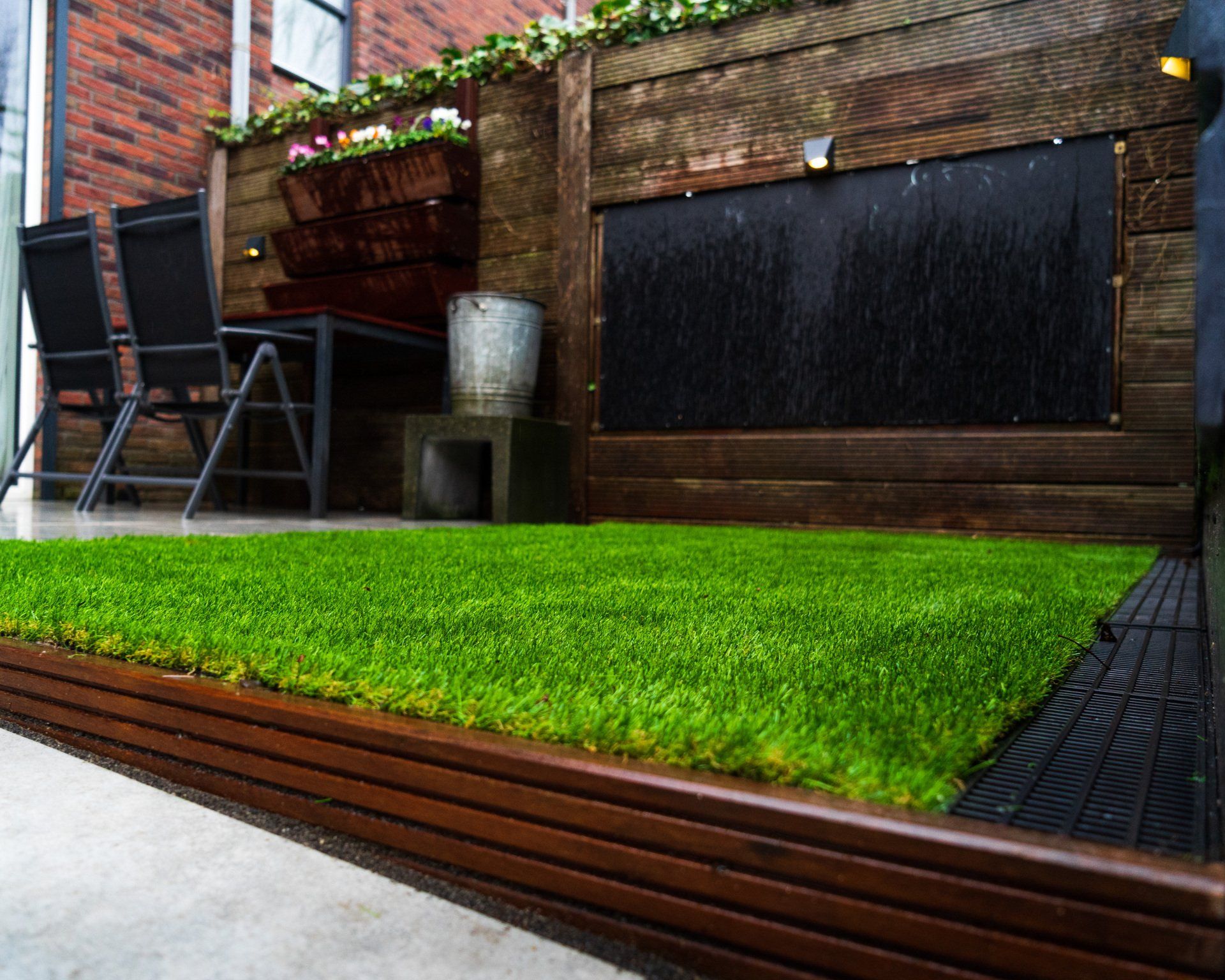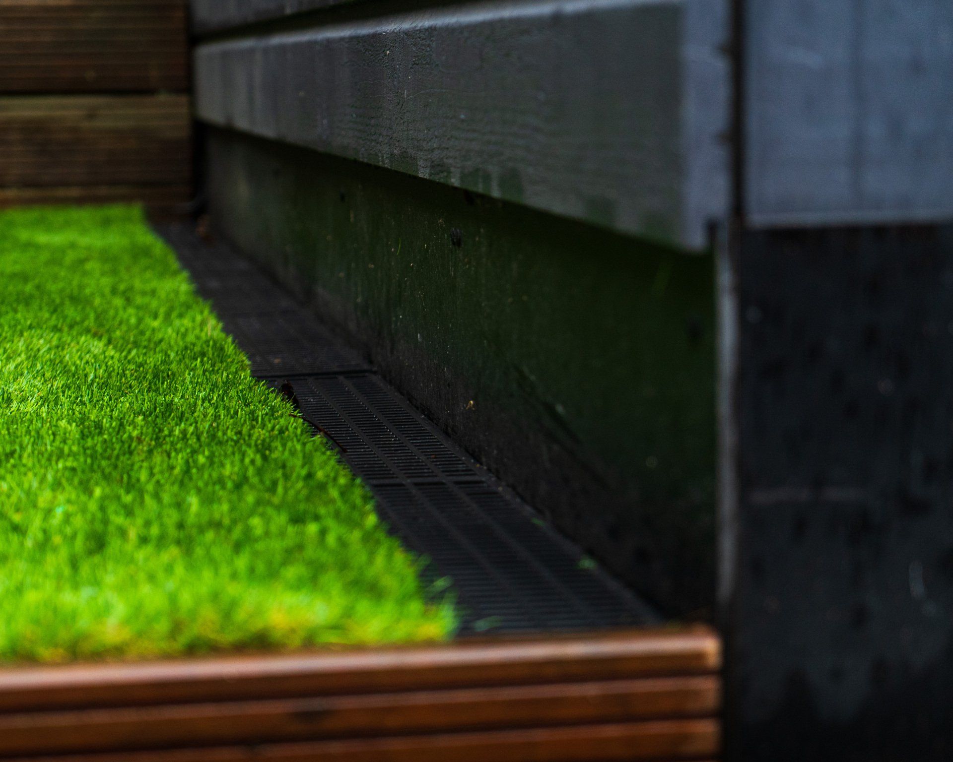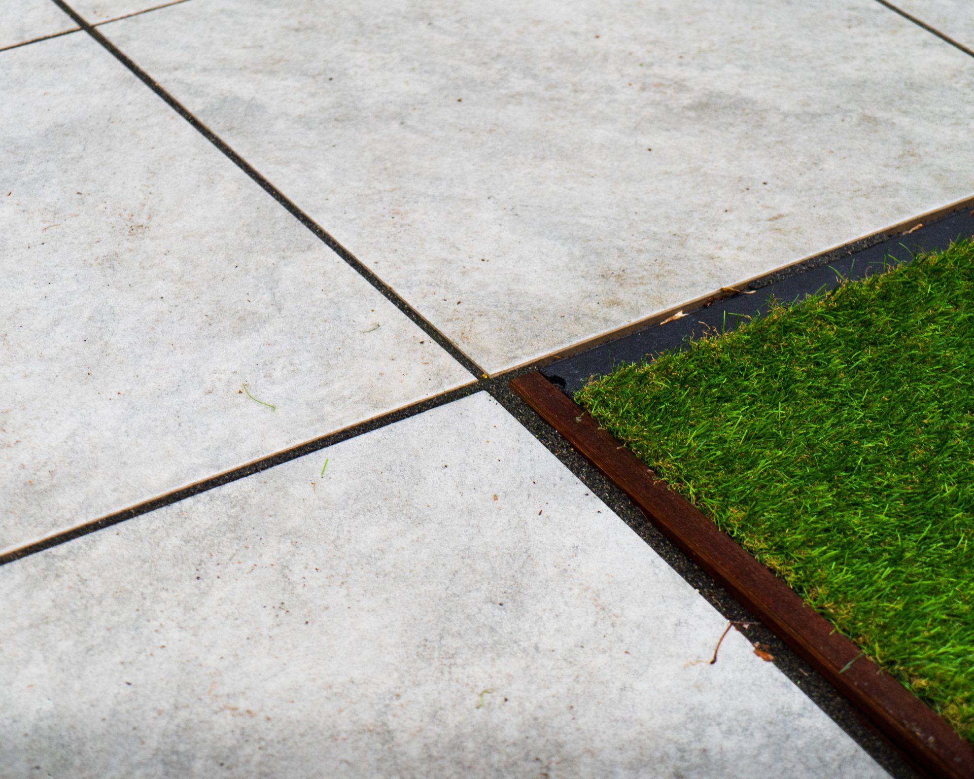 Voor- en achtertuin met keramiek tegels, hardhouten verhoogde bloembakken, gras, trellis schuttingen en sfeervolle verlichting.