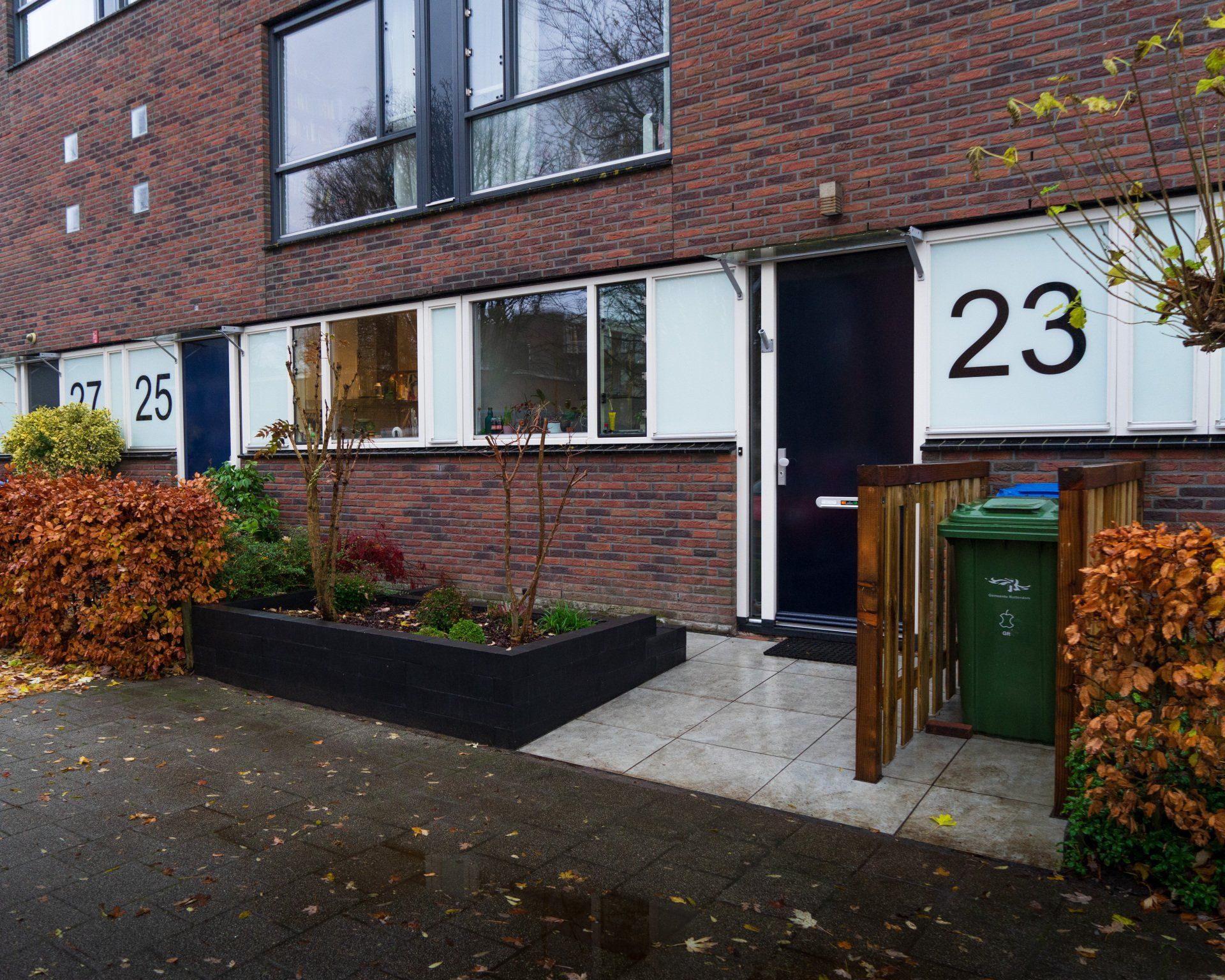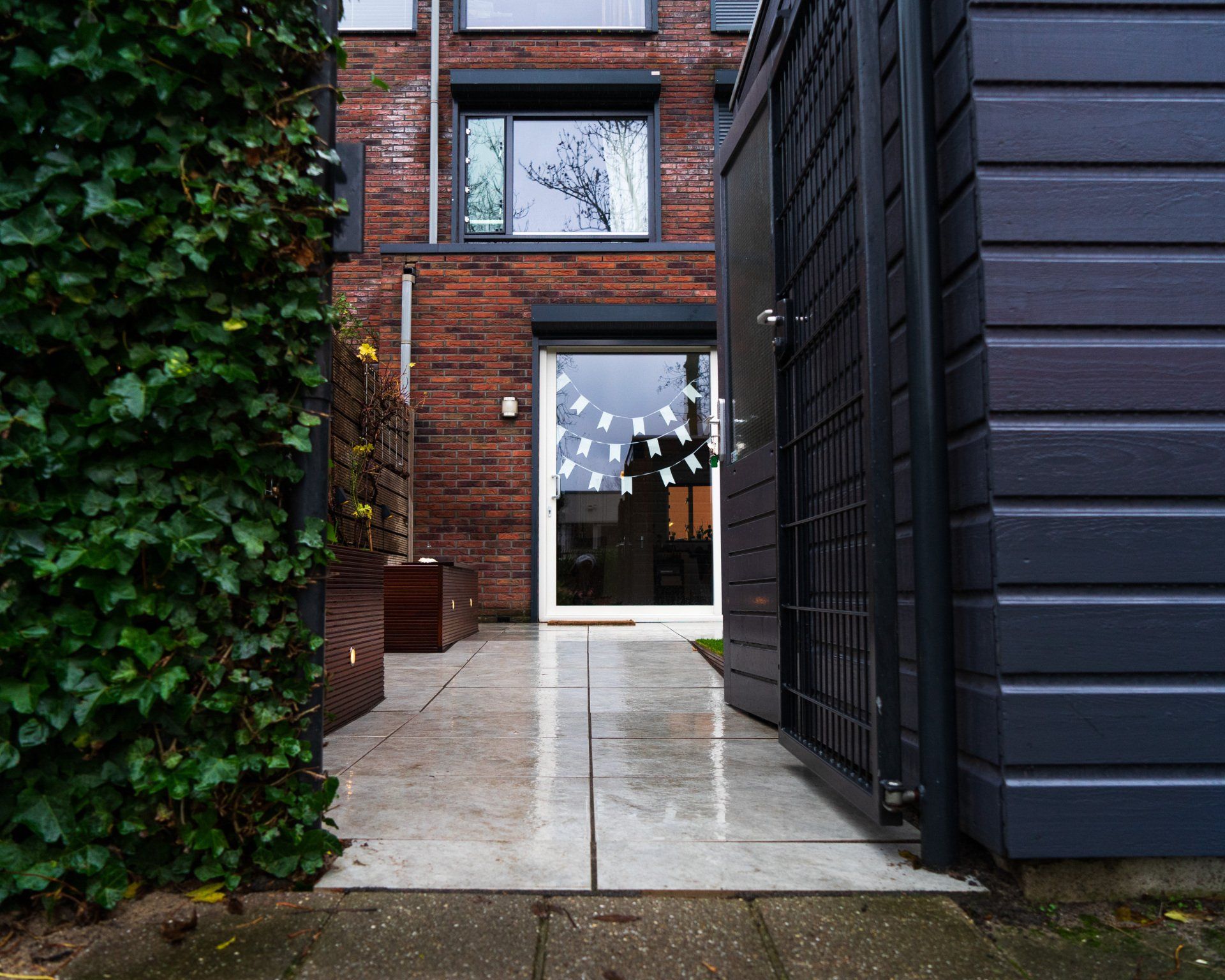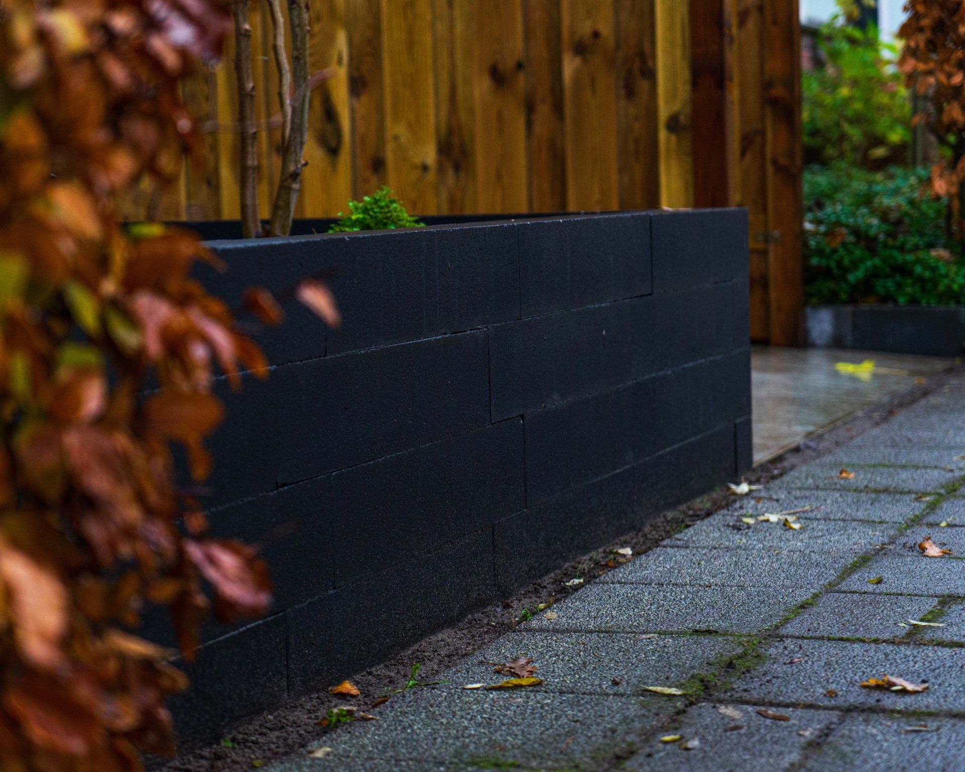 In de voortuin is gekozen voor verhoogde lineablokken bloembakken.
