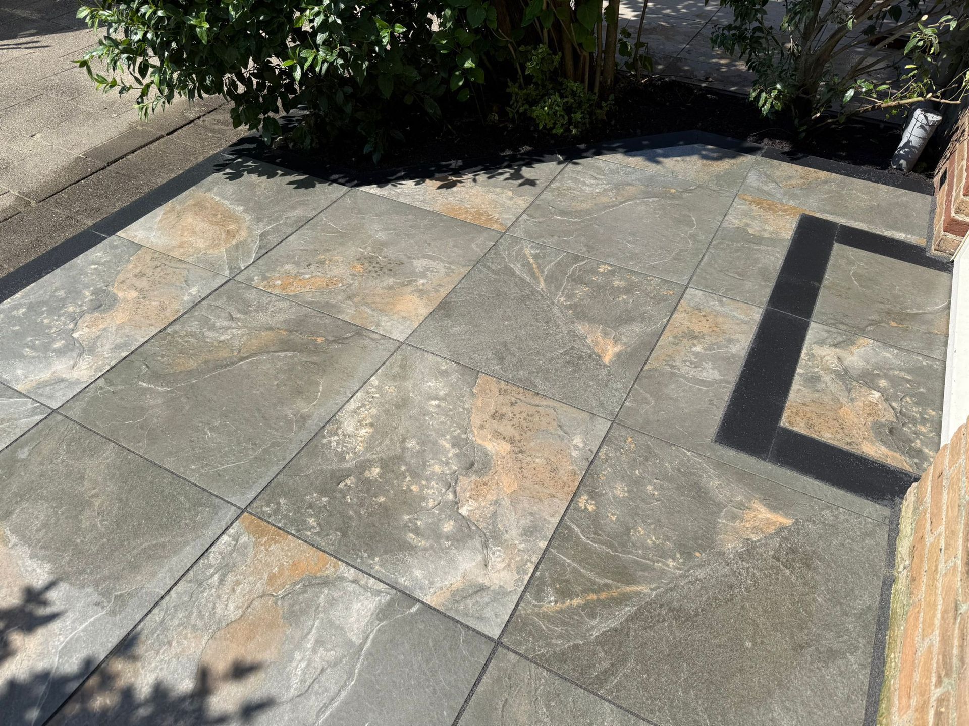 Deze voortuin is stijlvol aangelegd met de Redsun keramische tegel Varese Antracite Due in het formaat 60 x 60 x 3 cm. De tegel heeft de uitstraling van natuursteen, maar biedt de kwaliteit en het gemak van keramiek. Dankzij het fraaie patroon en de subtiel ingeslepen afwerking oogt de bestrating modern en hoogwaardig.