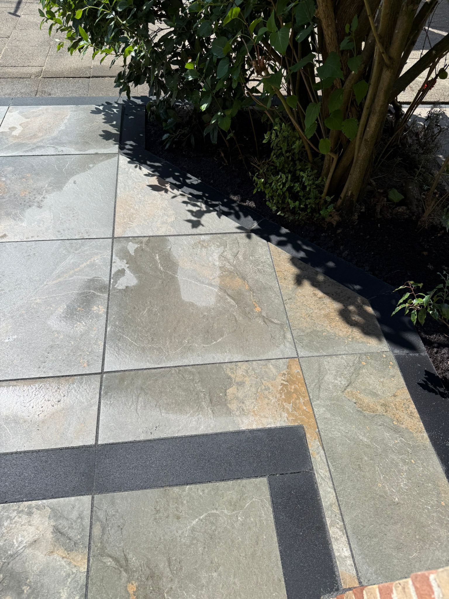 De bestrating wordt strak omlijst met linea blokken, wat zorgt voor een duidelijk kader en een verzorgde uitstraling.