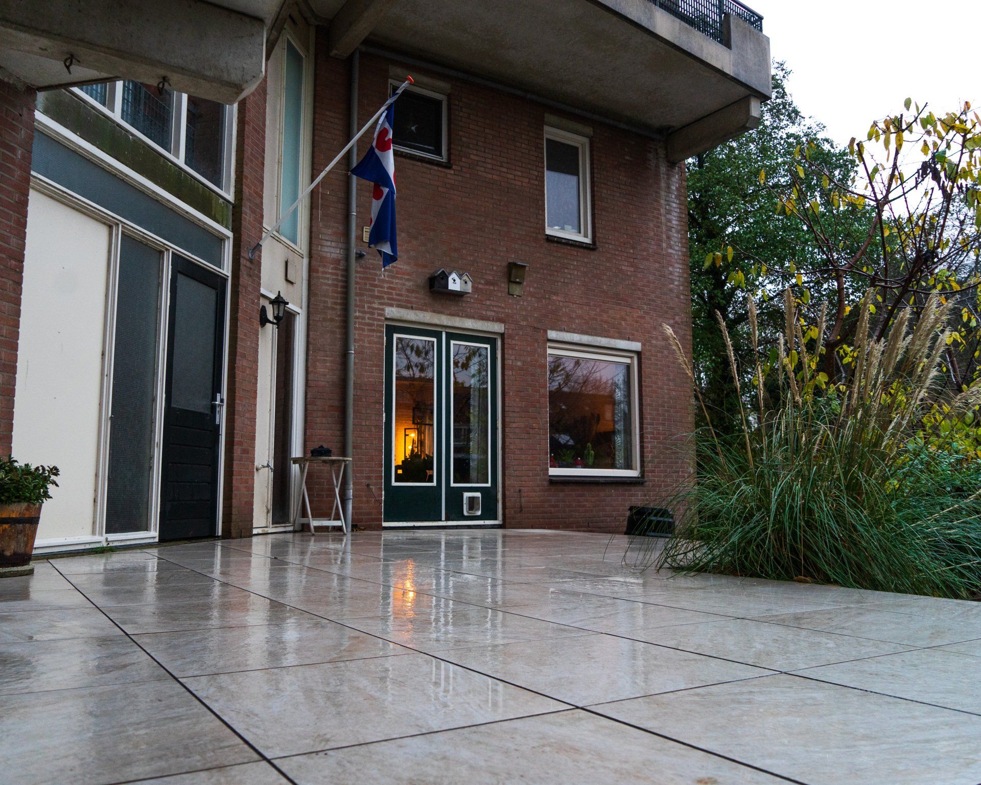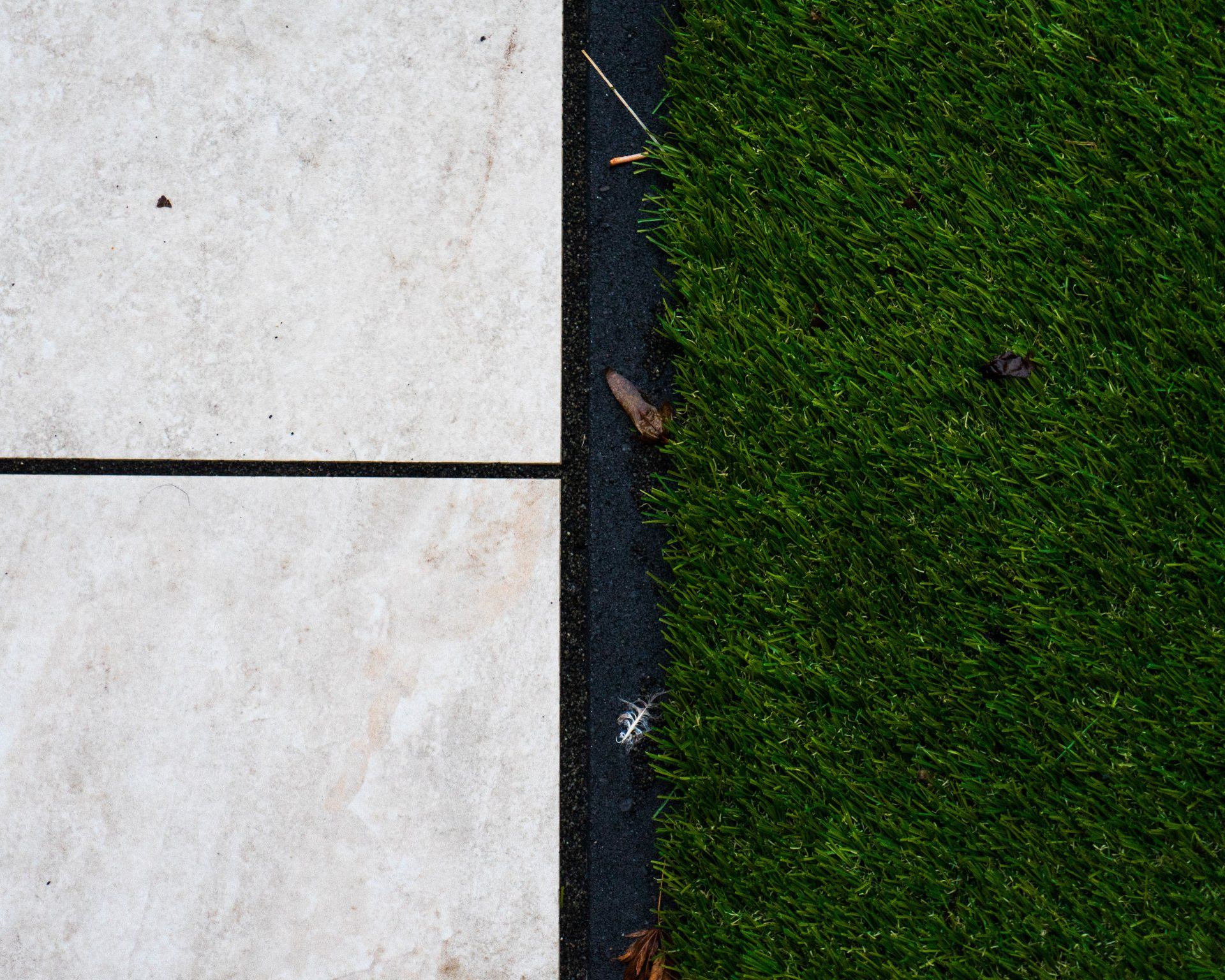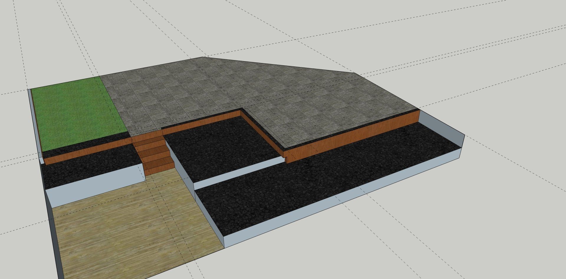 Keramiek tegels, gevoegd gelegd, geen onkruid meer tussen de tegels! Kunstgras en een trapje van hardhout naar de lager gelegen vlonder.