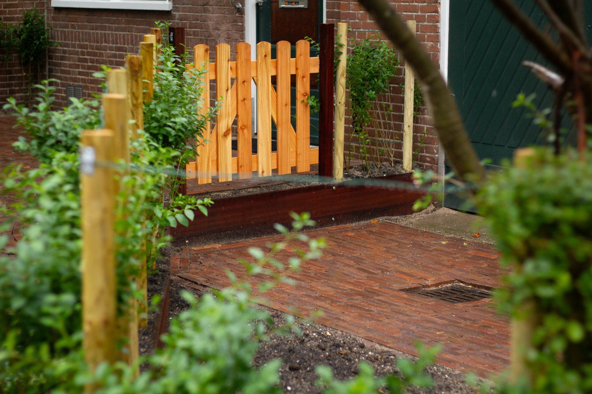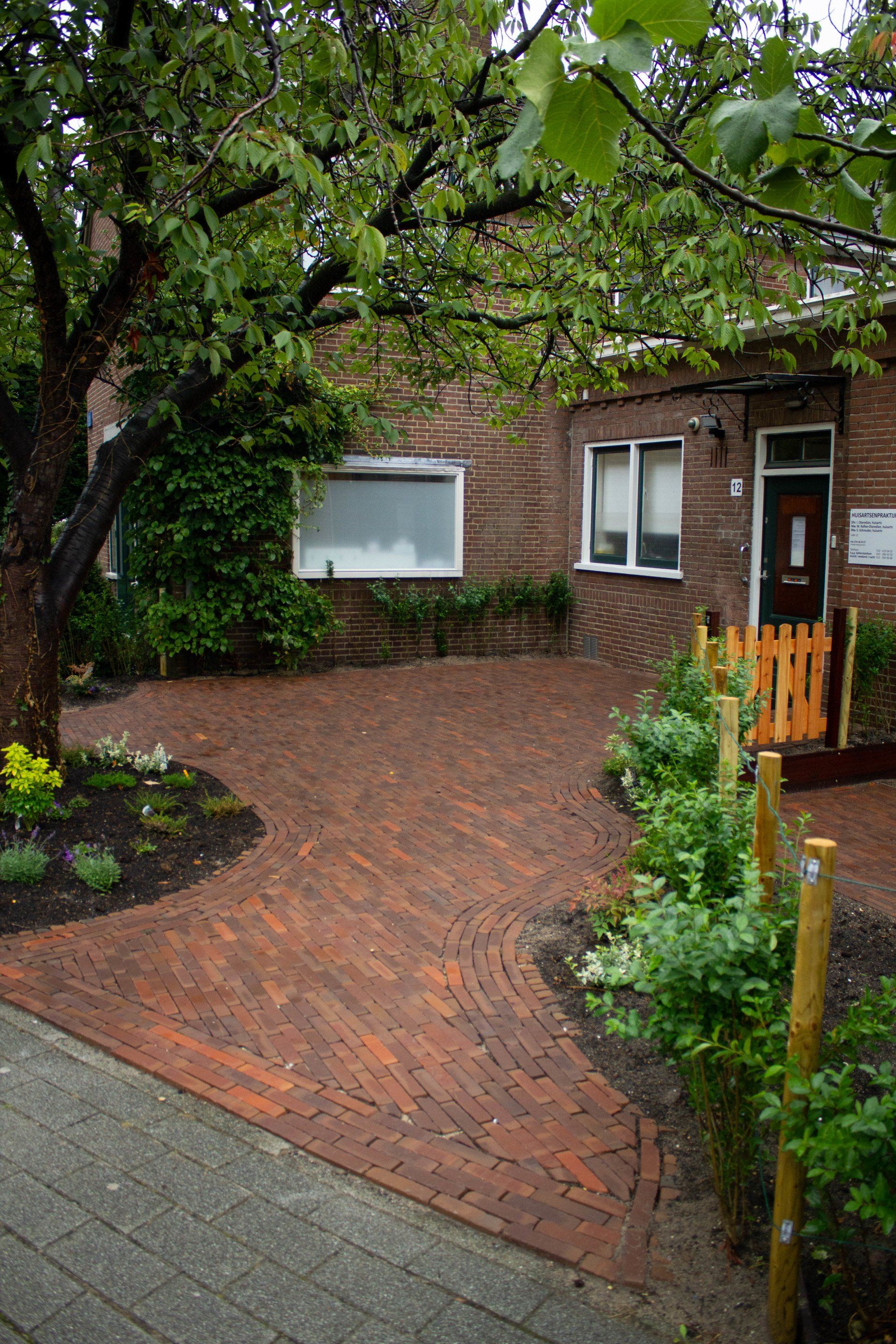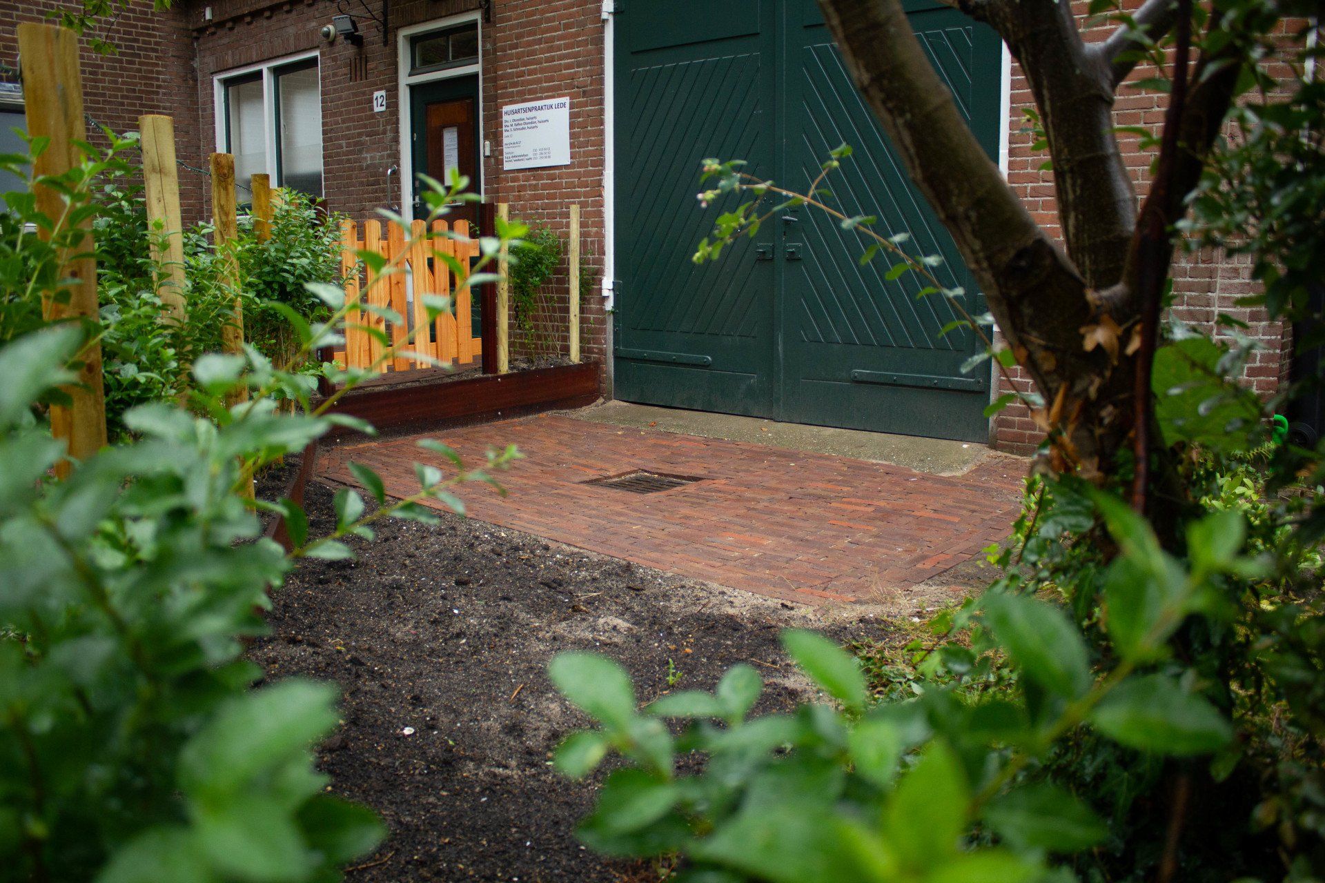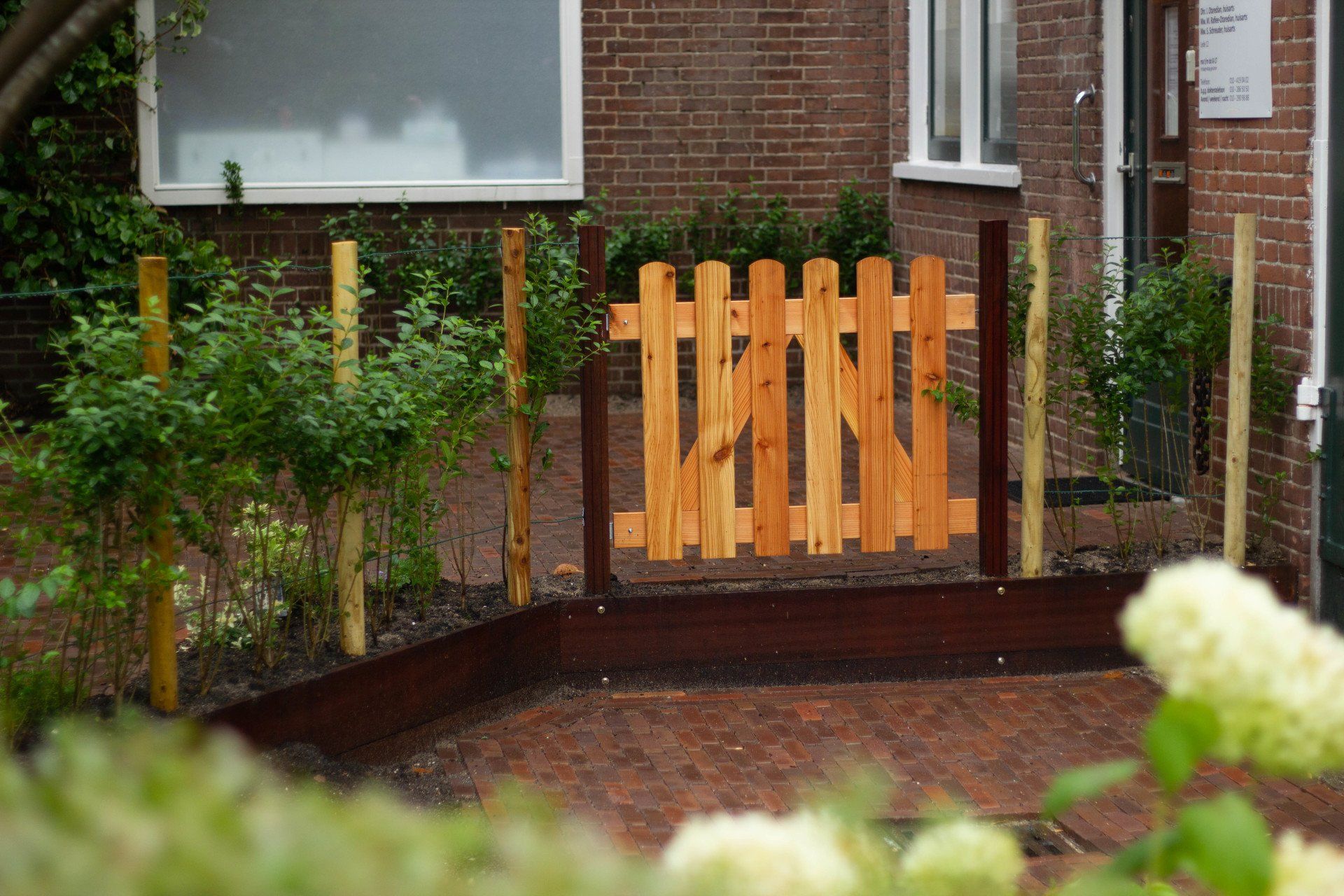 Praktijk ingang op een speelse manier bestraat met waaltjes. Afgezet met hekwerk en hardhouten beschoeiing.
