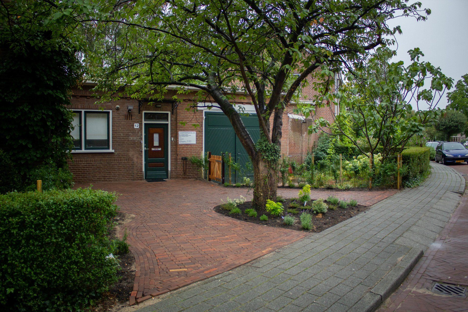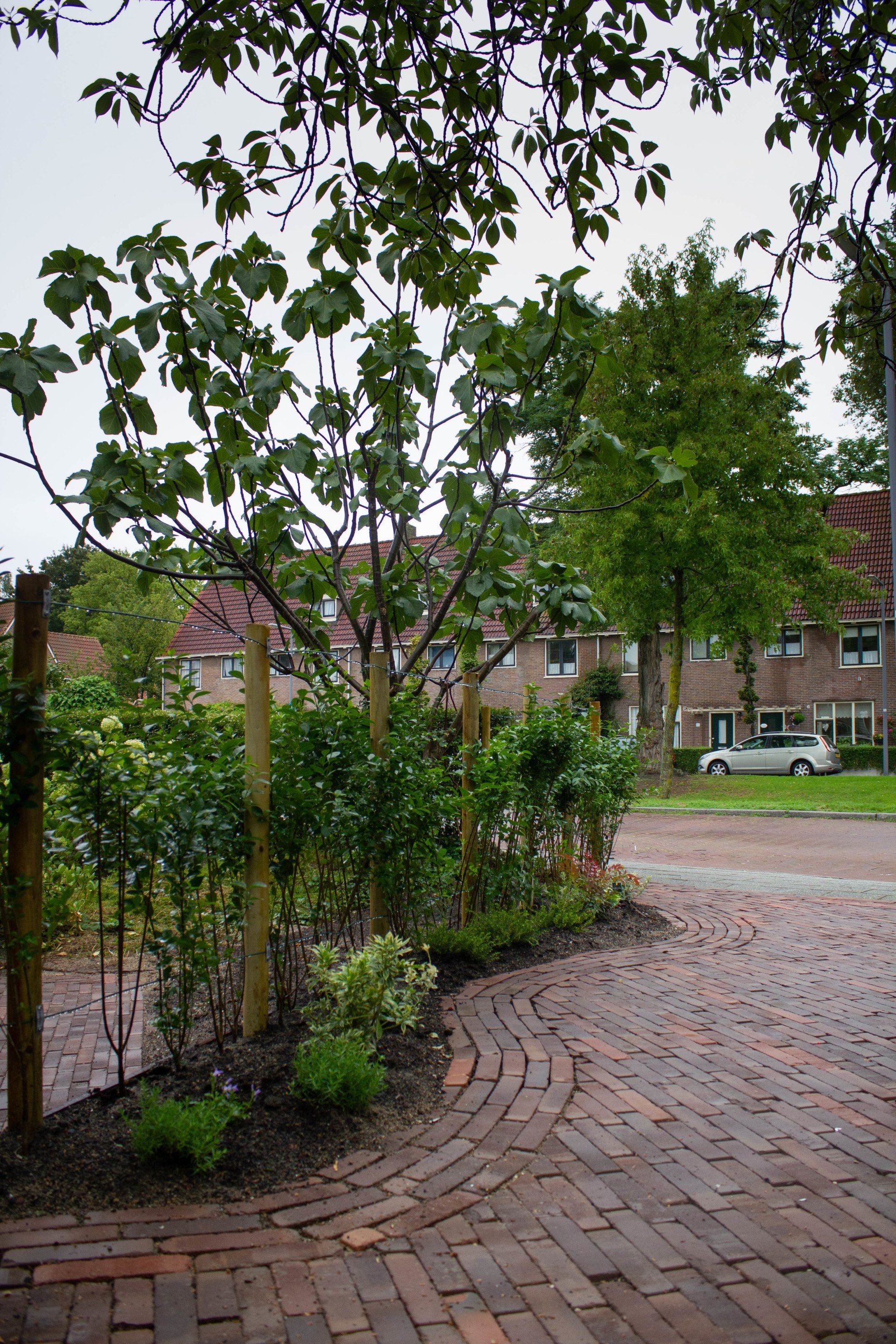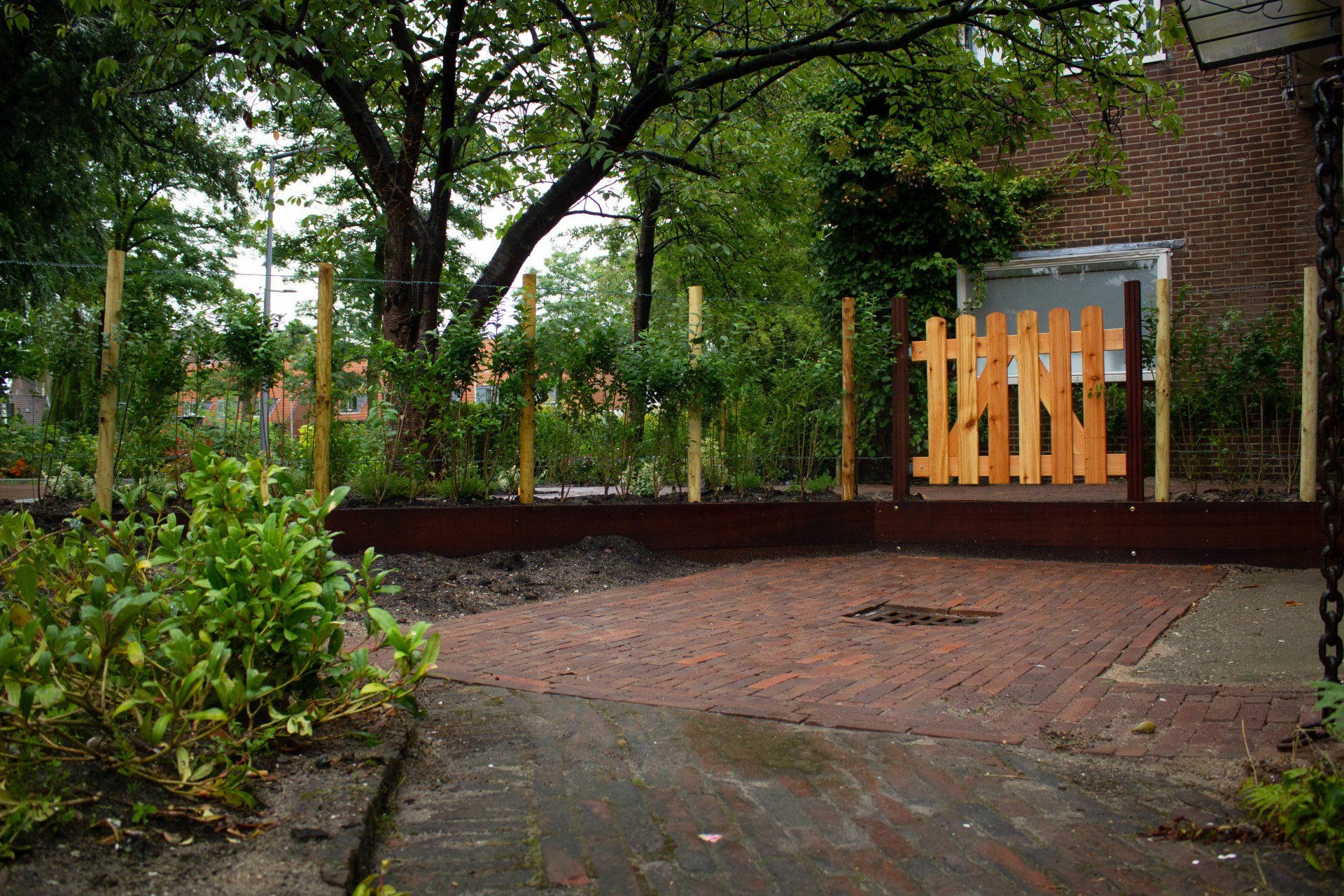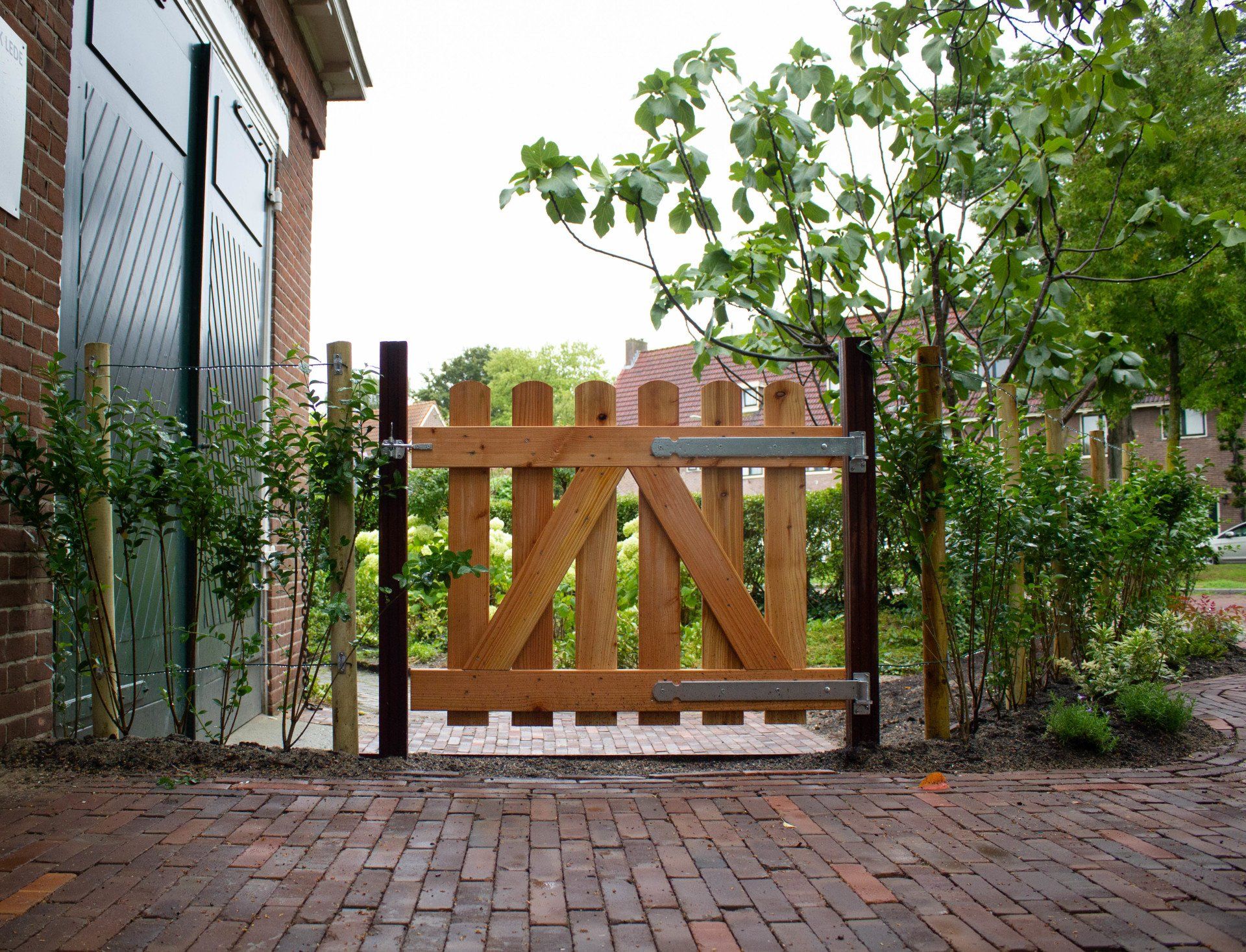 Praktijk ingang op een speelse manier bestraat met waaltjes. Afgezet met hekwerk en hardhouten beschoeiing.
