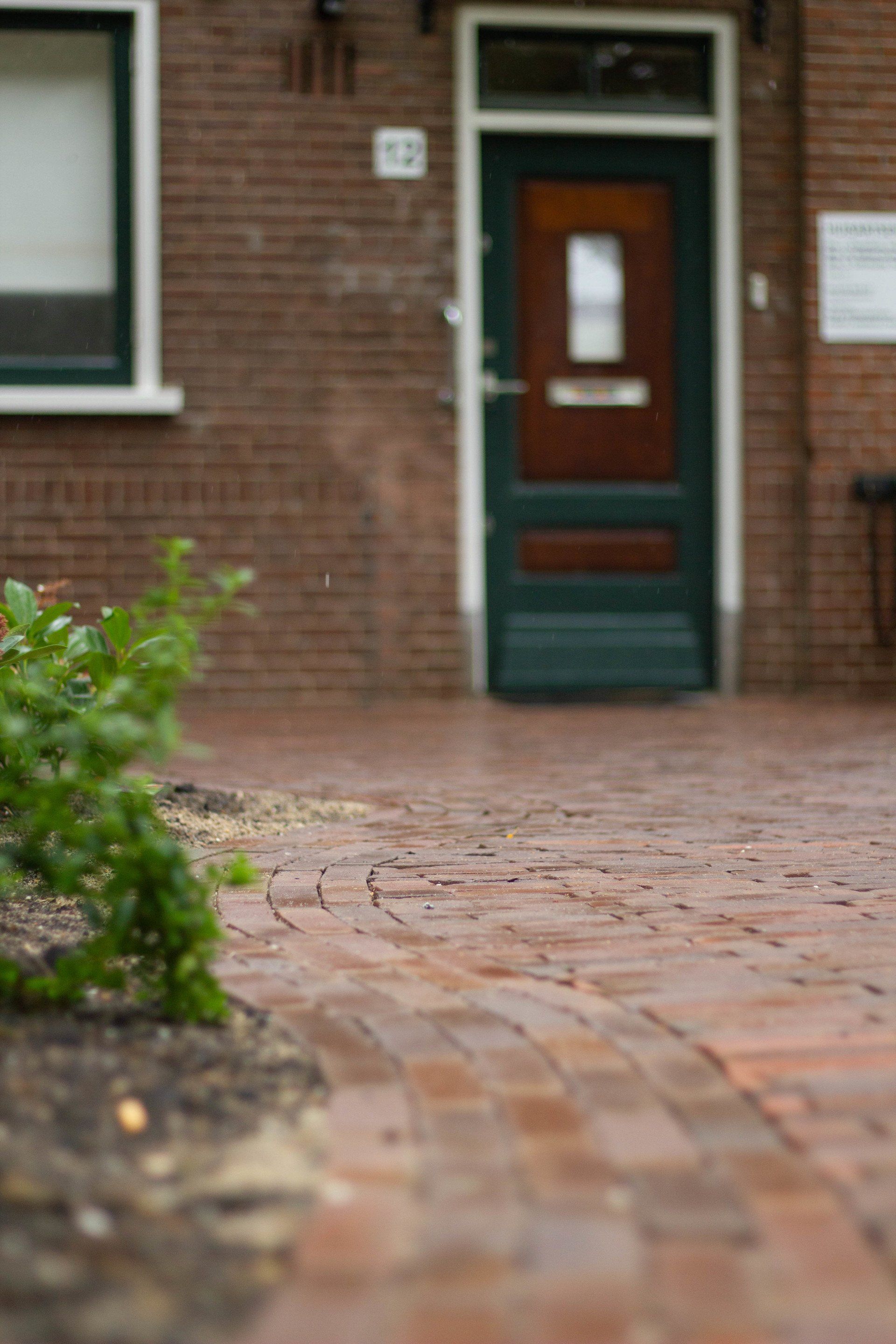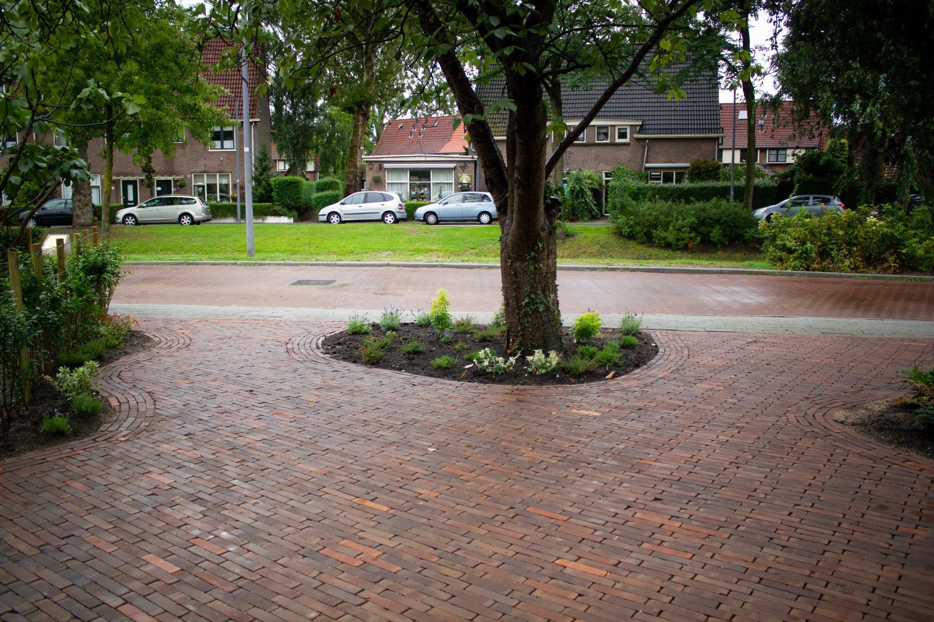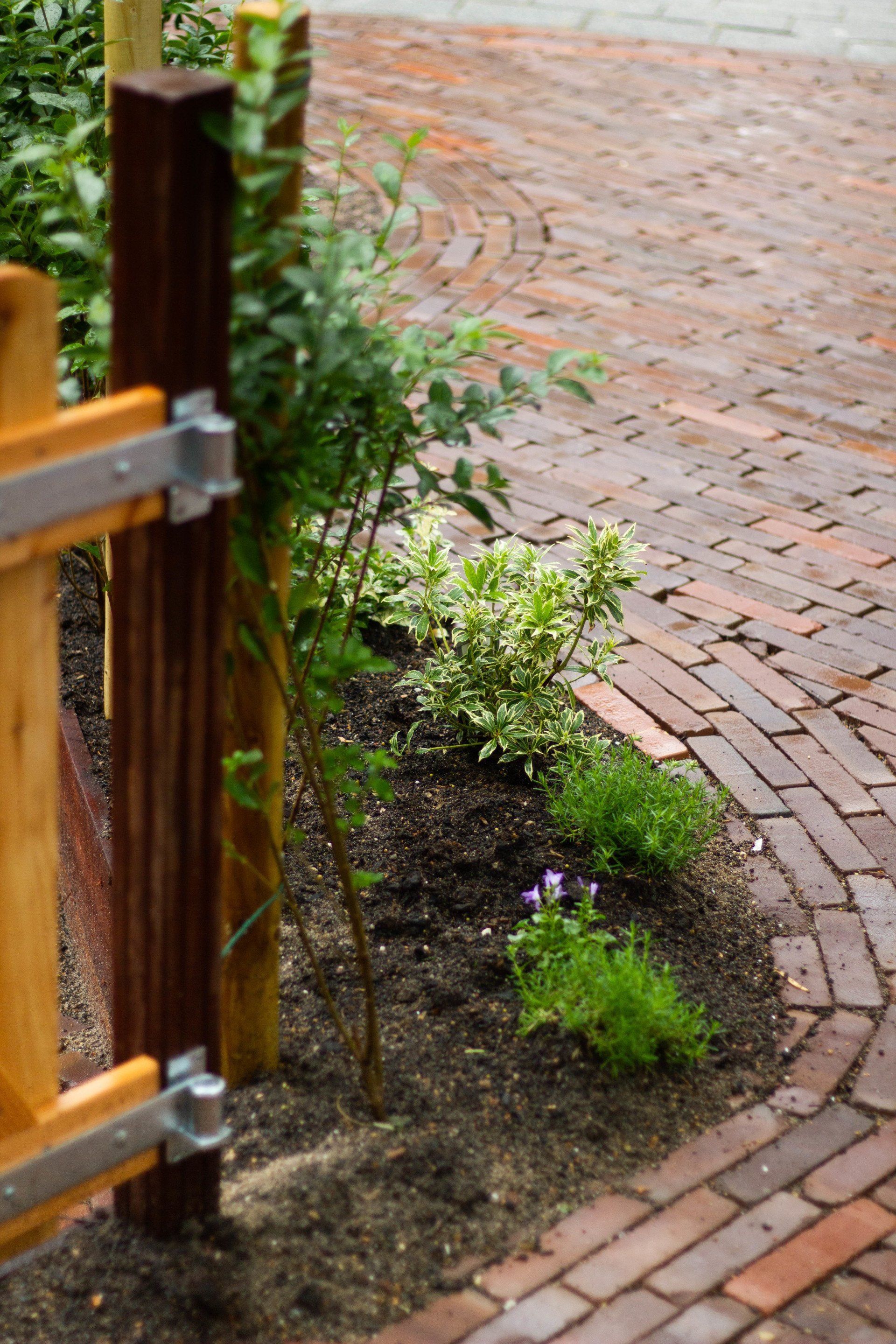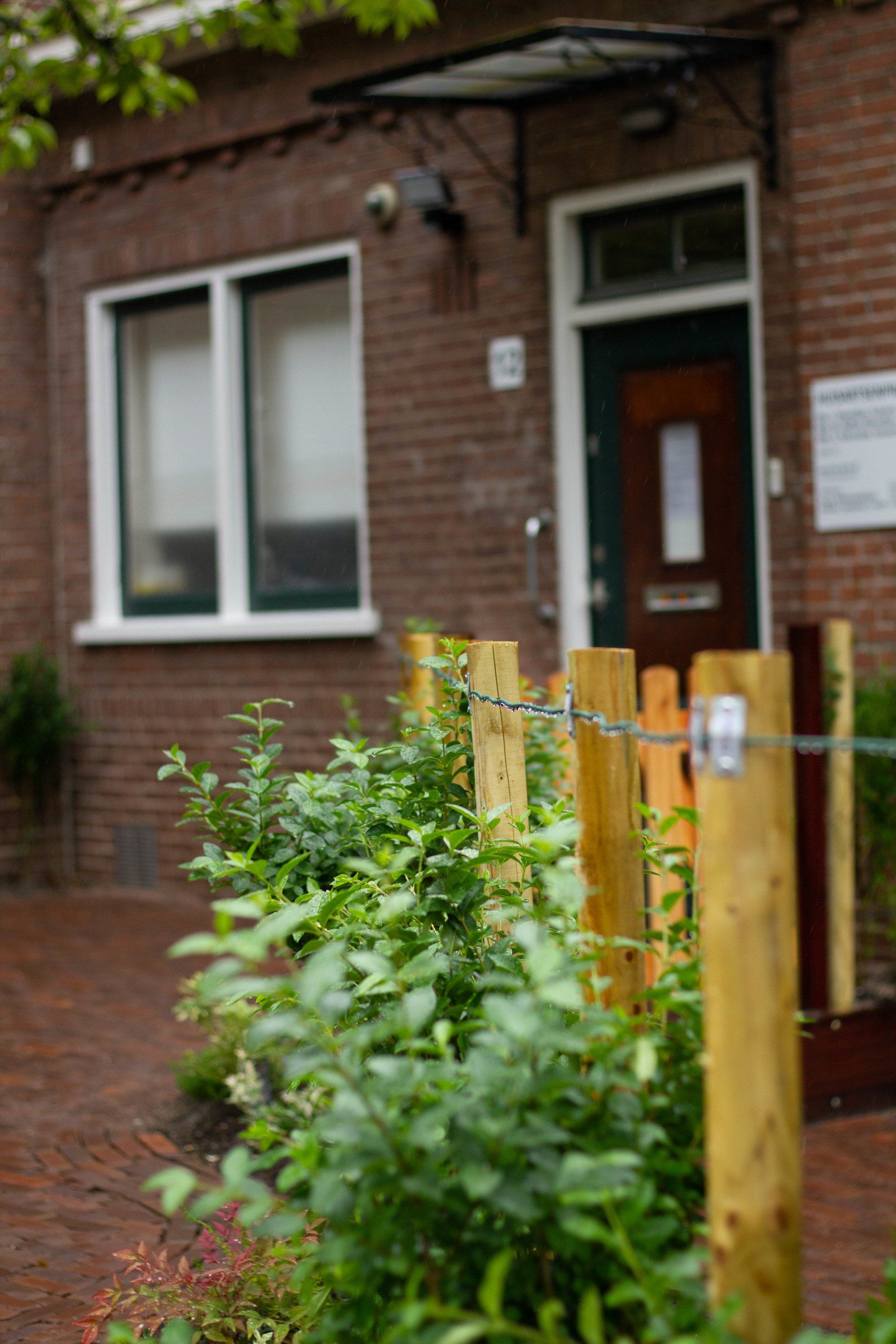 Praktijk ingang op een speelse manier bestraat met waaltjes. Afgezet met hekwerk en hardhouten beschoeiing.