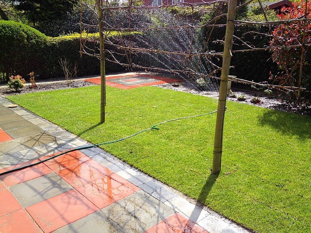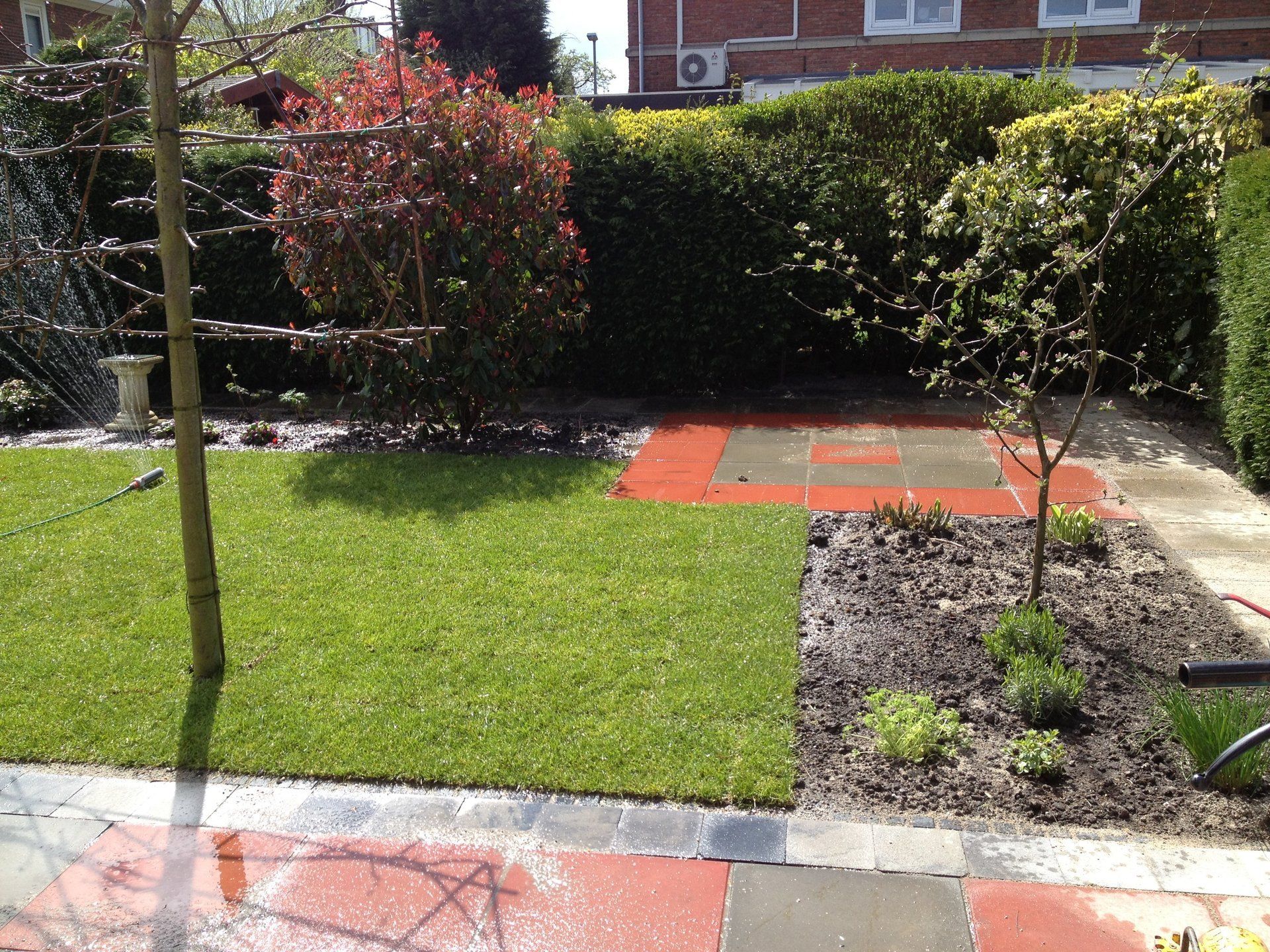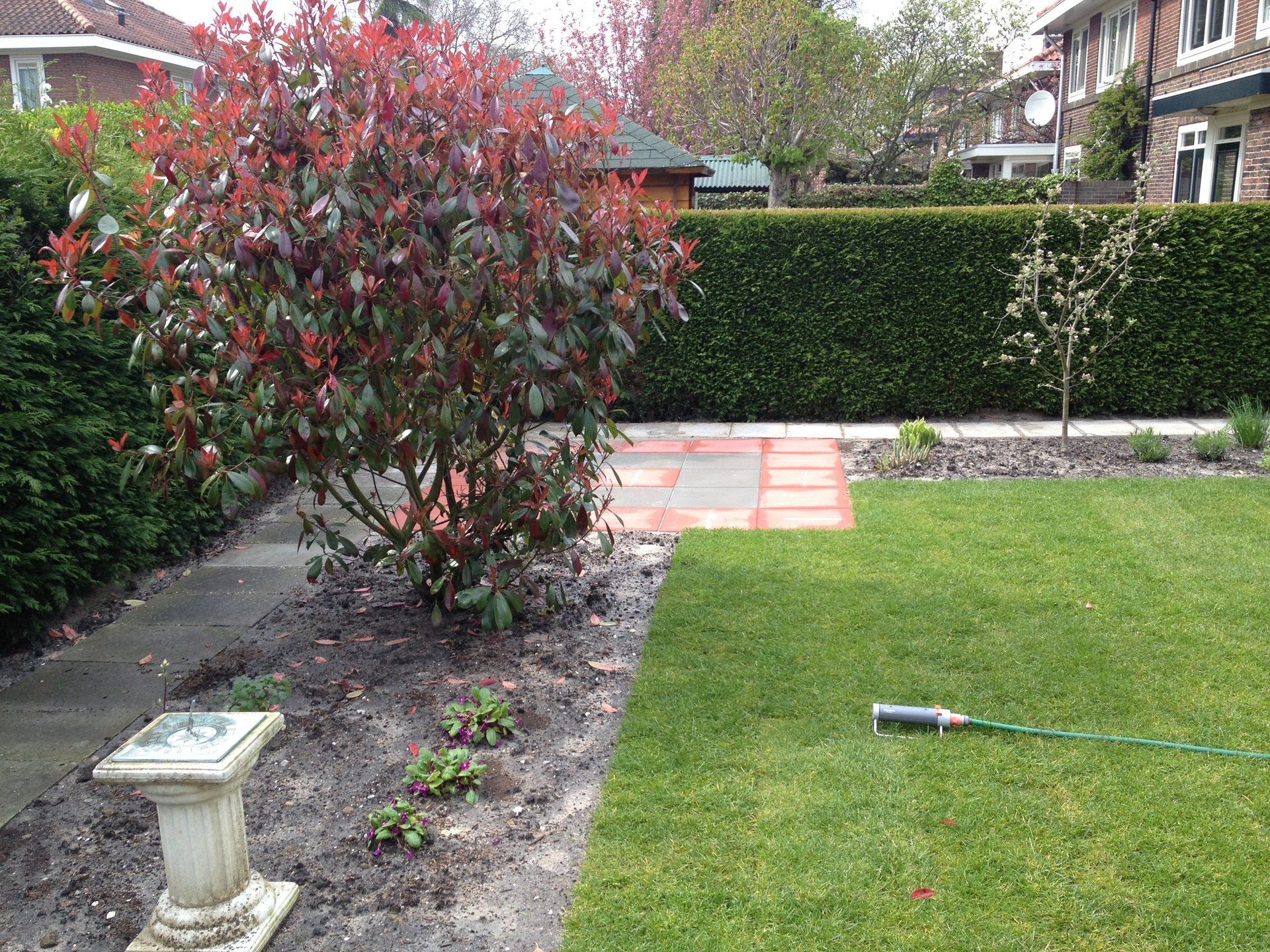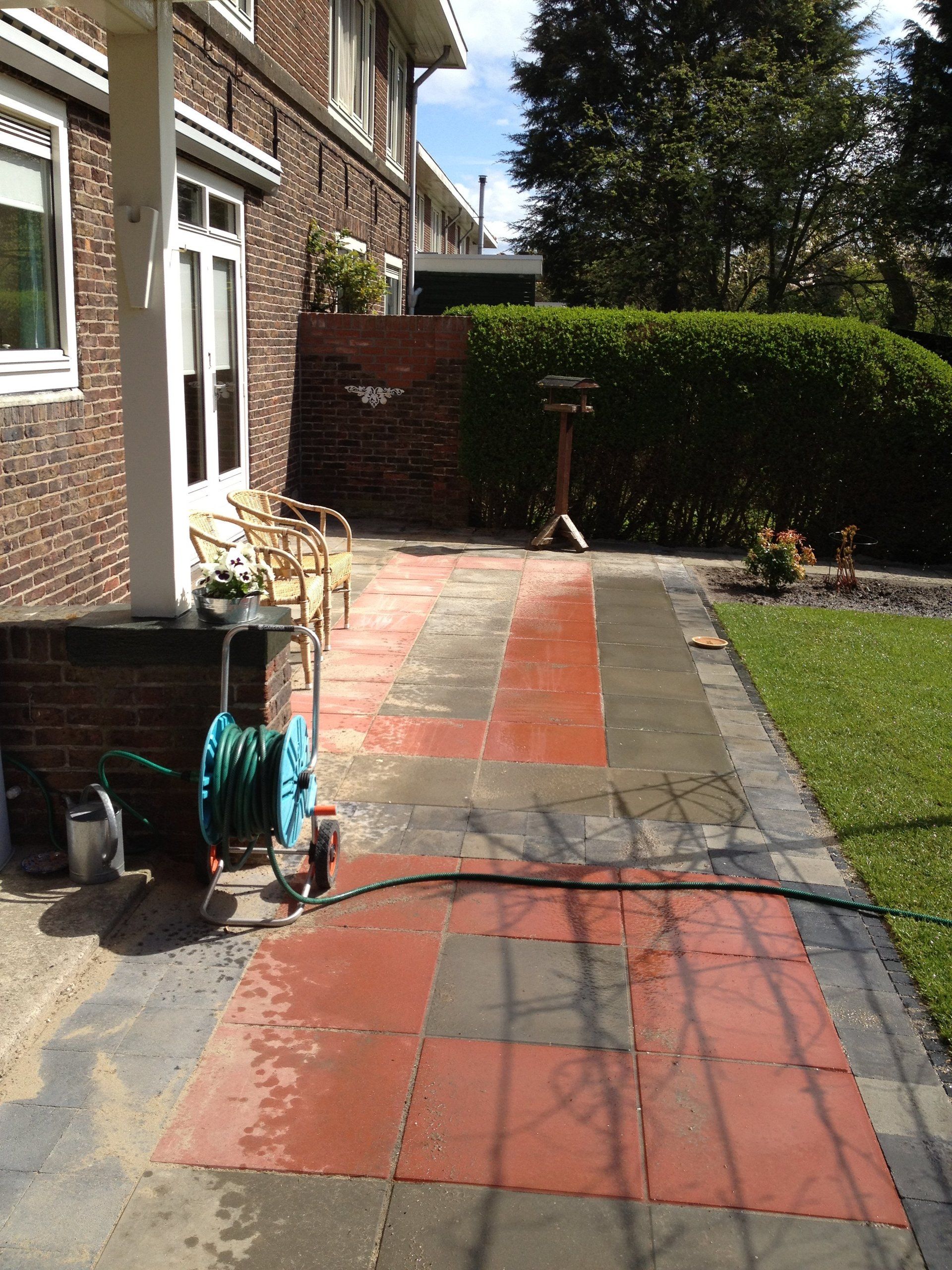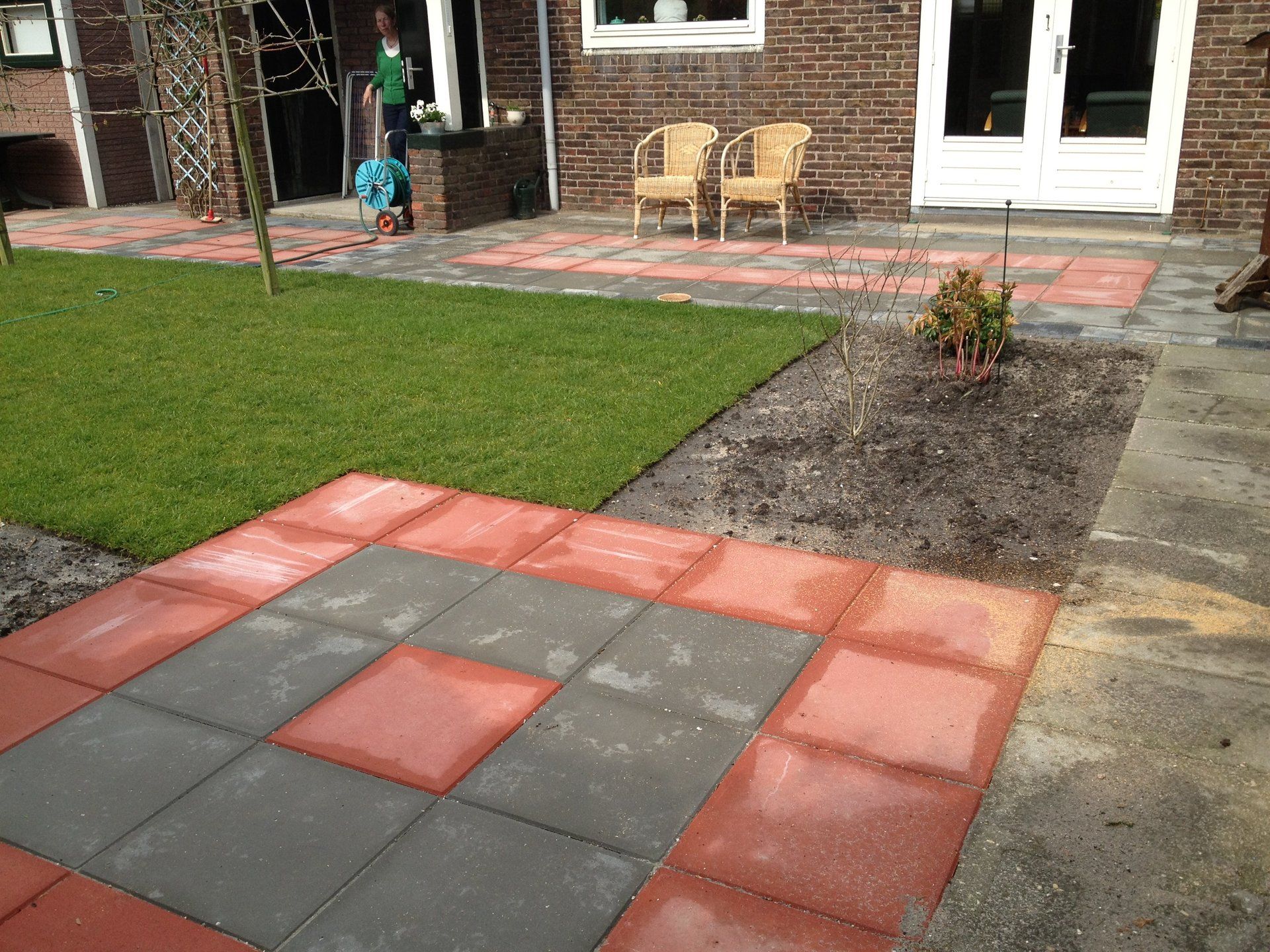 Leuk gecombineerd! Grijze en rode tegels in vierkanten en rechthoeken. Samen met een nieuwe grasmat maakt deze tuin weer helemaal netjes en kan weer jaren mee!