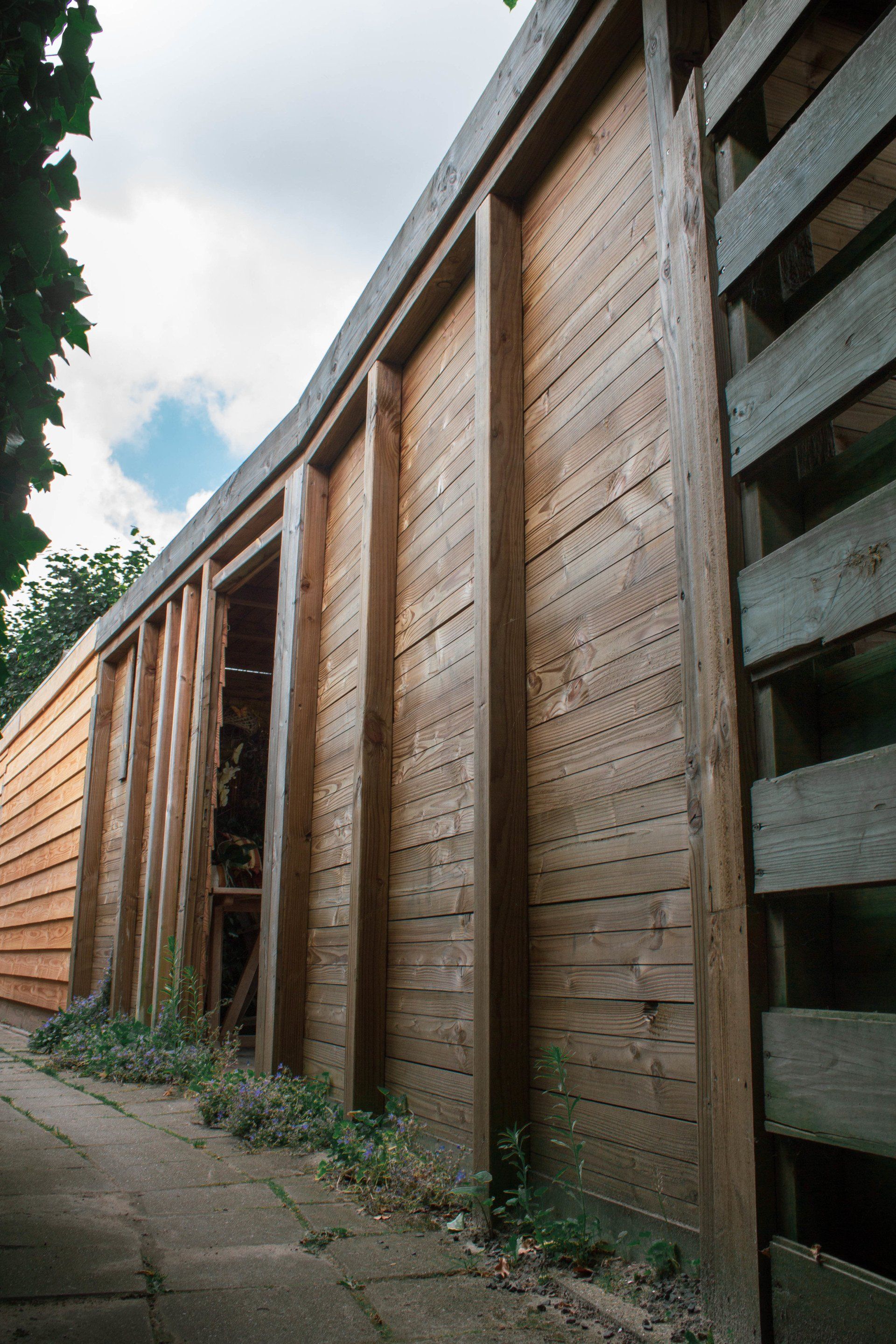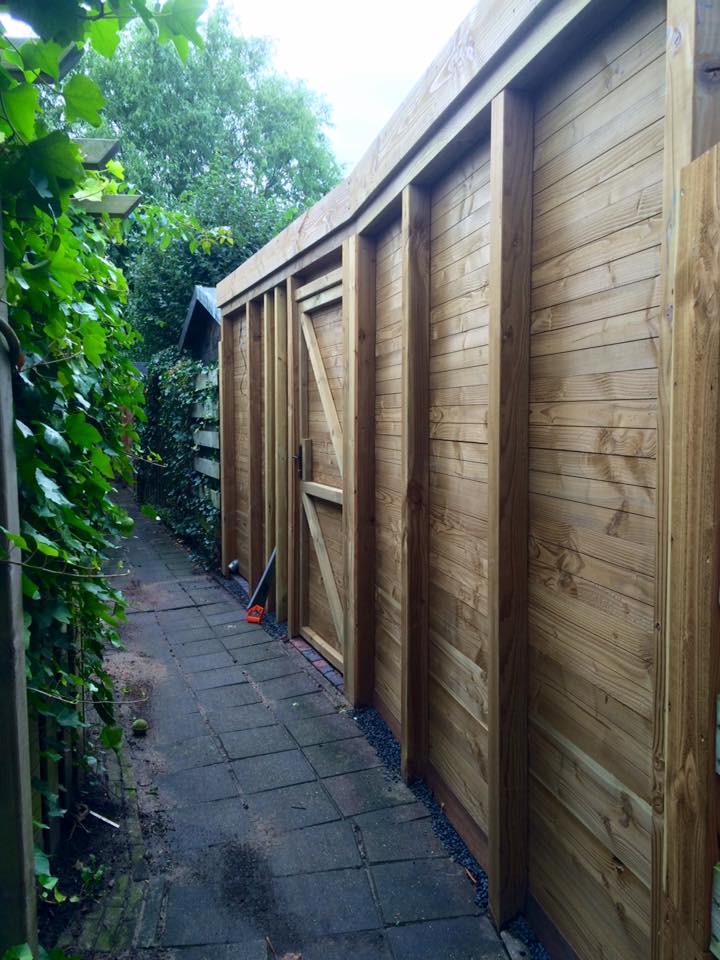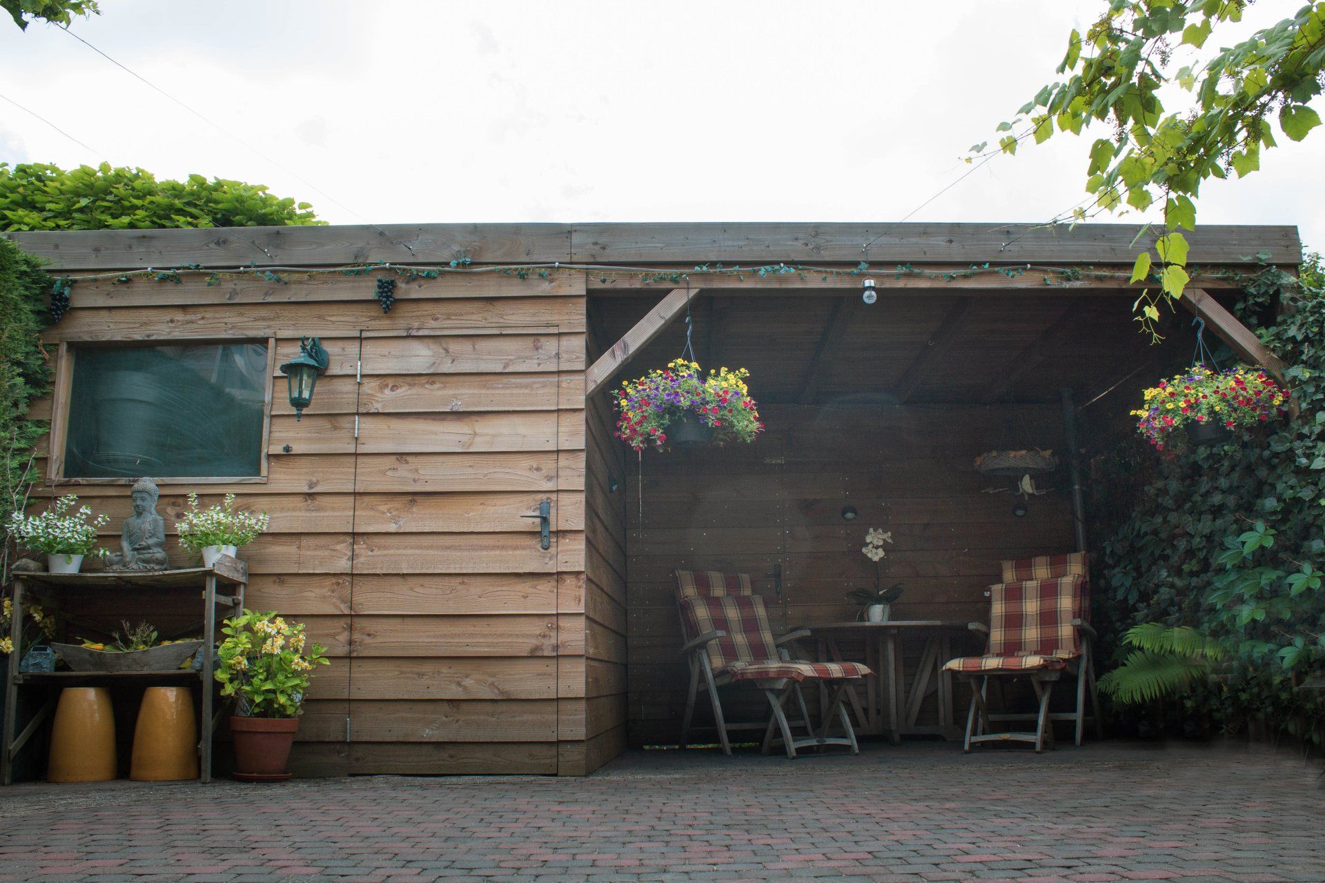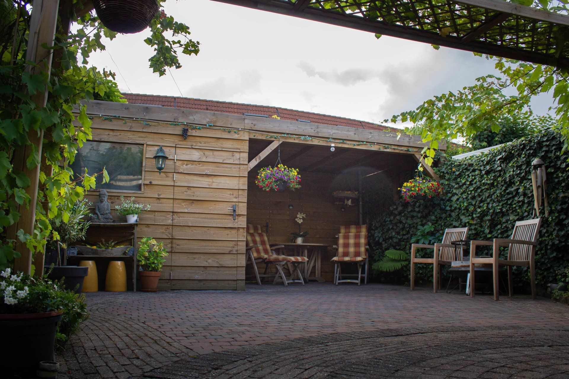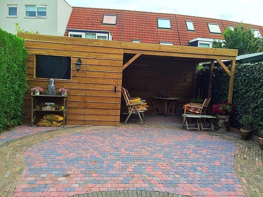 Bij deze overkapping is de deur naar het achterpad geïntrigeerd. De schuur, alsmede de overkapping is van Zweeds rabat met douglas palen. De bestrating is deels hergebruikt en deels nieuw. Met mooie verlichting!