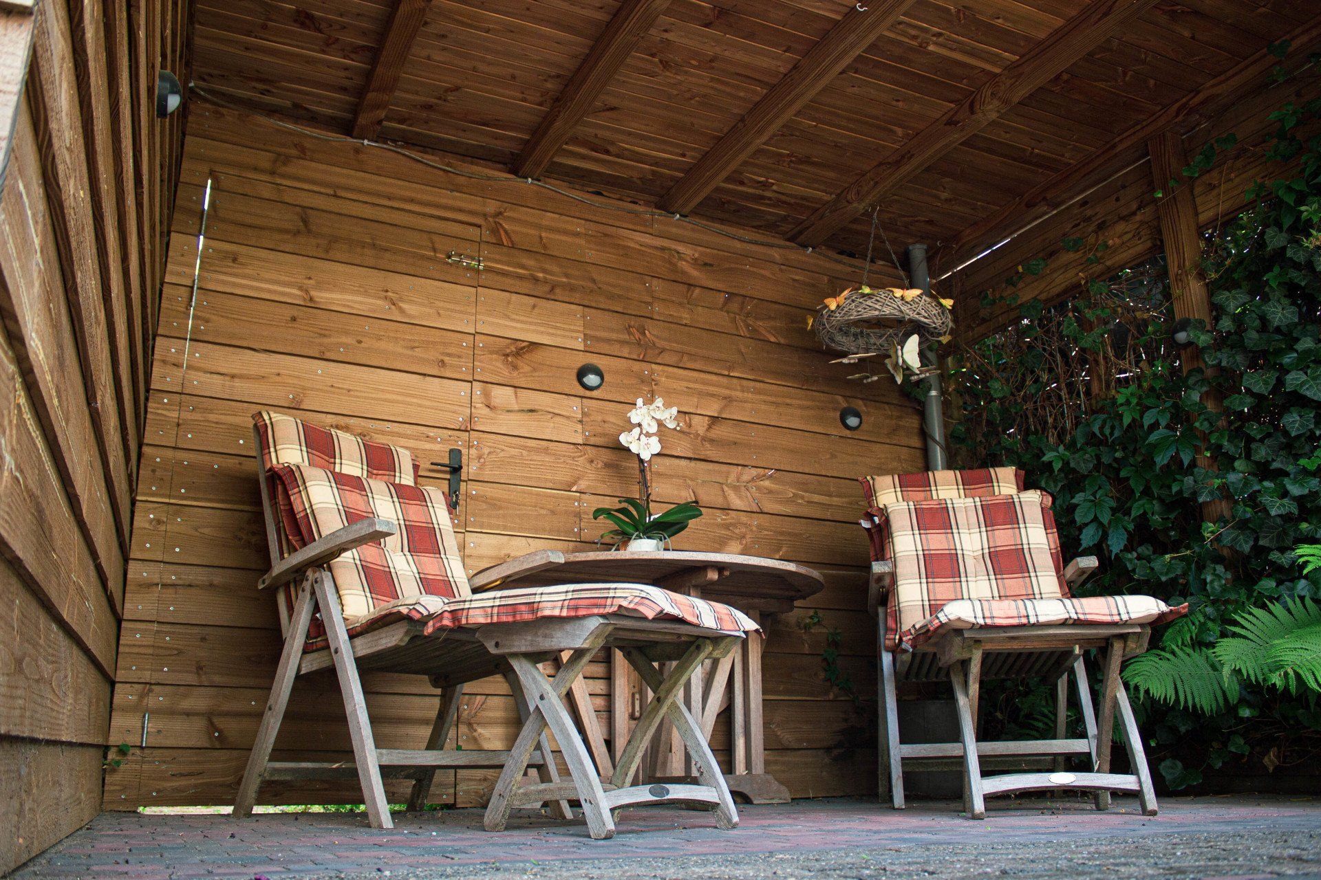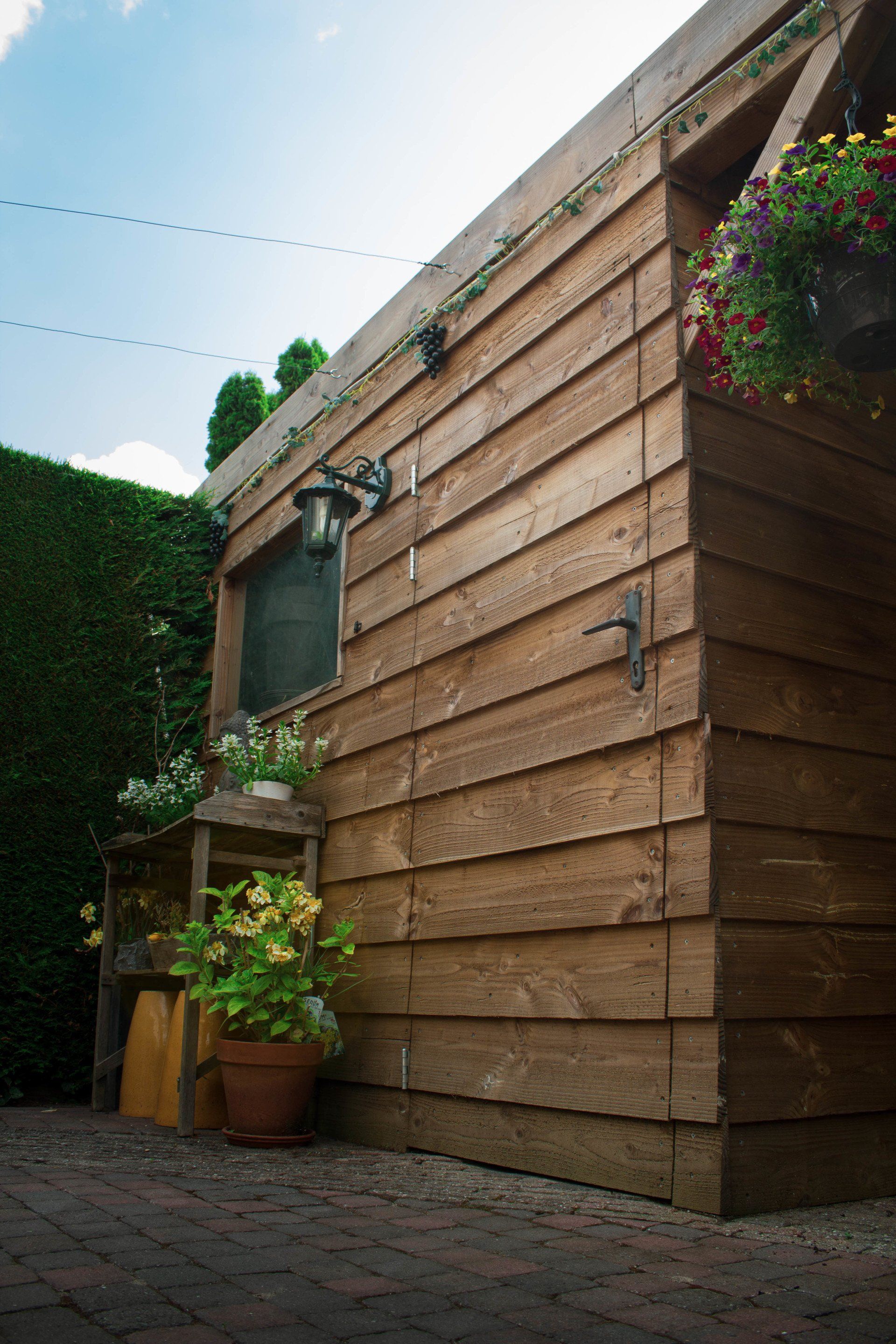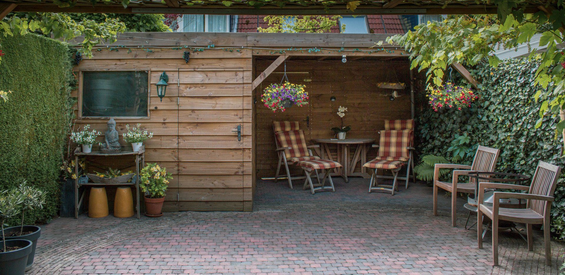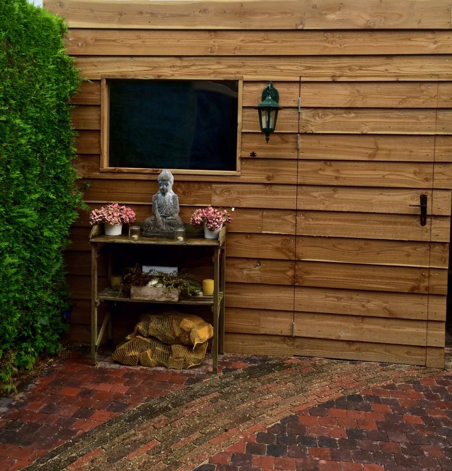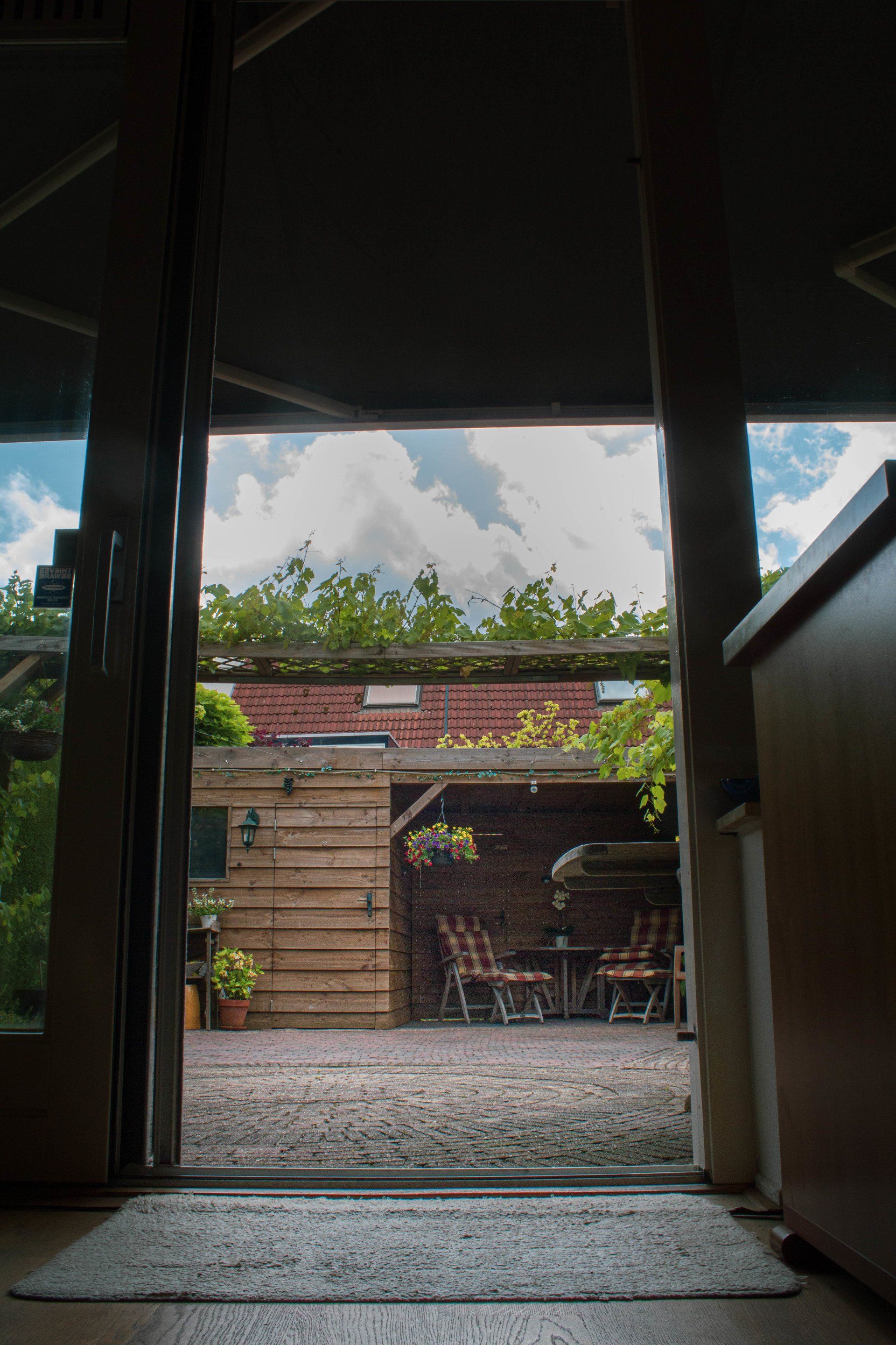 Bij deze overkapping is de deur naar het achterpad geïntrigeerd. De schuur, alsmede de overkapping is van Zweeds rabat met douglas palen. De bestrating is deels hergebruikt en deels nieuw. Met mooie verlichting!