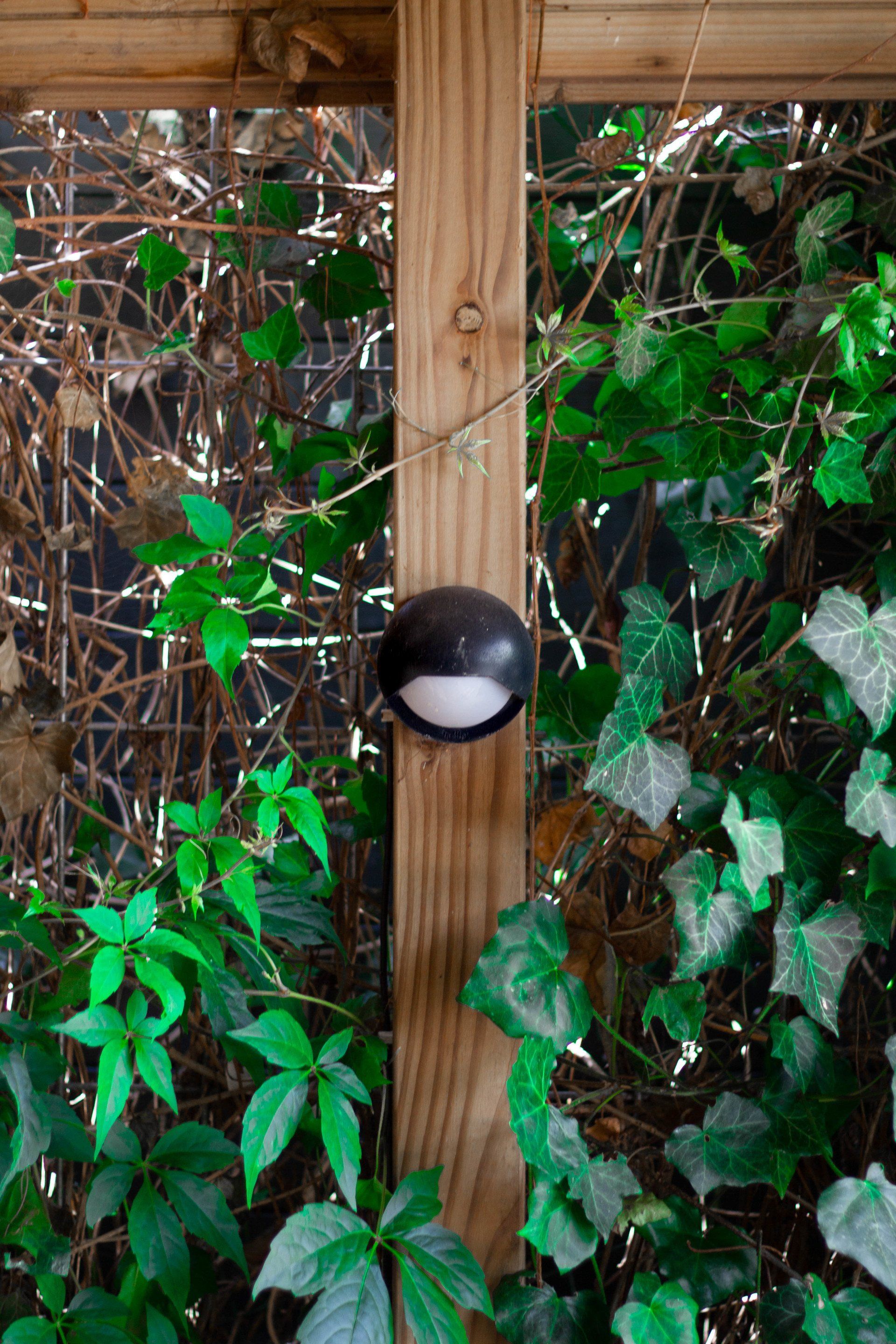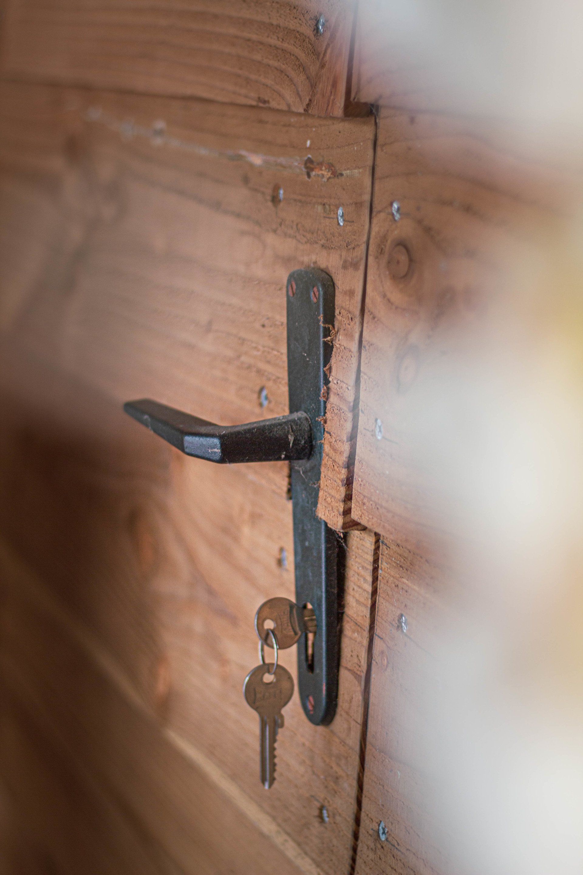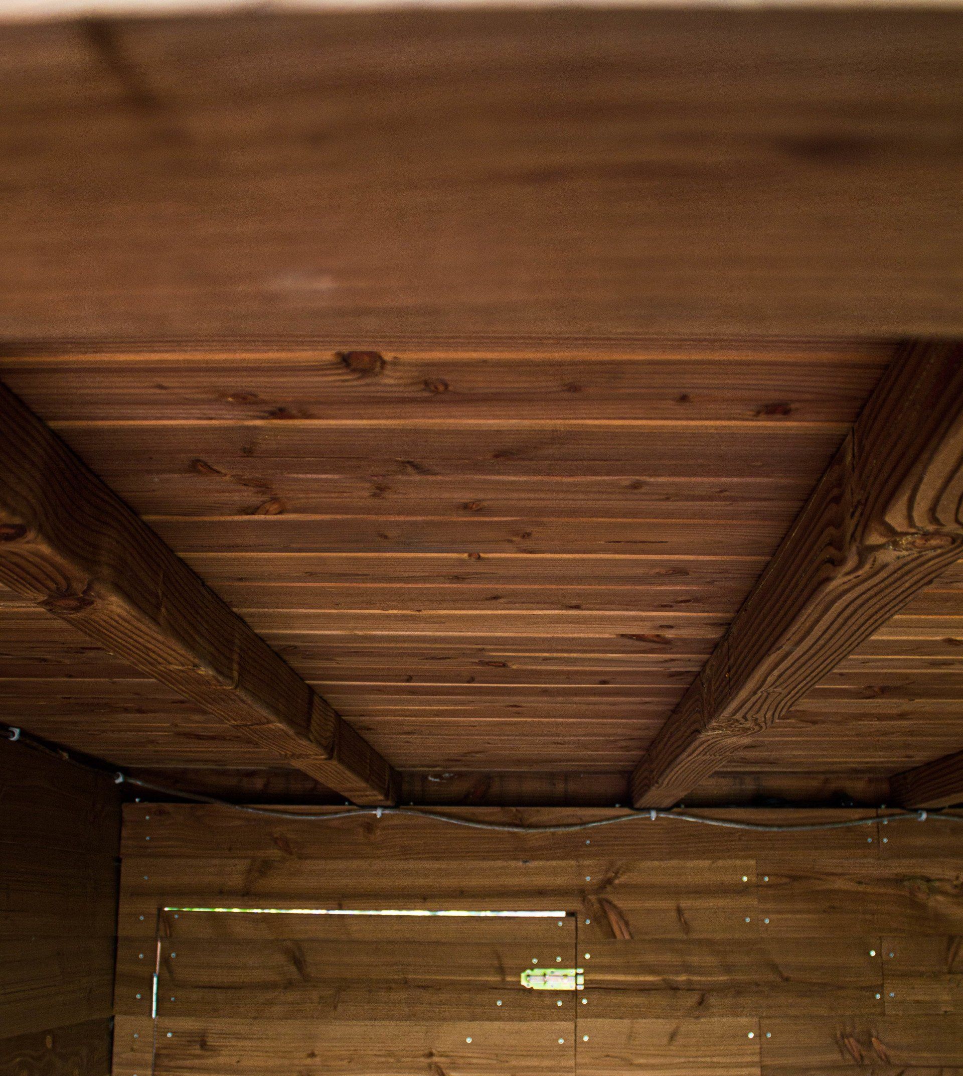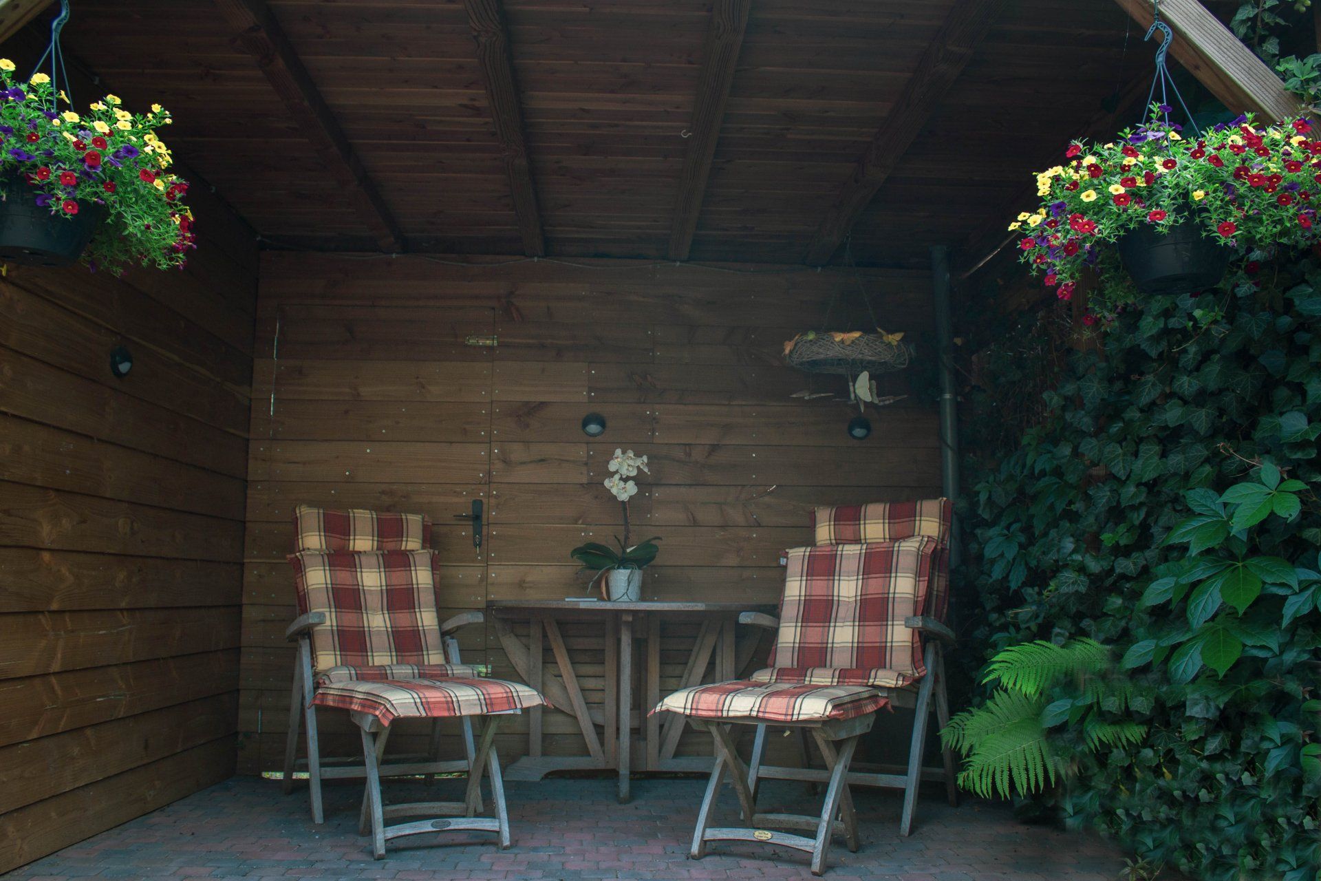 Bij deze overkapping is de deur naar het achterpad geïntrigeerd. De schuur, alsmede de overkapping is van Zweeds rabat met douglas palen. De bestrating is deels hergebruikt en deels nieuw. Met mooie verlichting!