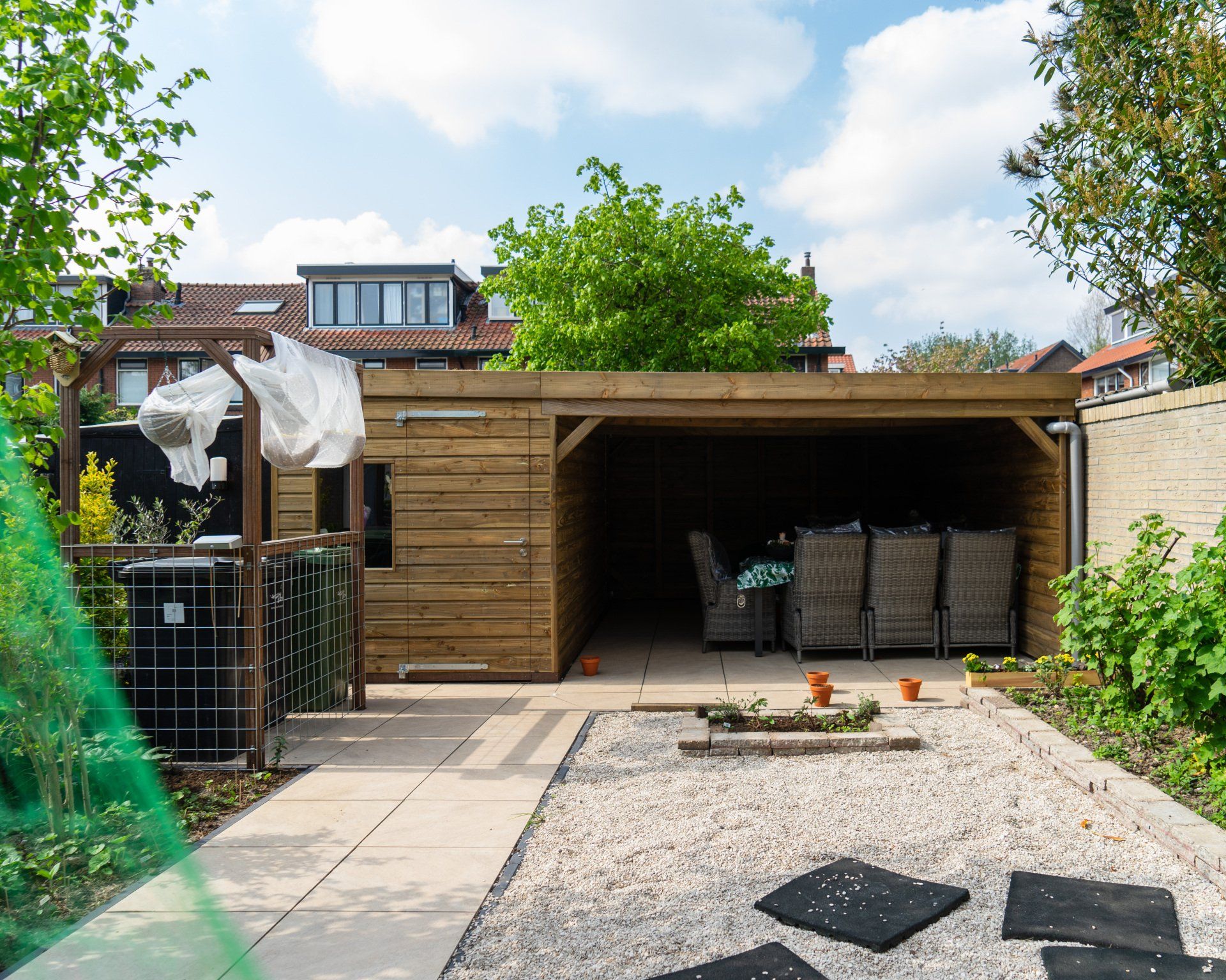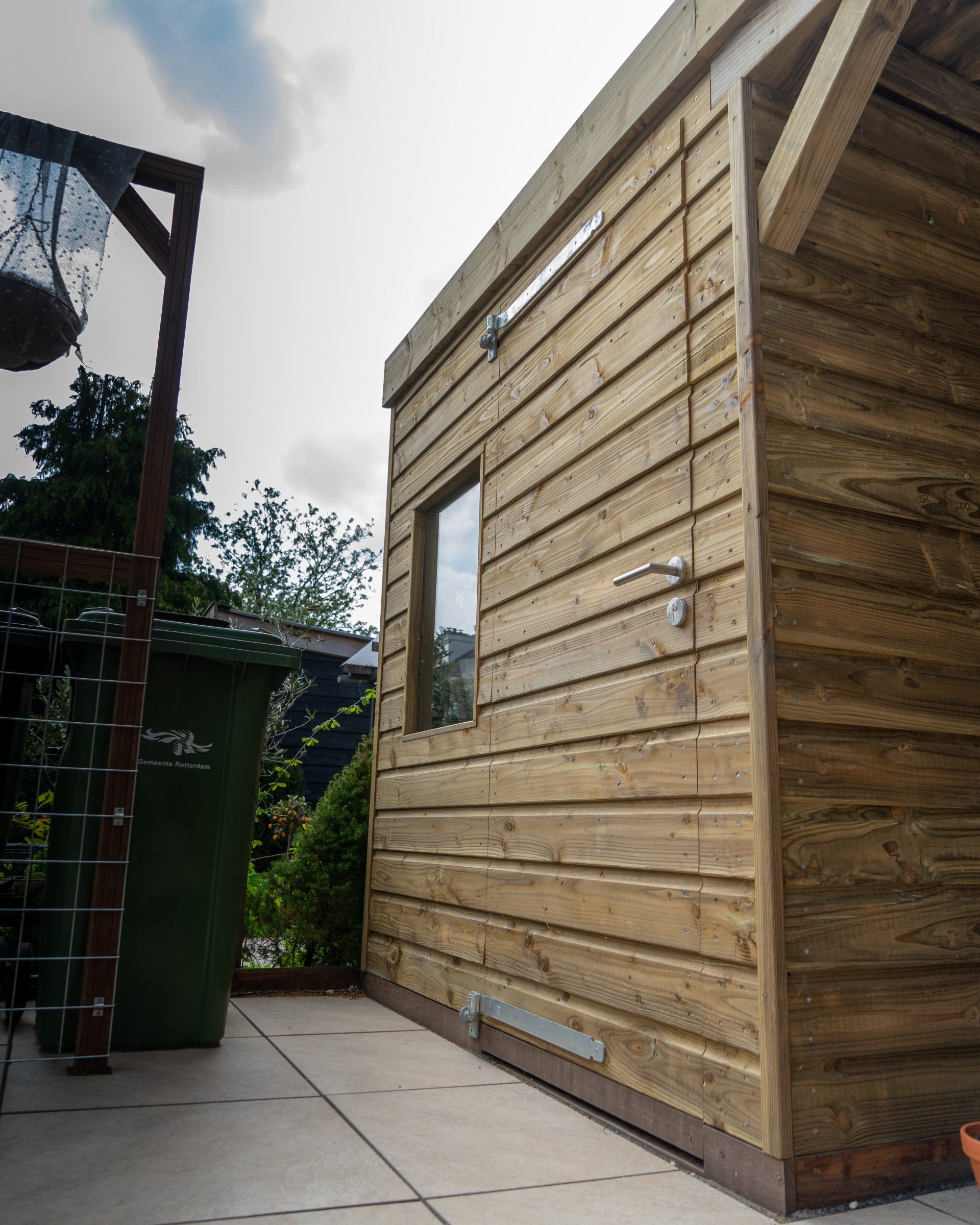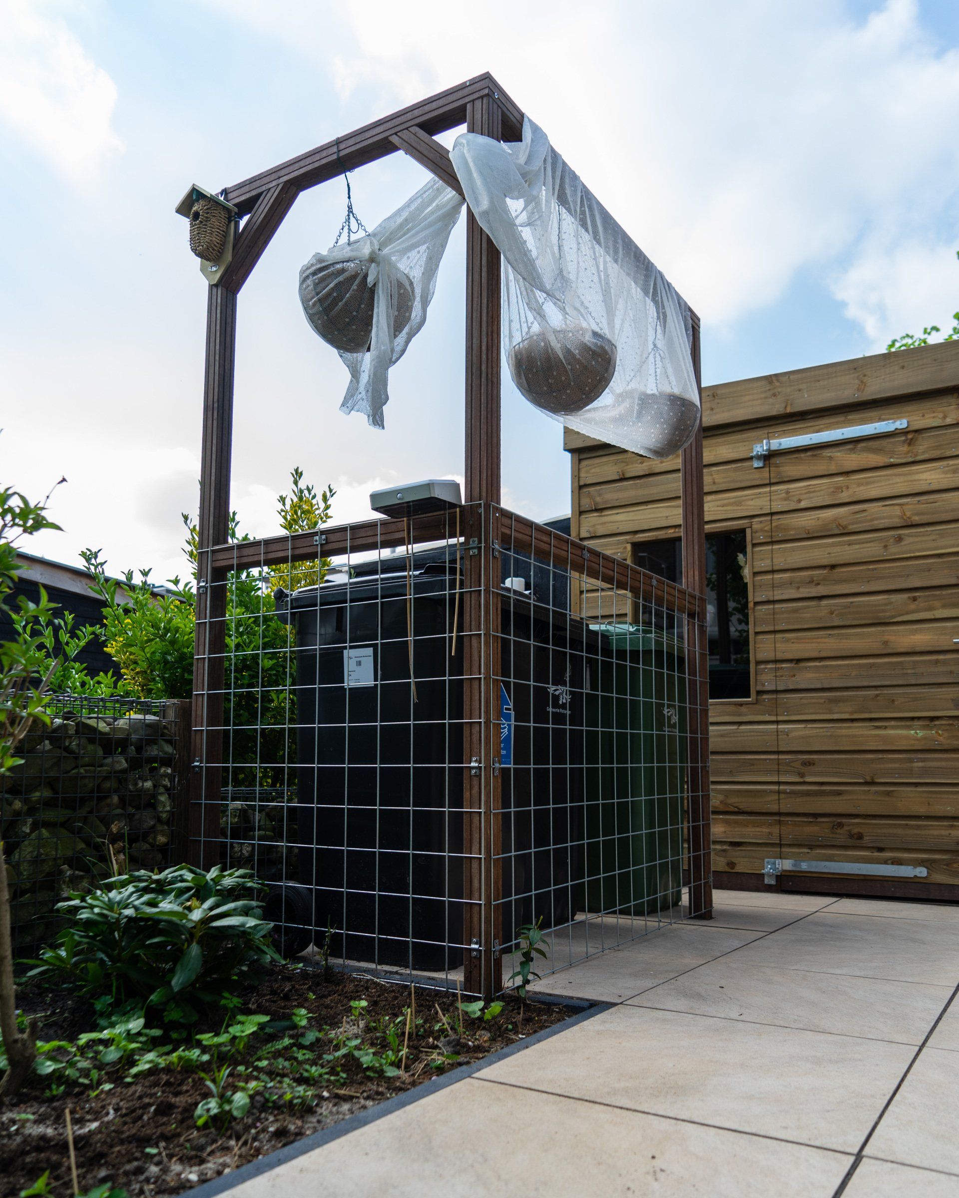 Harhouten constructie/pergola voor het opbergen van de kliko's.
