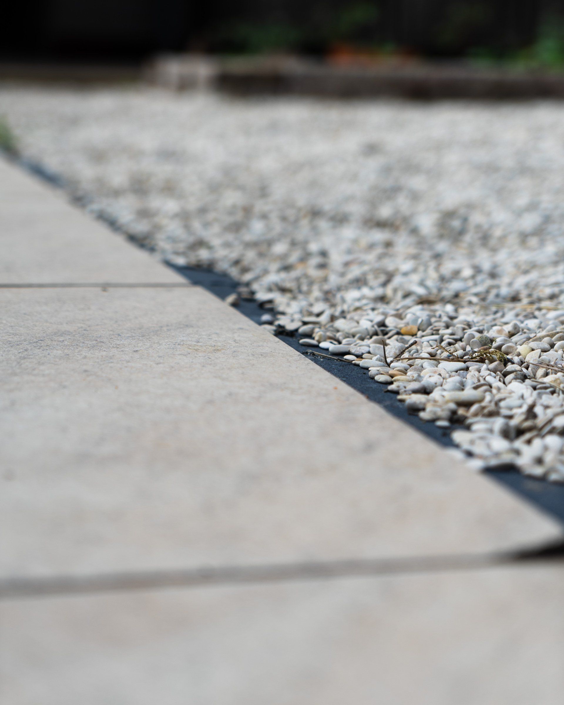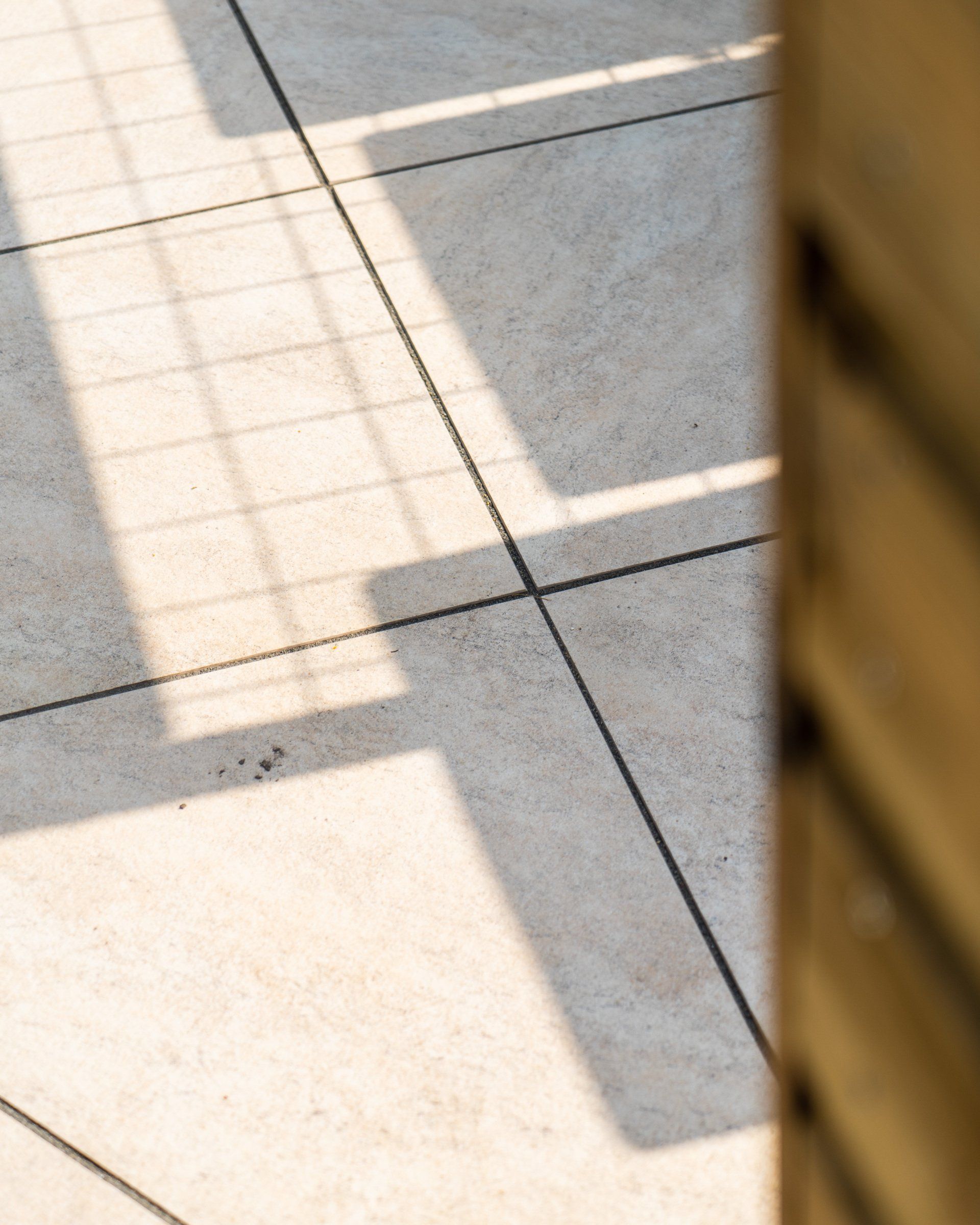 Keramieke tegels, gevoegd gelegd dus geen onkruid tussen de tegels.
