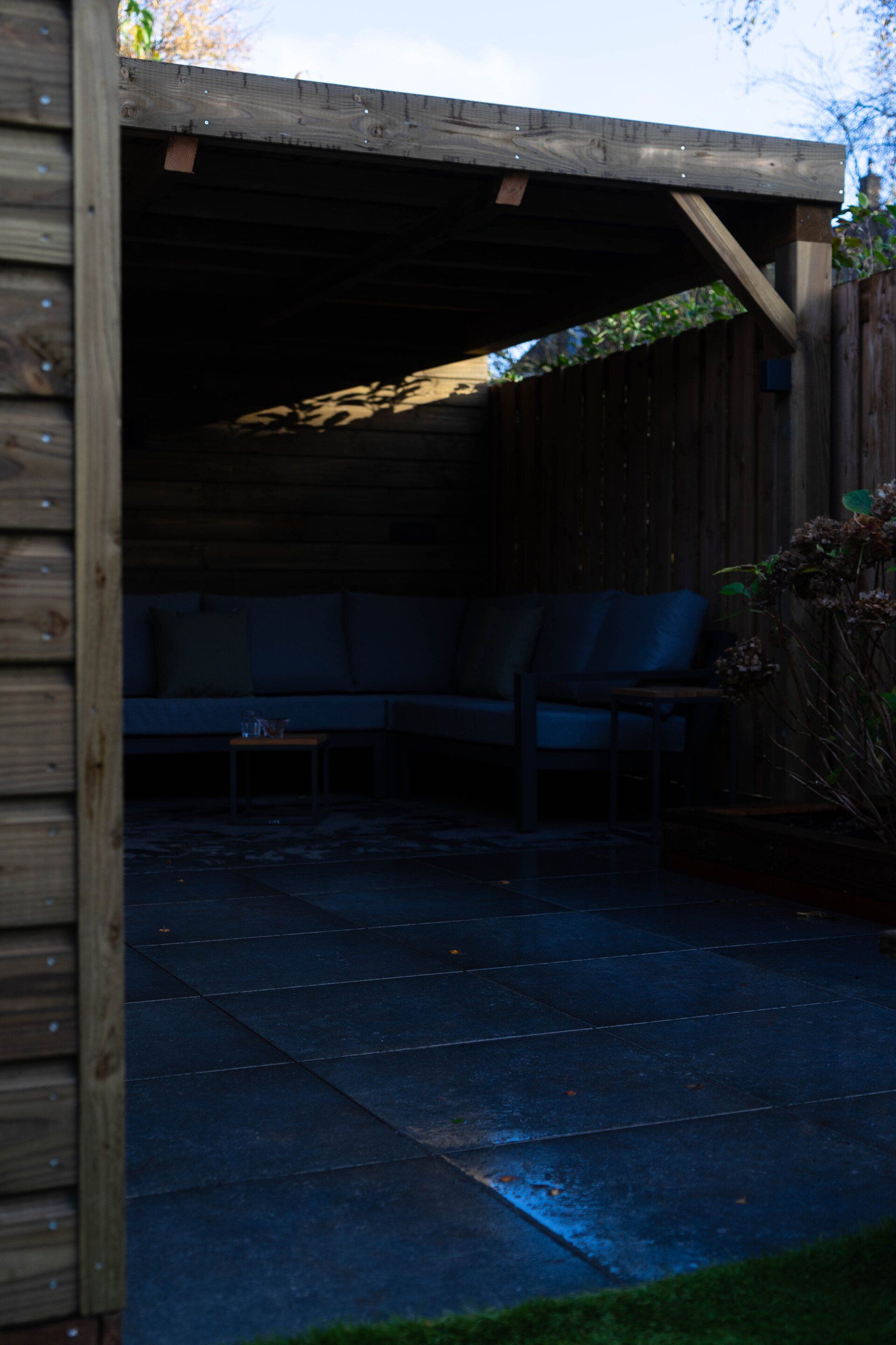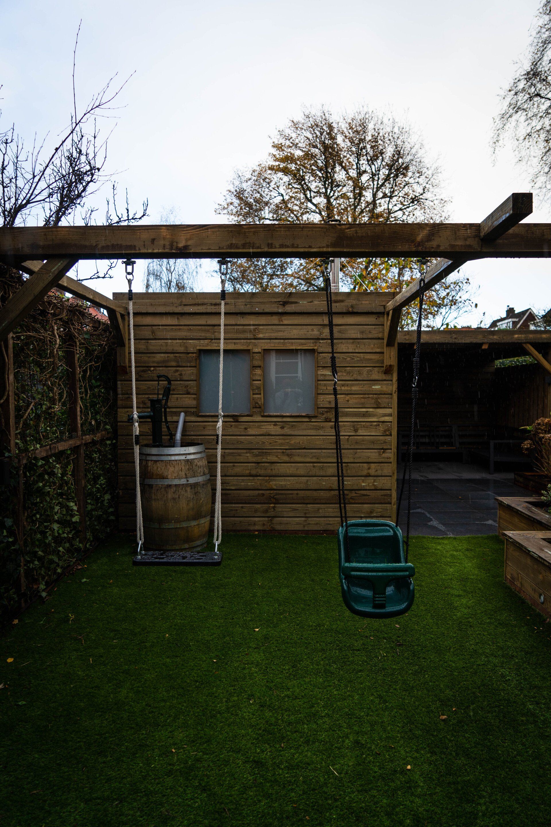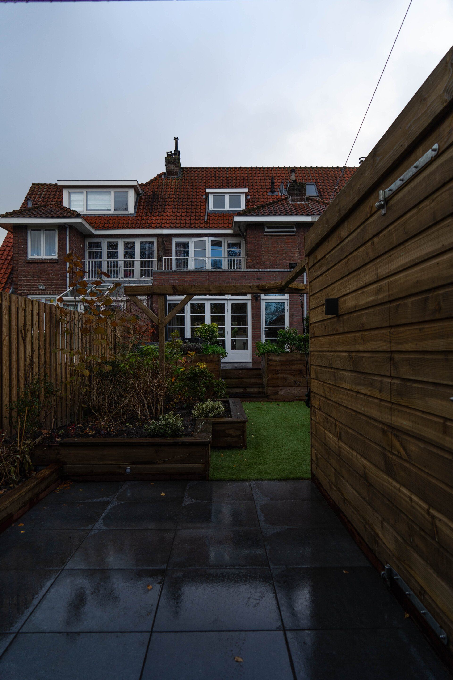 Stap 3 de voortuin (klik hier voor de foto's) En tot slot stap 4: de overkapping, schuur, pergola en verhoogde borders, alles gemaakt van douglashout. Tevens is er een prachtige robuuste houtkachel met een schoorsteen geplaatst. Verlichting en stopcontacten, zowel in als buiten de overkapping/schuur aangelegd . Vanuit het duurzaam aspect is het dak geheel bedekt met sedum (waarvoor een gemeentelijke subsidie voor aangevraagd kan worden). Voor het overtollig hemelwater is een regenton op de afvoer aangesloten. De bestrating is keramiek en kunstgras (waterdoorlatend). Kortom een prachtig compleet aangelegde tuin!