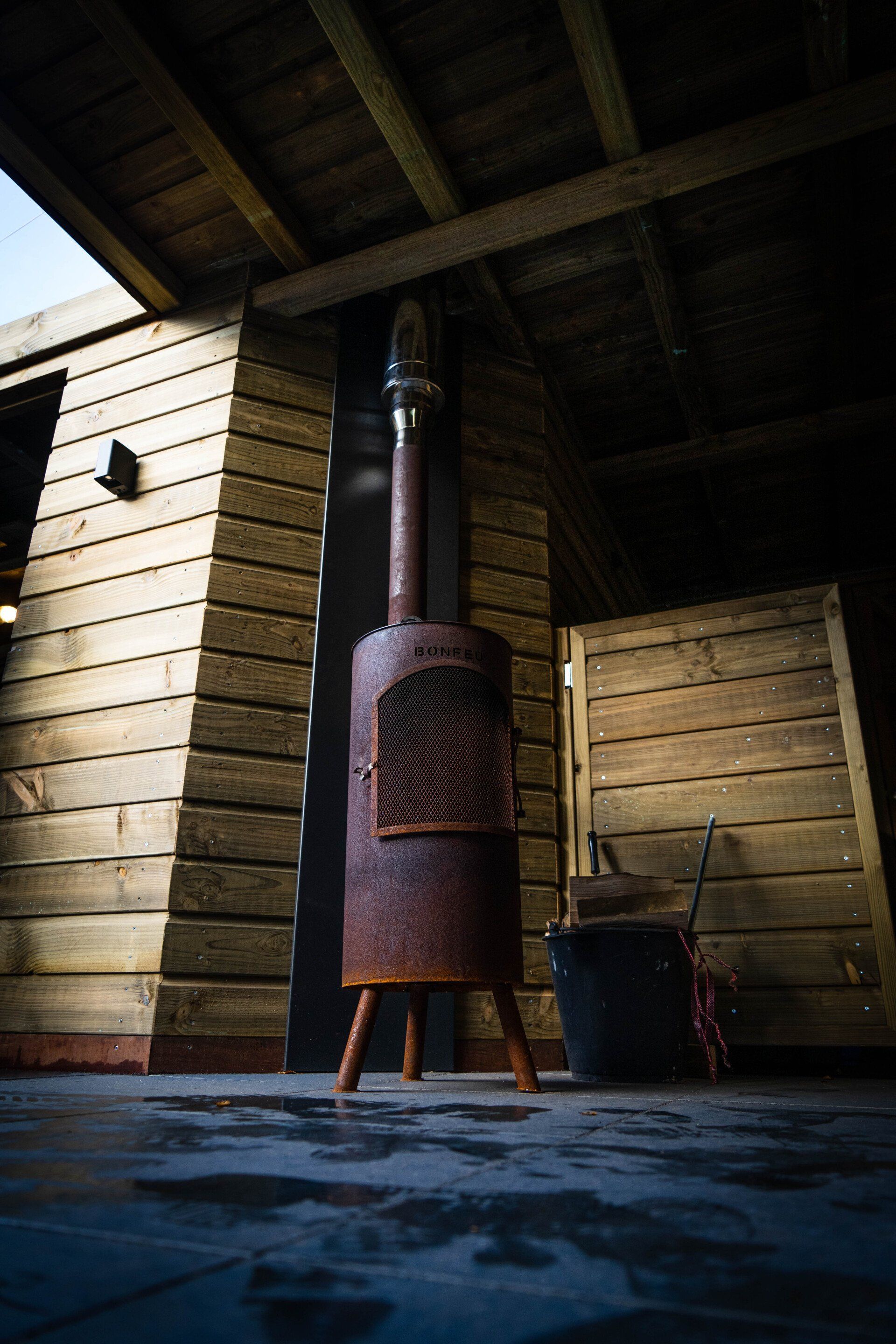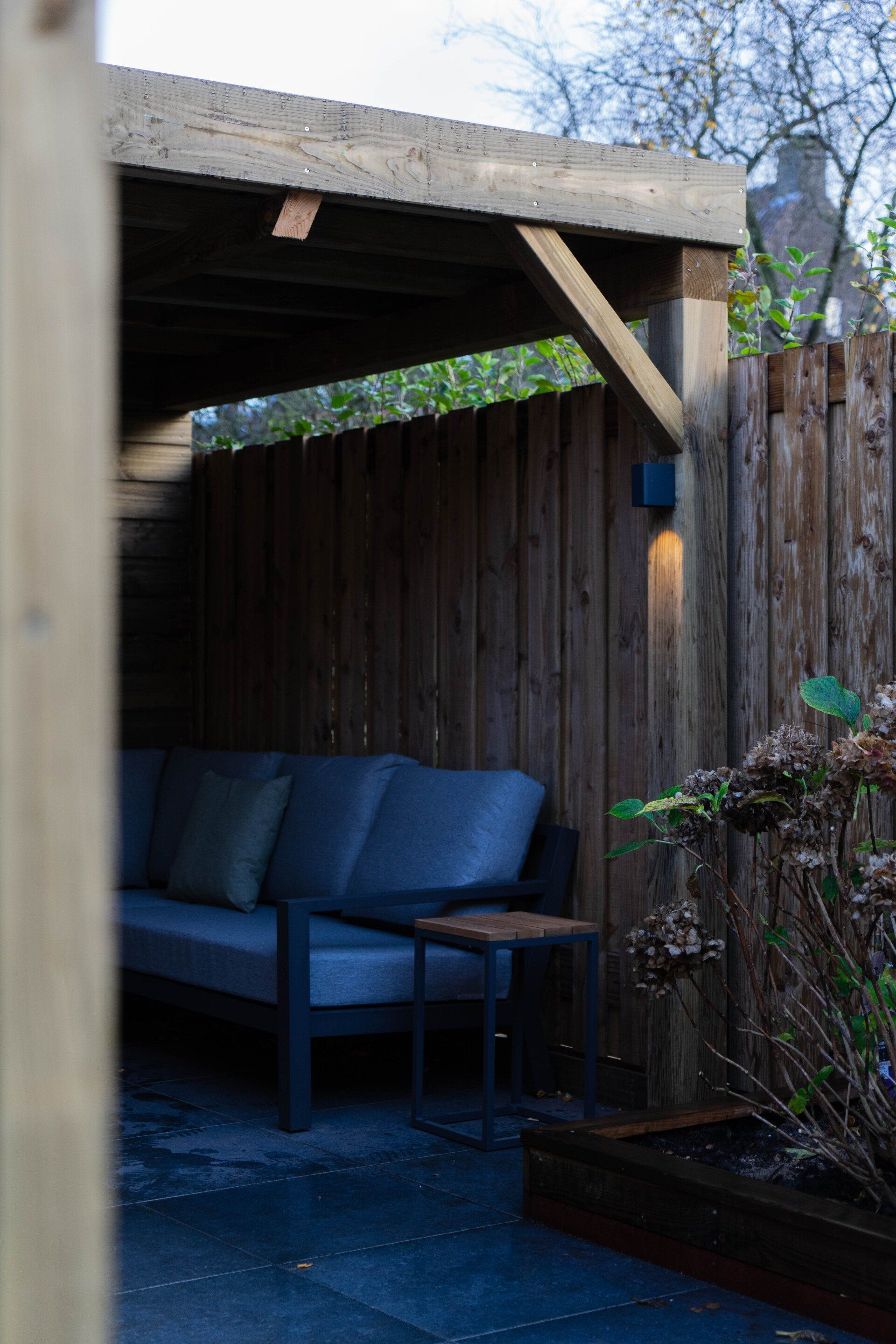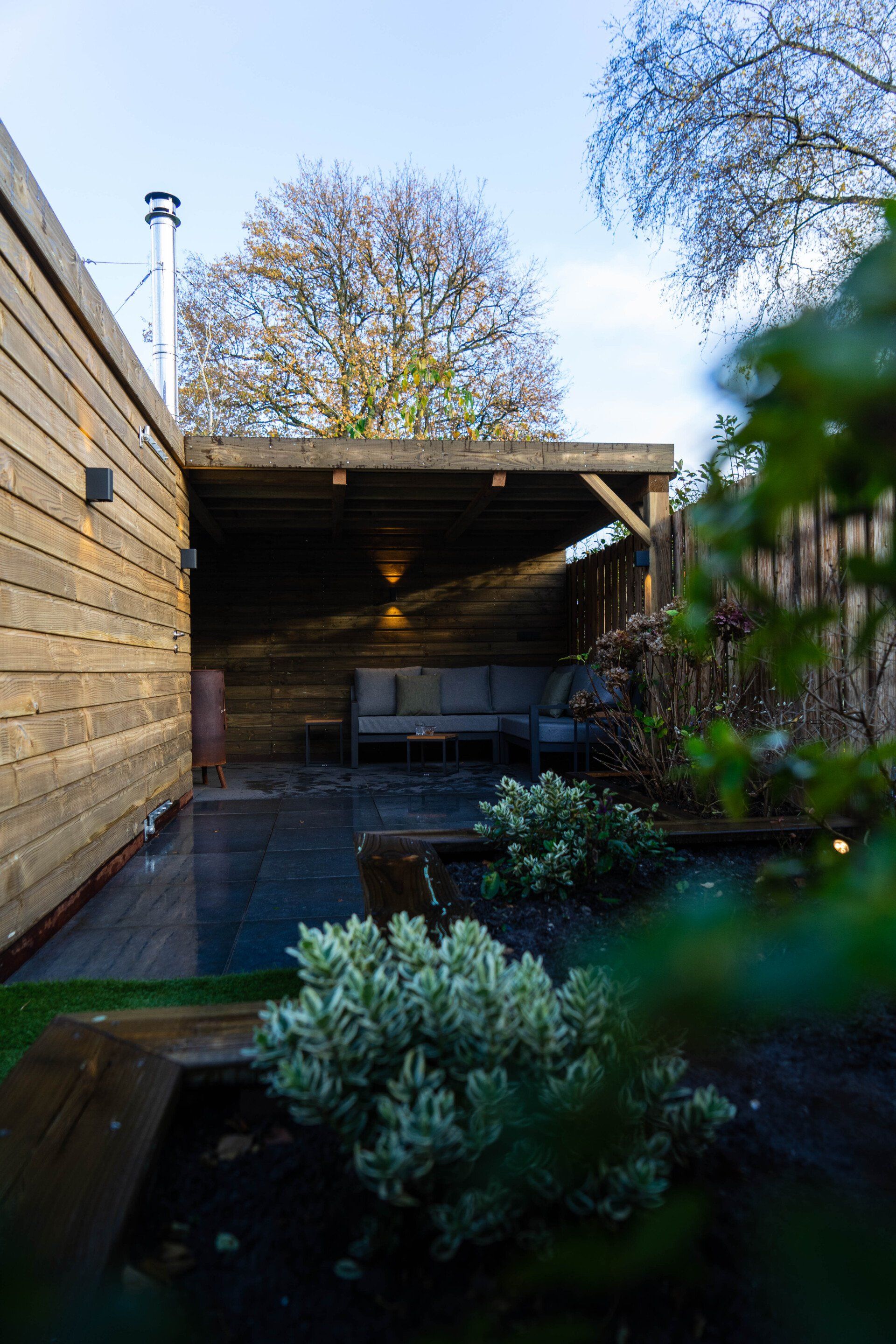 Stap 3 de voortuin (klik hier voor de foto's) En tot slot stap 4: de overkapping, schuur, pergola en verhoogde borders, alles gemaakt van douglashout. Tevens is er een prachtige robuuste houtkachel met een schoorsteen geplaatst. Verlichting en stopcontacten, zowel in als buiten de overkapping/schuur aangelegd . Vanuit het duurzaam aspect is het dak geheel bedekt met sedum (waarvoor een gemeentelijke subsidie voor aangevraagd kan worden). Voor het overtollig hemelwater is een regenton op de afvoer aangesloten. De bestrating is keramiek en kunstgras (waterdoorlatend). Kortom een prachtig compleet aangelegde tuin!