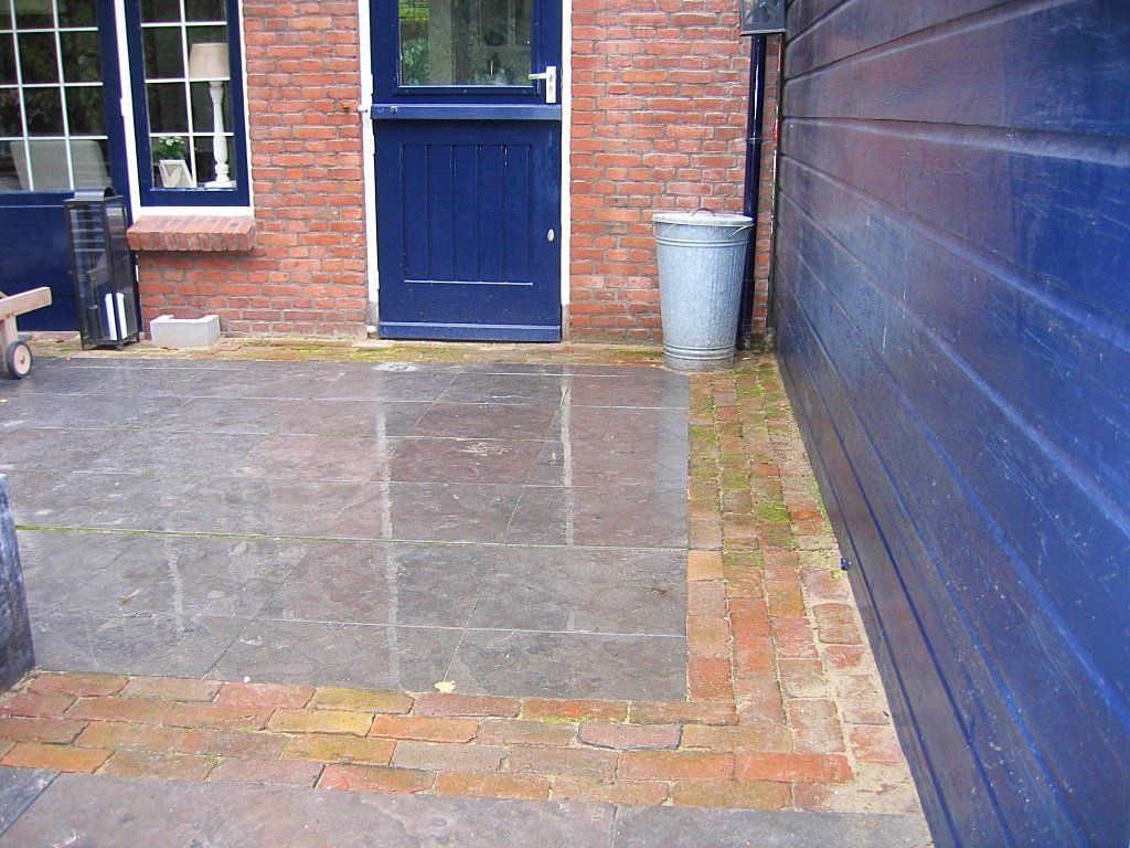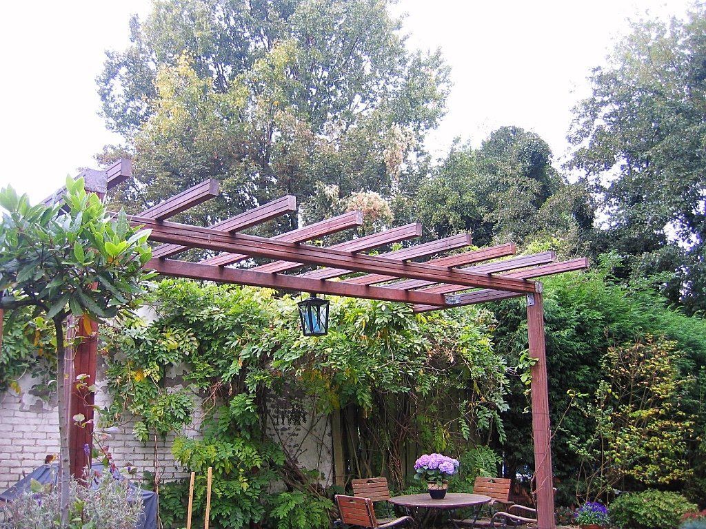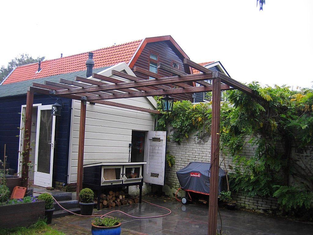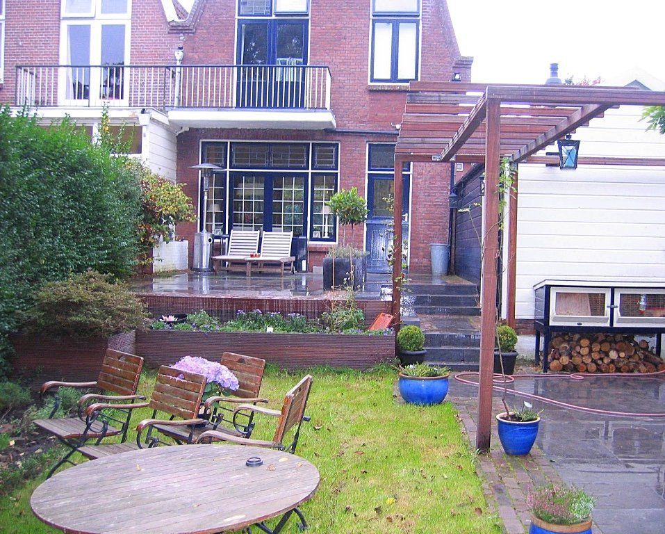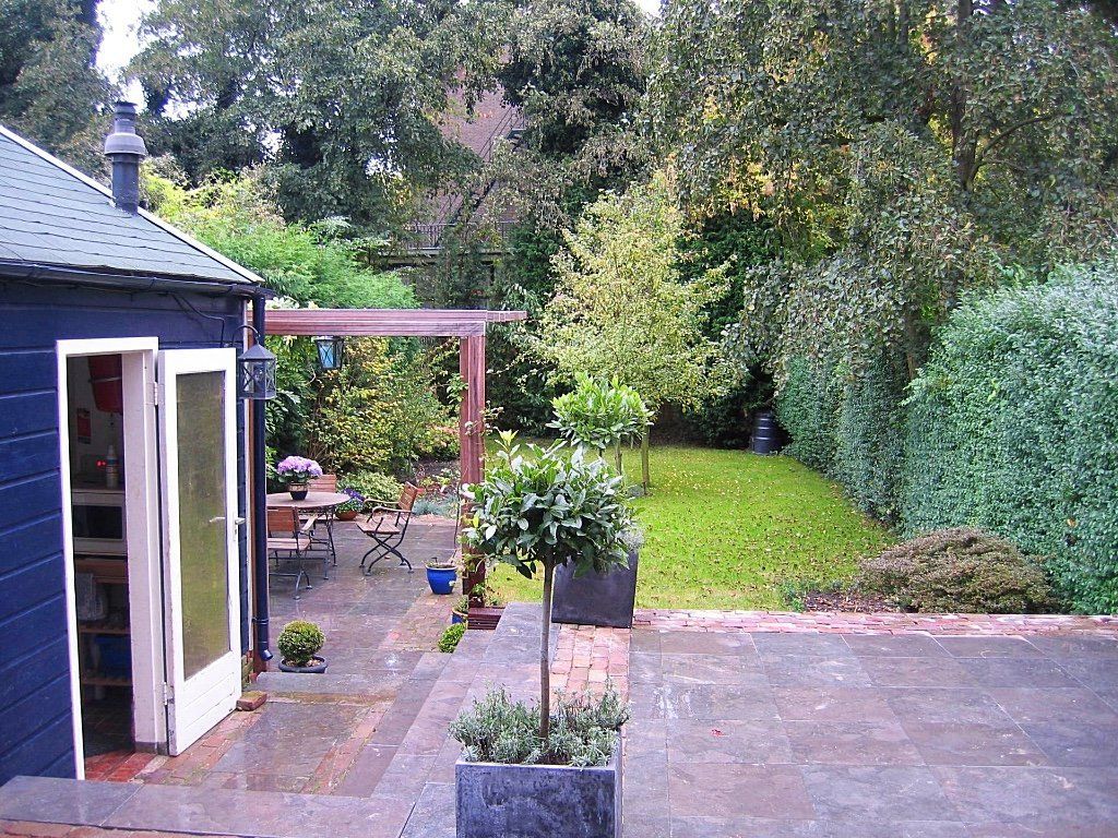 Bij deze sfeervolle tuin is qua inrichting en beplanting bijna niks aangepast. De bestrating is vervangen in mooi natuursteen met rode waaltjes. Niet alleen bij het terras aan het huis maar ook de trapjes zijn van natuursteen. Ook bij het terras onder de zelfbouw hardhouten pergola is natuursteen gebruikt. Door deze mooie natuurlijke bestrating is een sfeervolle natuurlijke uitstraling gecreëerd.