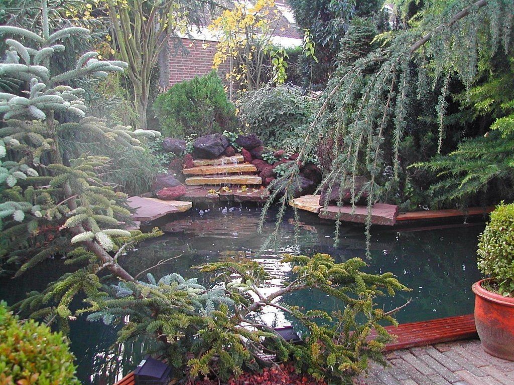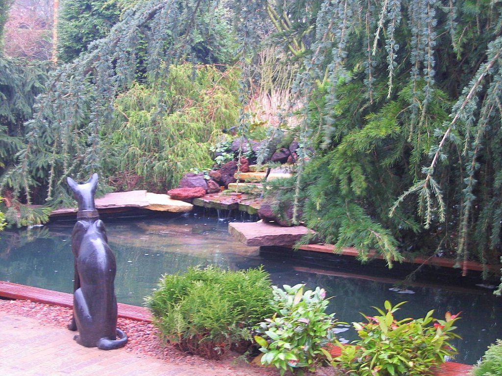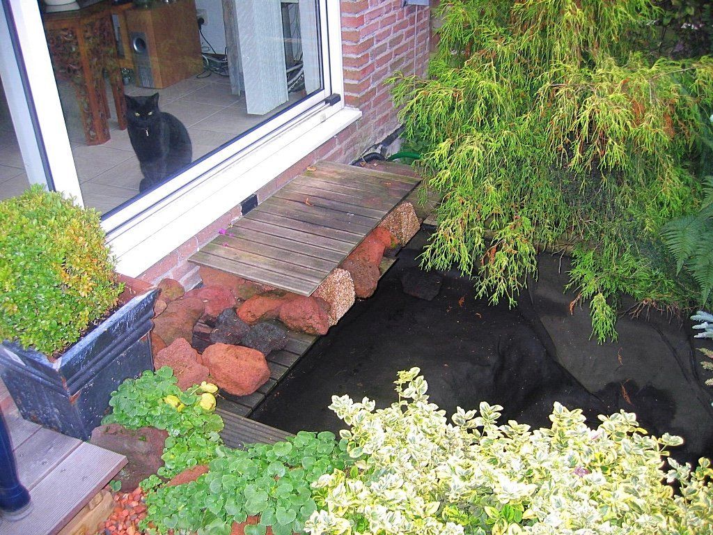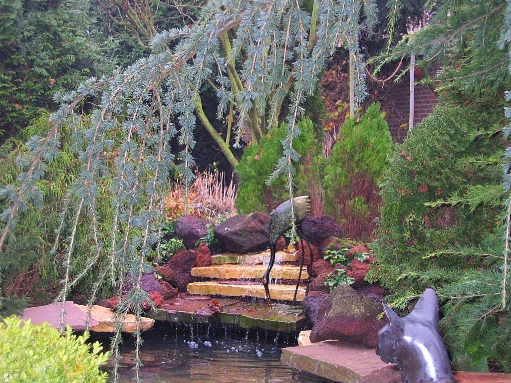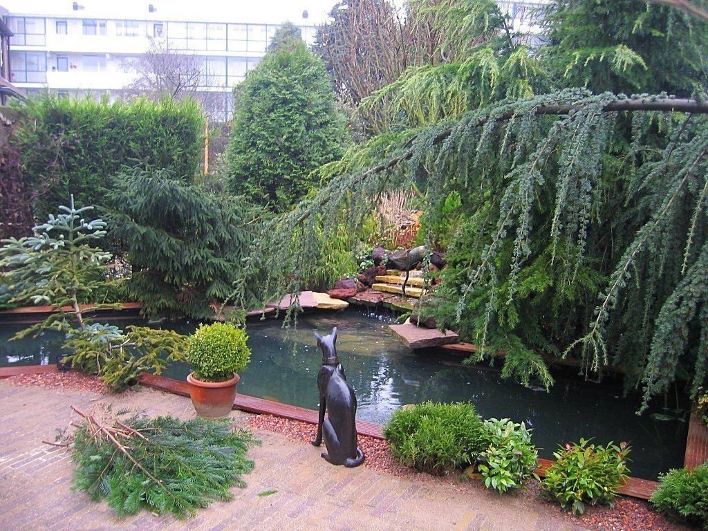 Prachtige vijver aan het huis. Dat met de vele mooie wintergroene beplanting eromheen, zowel in de zomer als in de winter een prachtige aanwinst is.