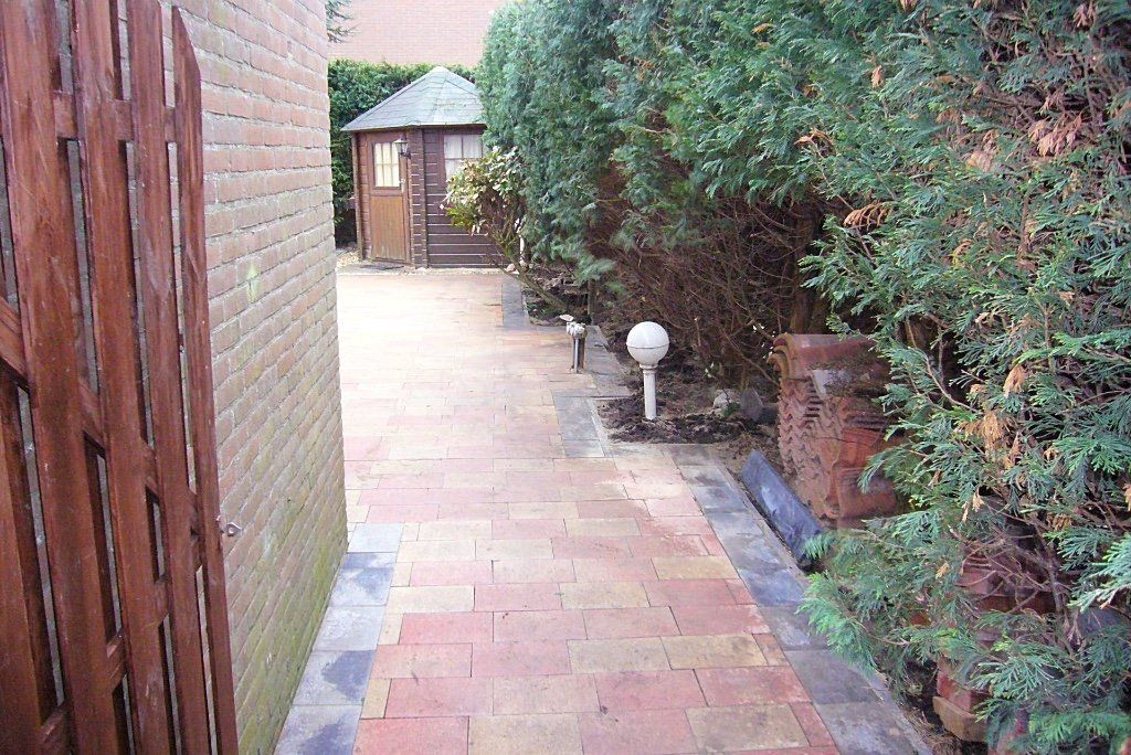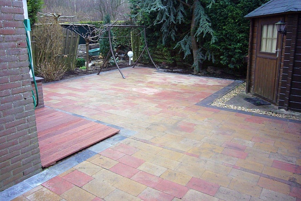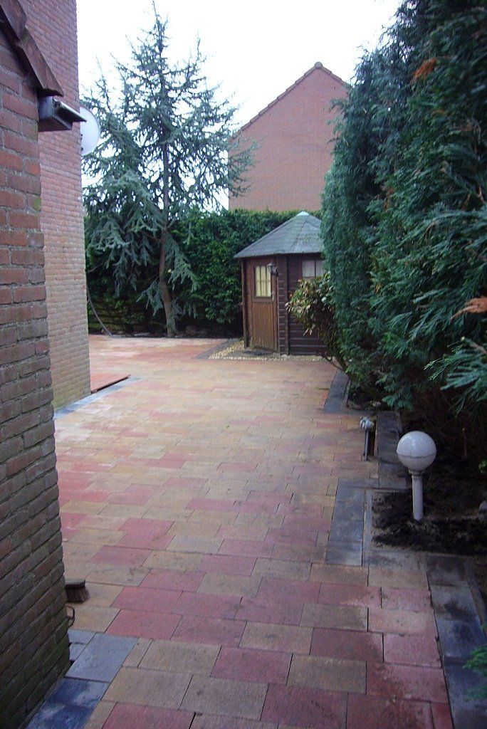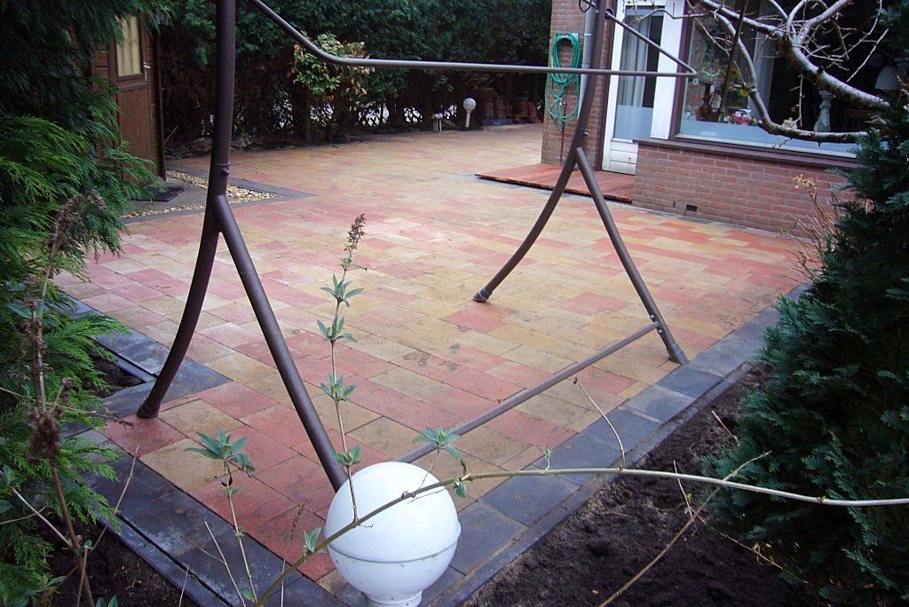 Een strakke voor,-zij,- en achtertuin met een kader van antraciete bestrating. Hardhouten deksel voor waterafvoer.