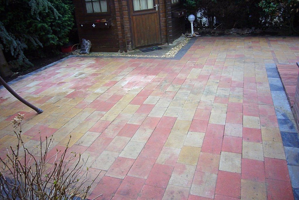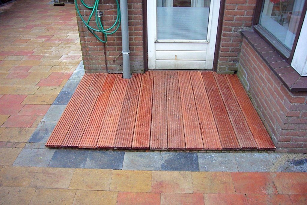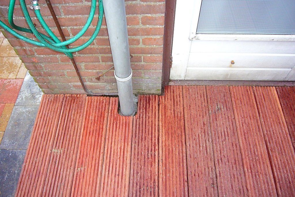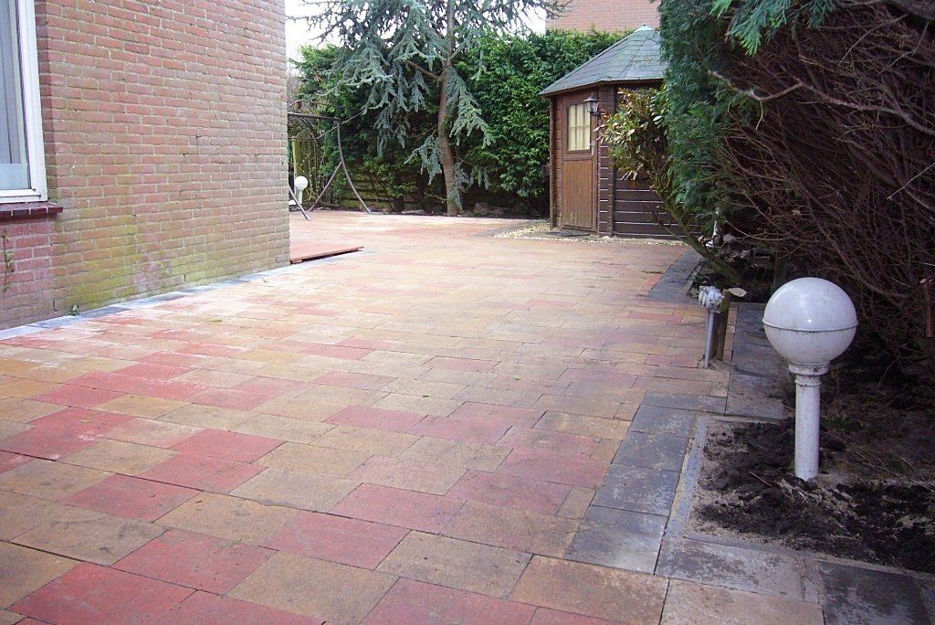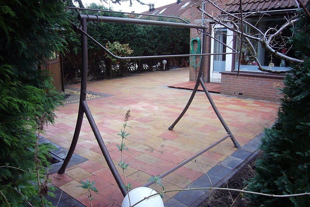 Een strakke voor,-zij,- en achtertuin met een kader van antraciete bestrating. Hardhouten deksel voor waterafvoer.