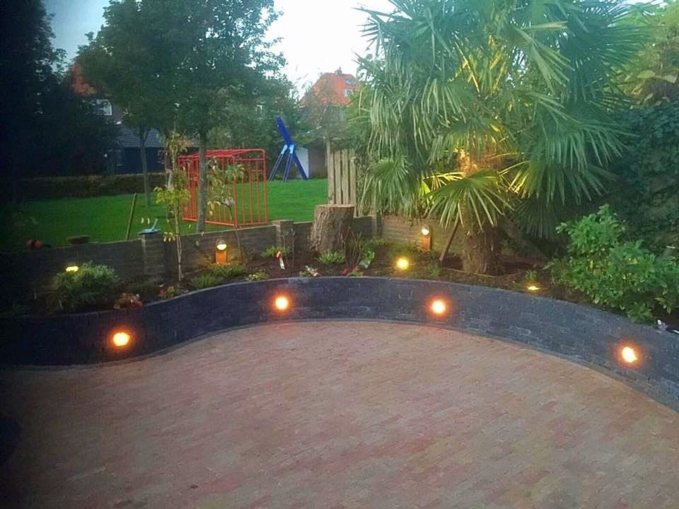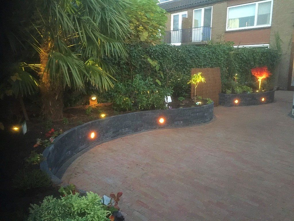 's avonds ook van de tuin te genieten hebben we sfeervolle verlichting gebruikt, zowel in de muurtjes alsmede spotjes om mooie beplanting te verlichten.