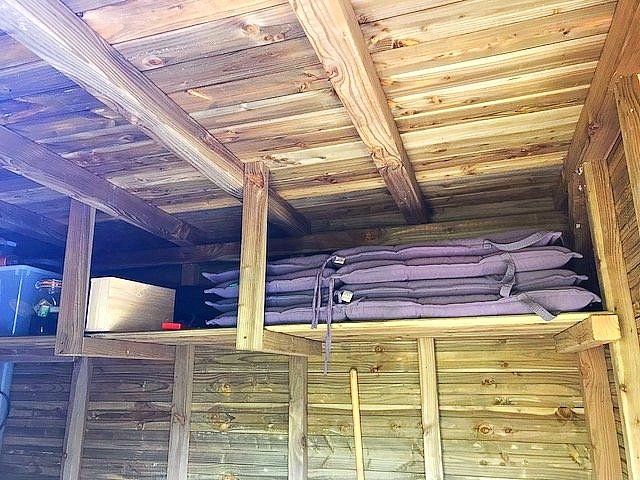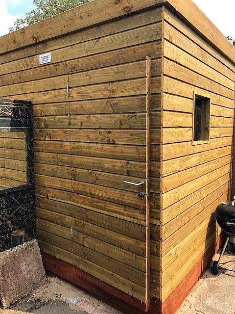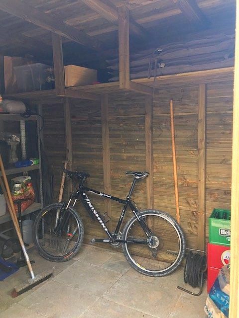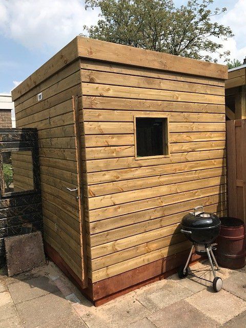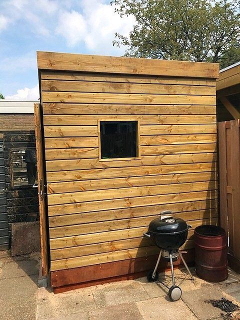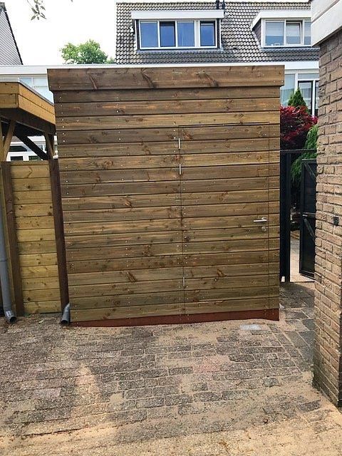 Deze schuur van rabbatdelen, staat op een hardhouten verstelbaar frame. D.m.v stelpoten staat deze schuur te allen tijde waterpas. Door het gebruik van fsc gecertificeerd hardhout is een langere levensduur gegarandeerd. De schuur heeft een ontluchtingsrooster, raam, regenpijp en bijna onzichtbare deur. De schuur is ingetimmerd met opbergvakken.