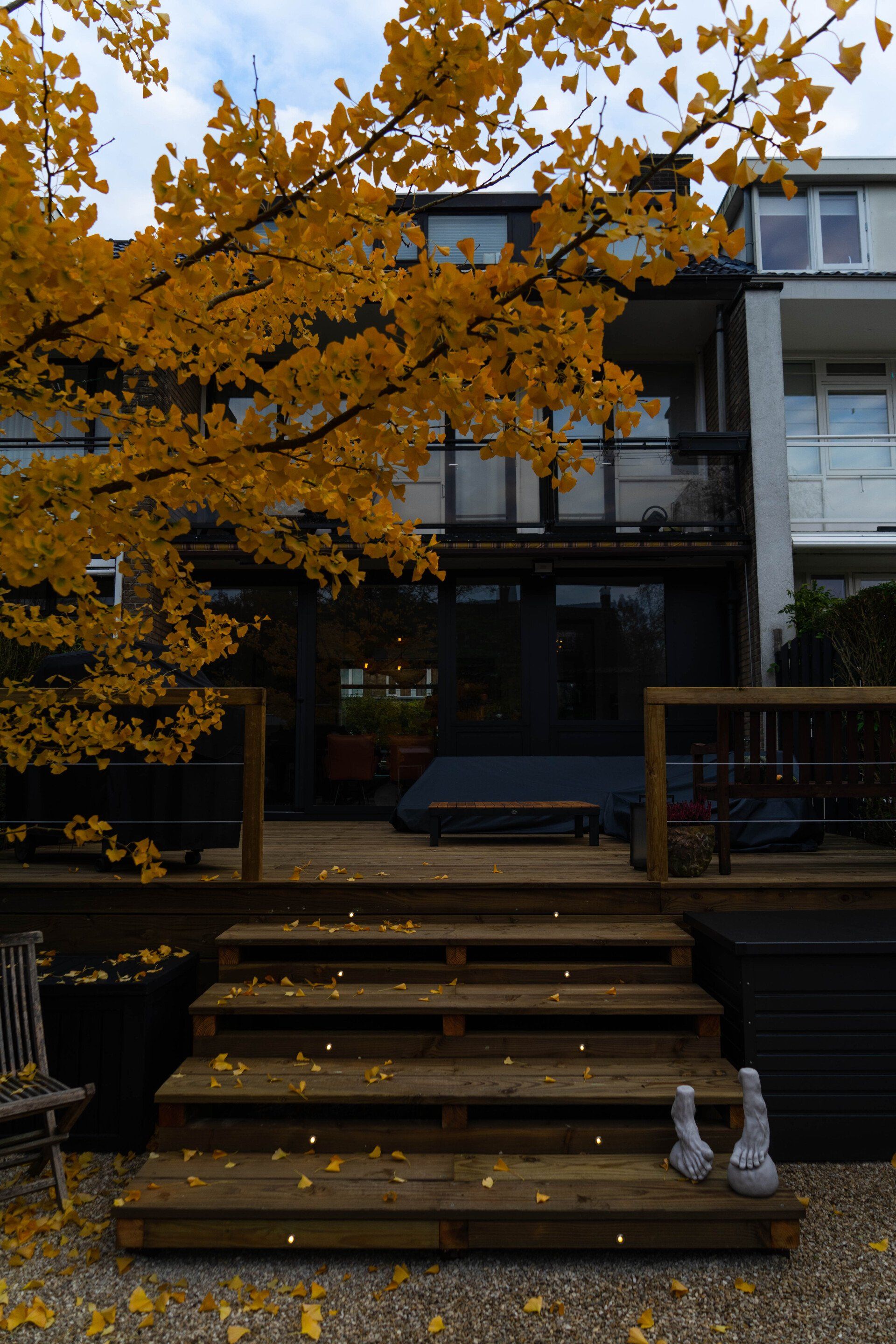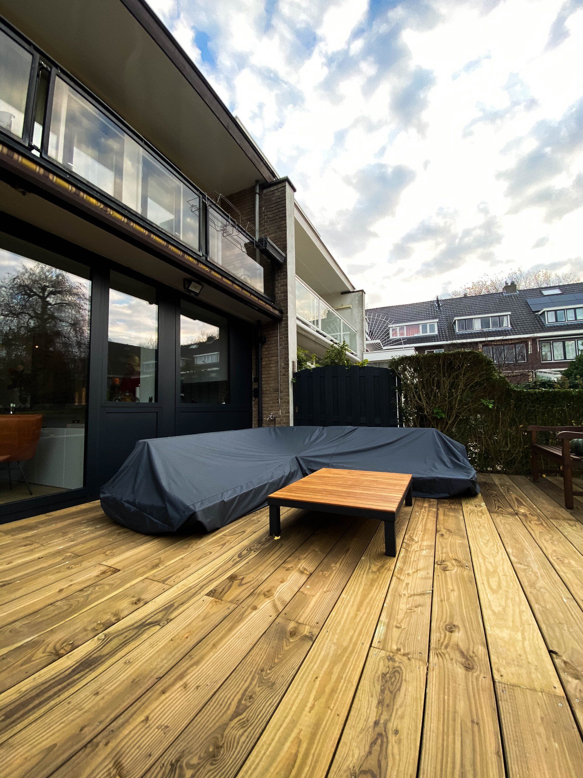 Verhoogde verstelbare douglas houten vlonder met lange trap en verlichting. De vlonder is voorzien van een balustrade van douglas hout en staalkabel. De verdere gehele tuin is voorzien van grind in honingraatmatten.