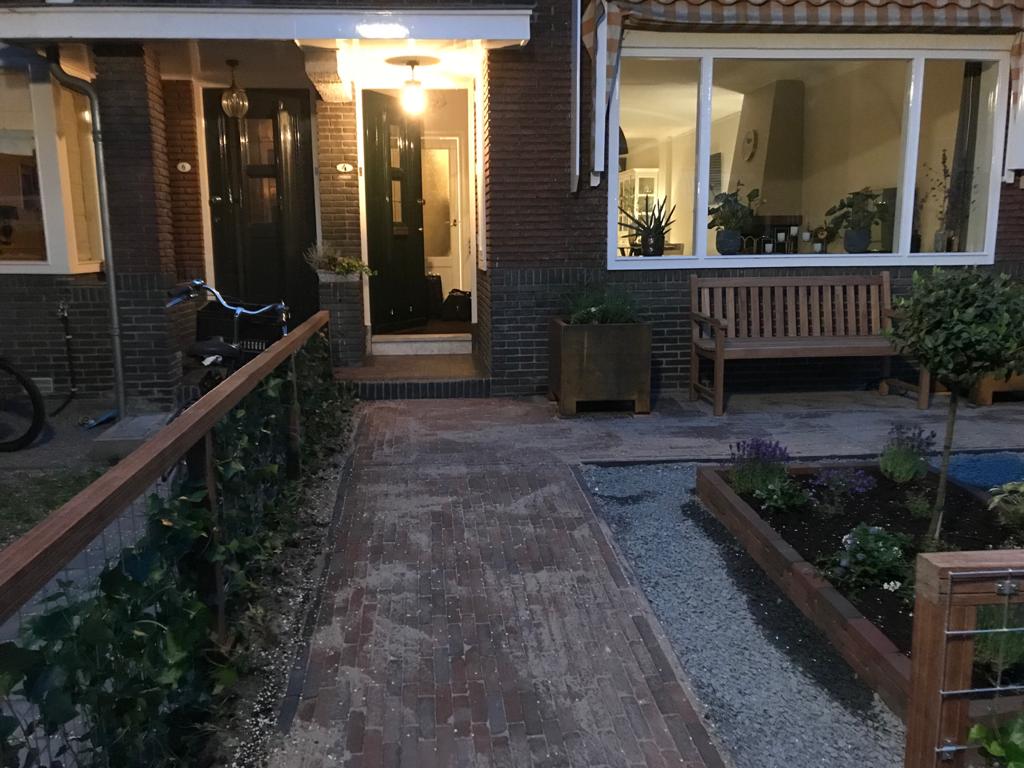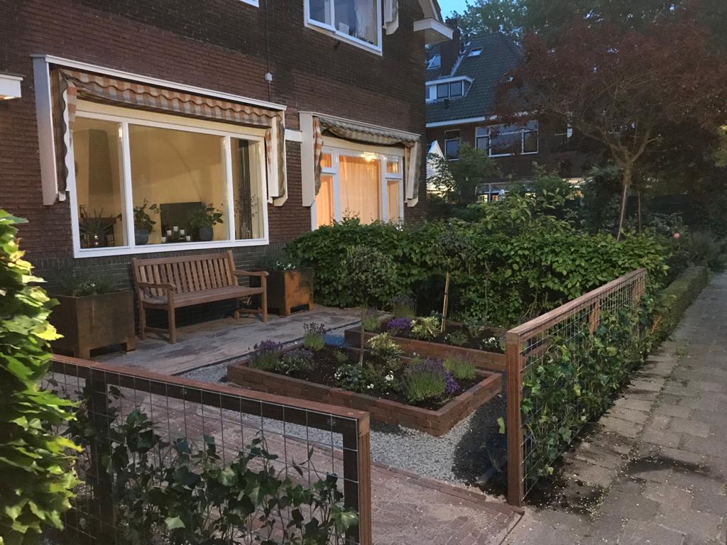 Stijlvolle voortuin met waaltjes en verhoogde borders van waaltjes, daaromheen grind/split. De lage trellis schutting/hek is ingevlochten met hedera. De beplanting maakt het geheel sfeervol af.