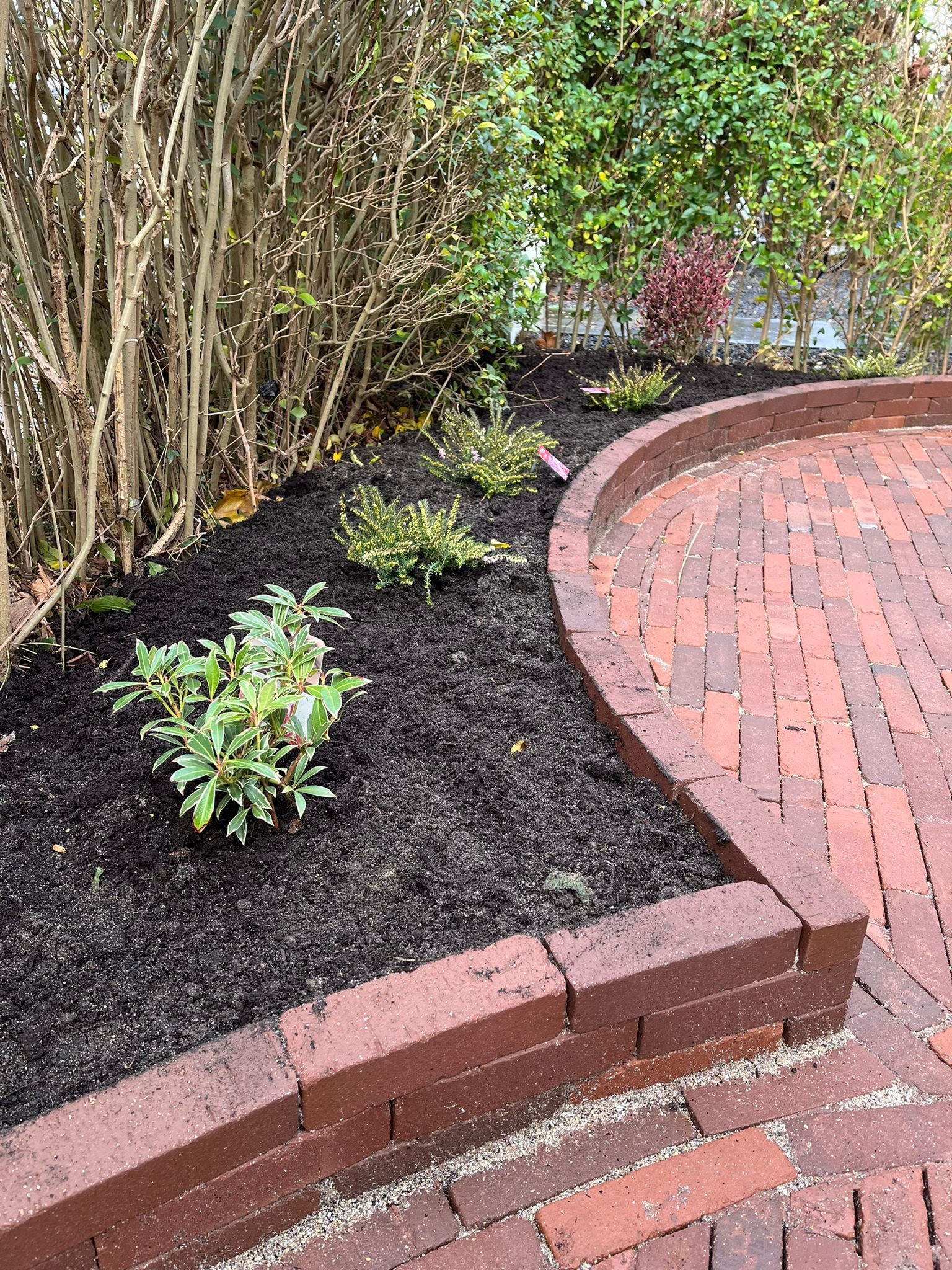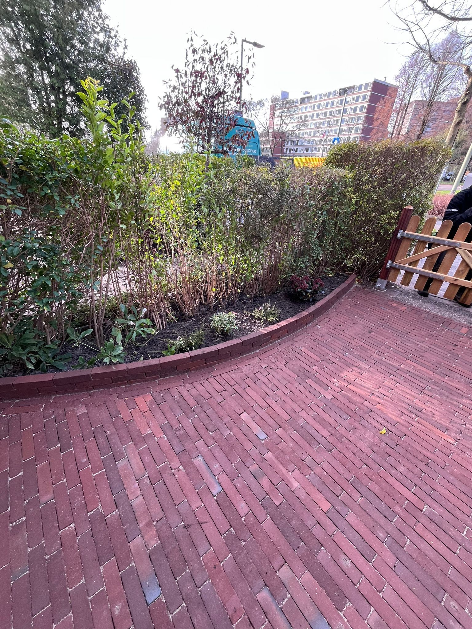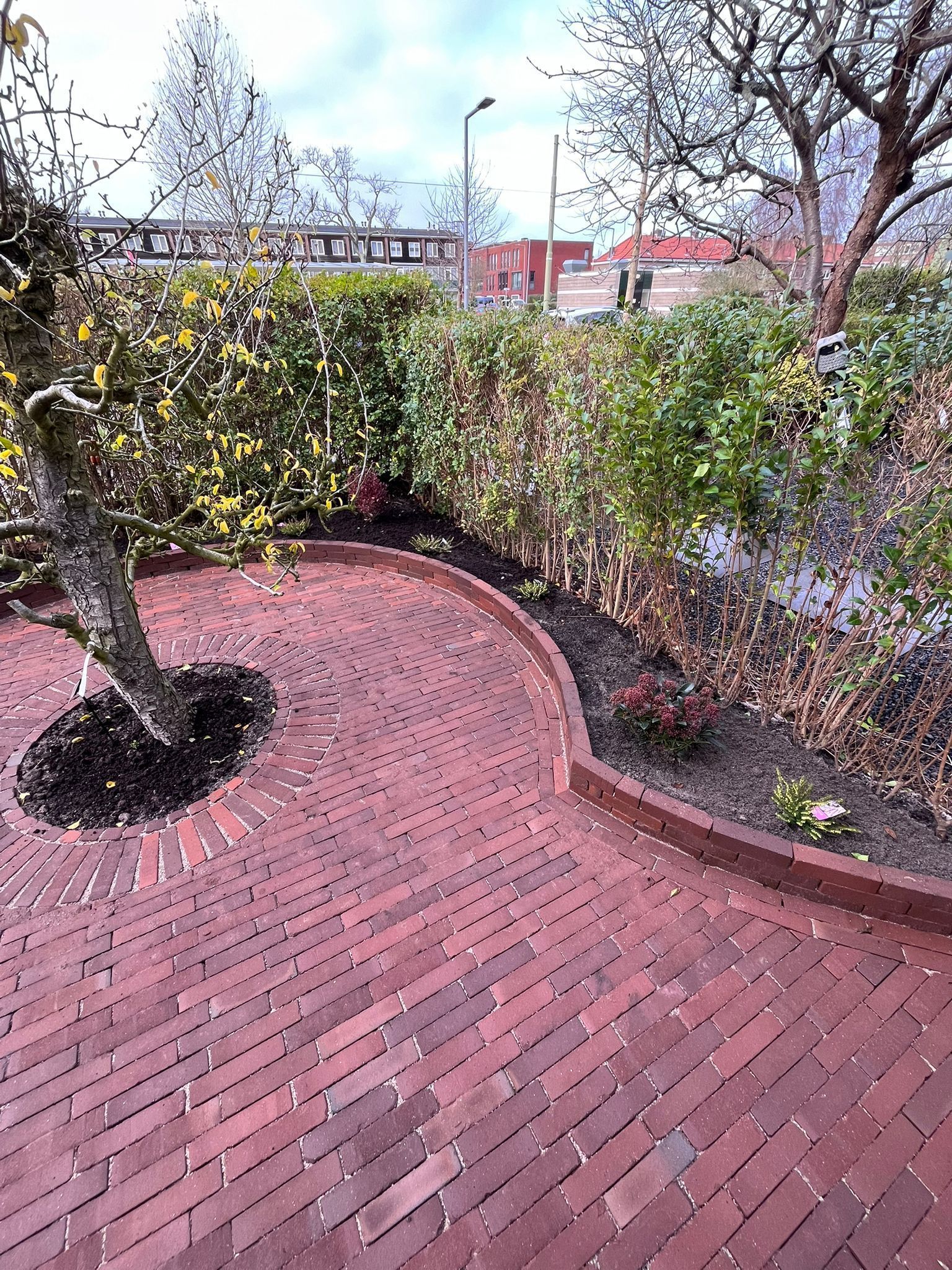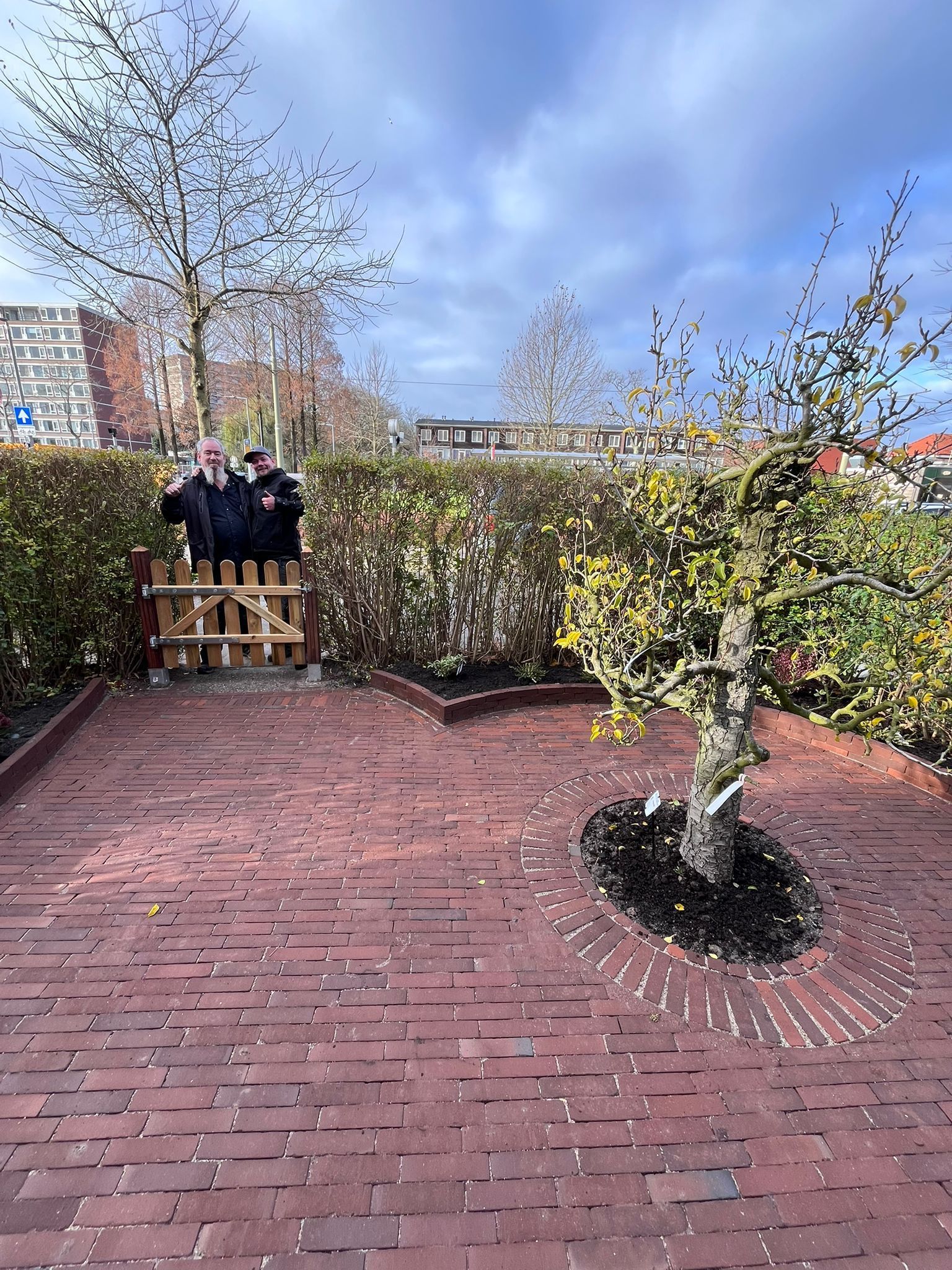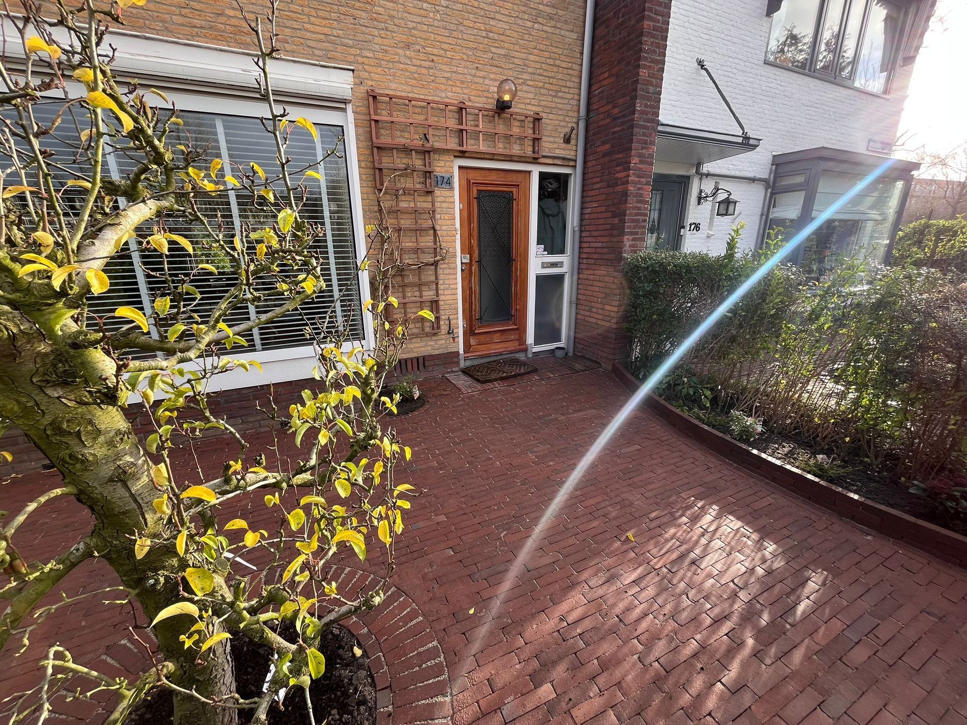 Waaltjes in de voortuin met een prachtige, oude perenboom, vergezeld van een nieuw hekwerk en een zorgvuldig gekozen beplanting die samen een sfeervolle en uitnodigende uitstraling creëren.