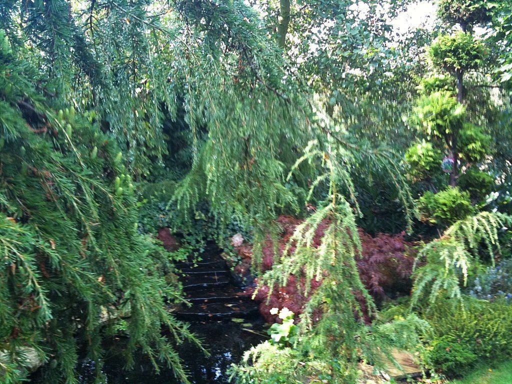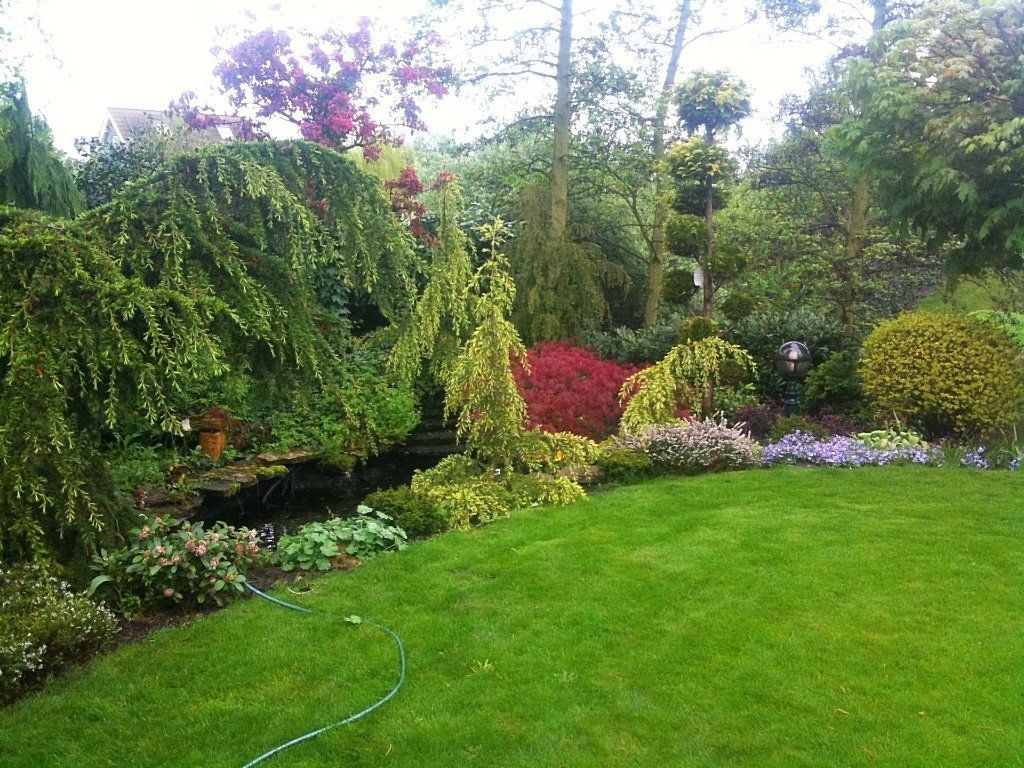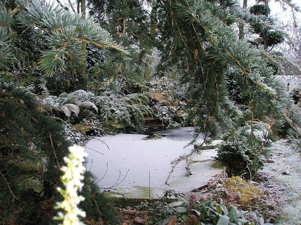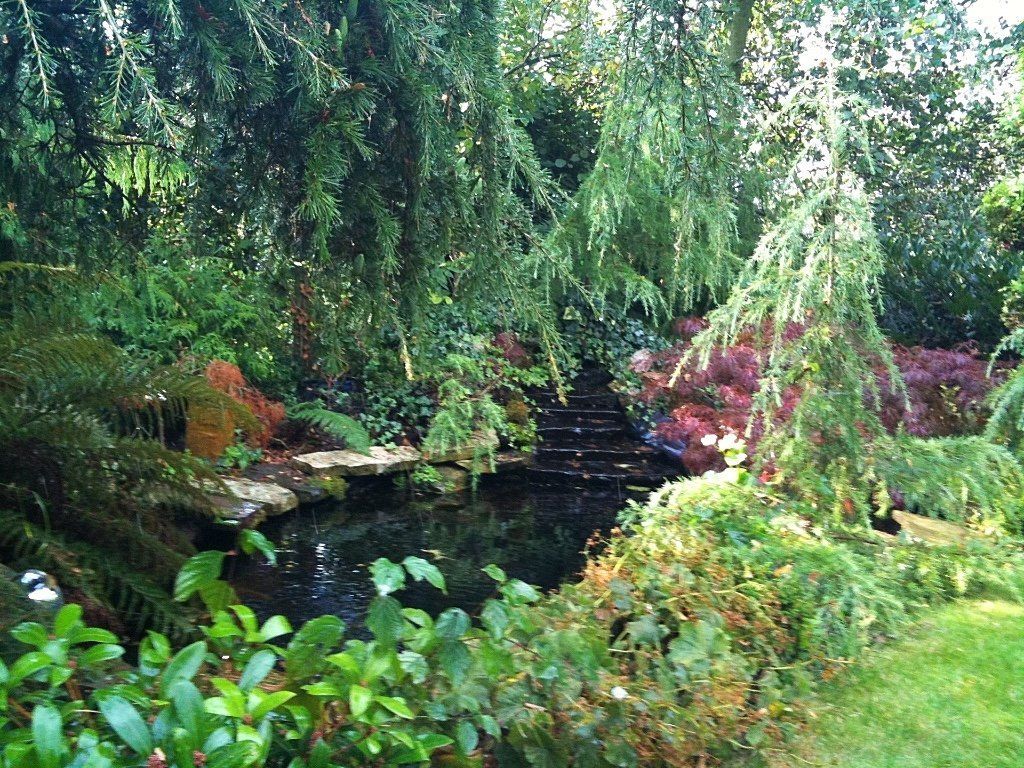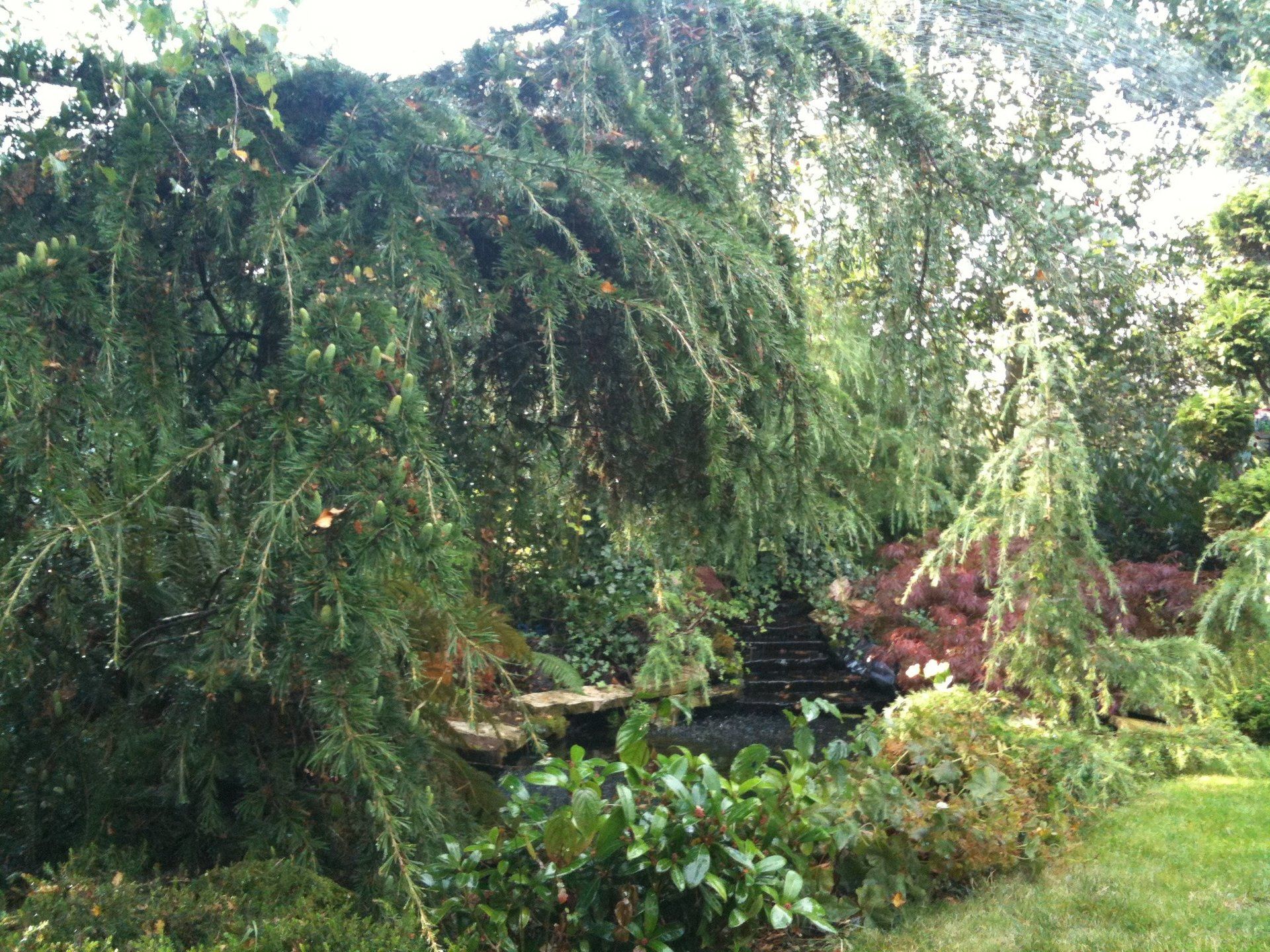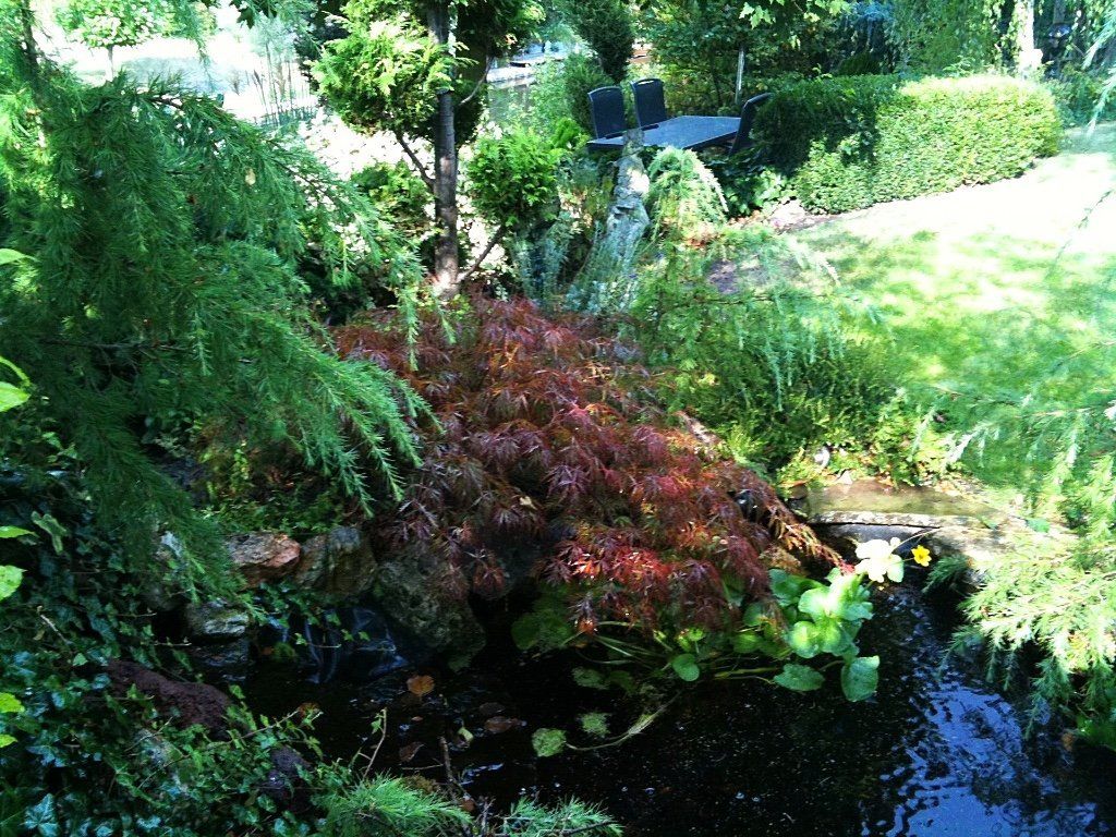 Prachtige vijver met waterval en oude beplanting met overhangende takken! Een lust voor het oog! Ook in de winter!