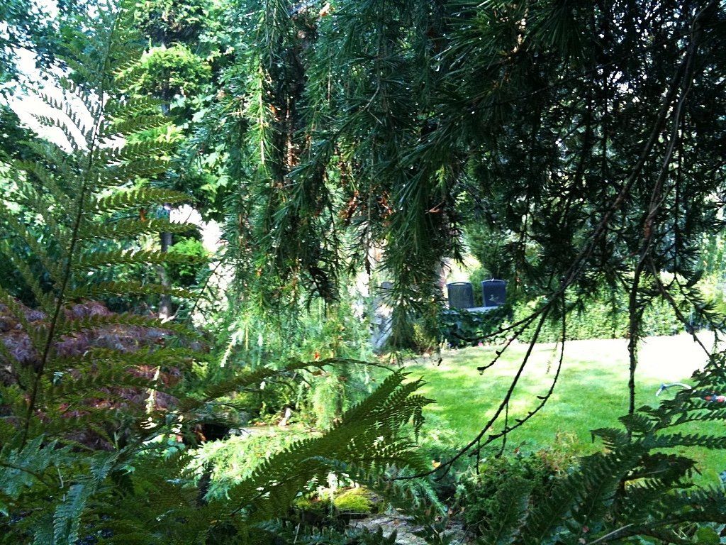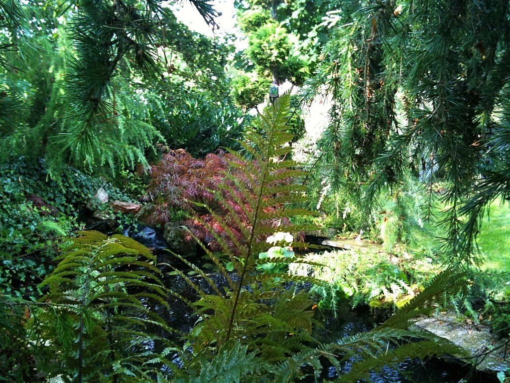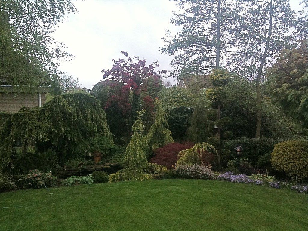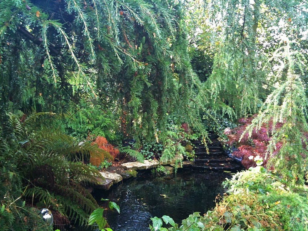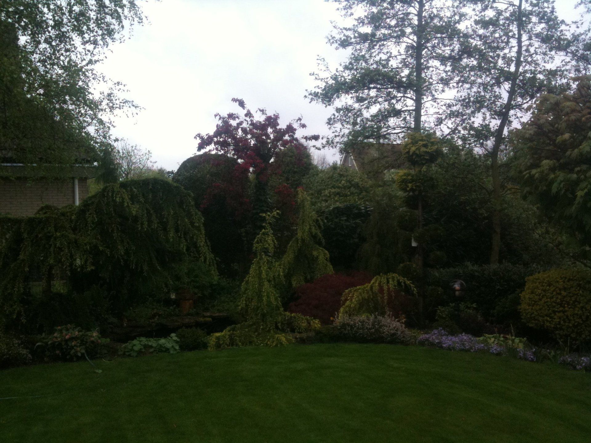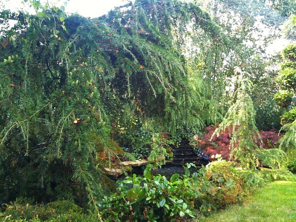Prachtige vijver met waterval en oude beplanting met overhangende takken! Een lust voor het oog! Ook in de winter!